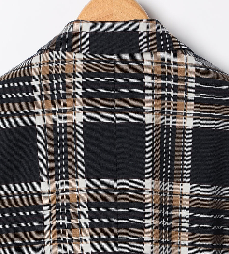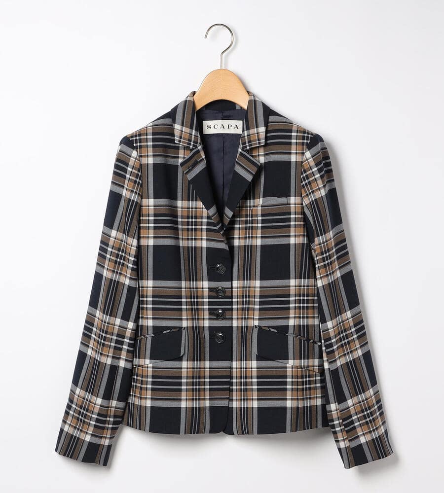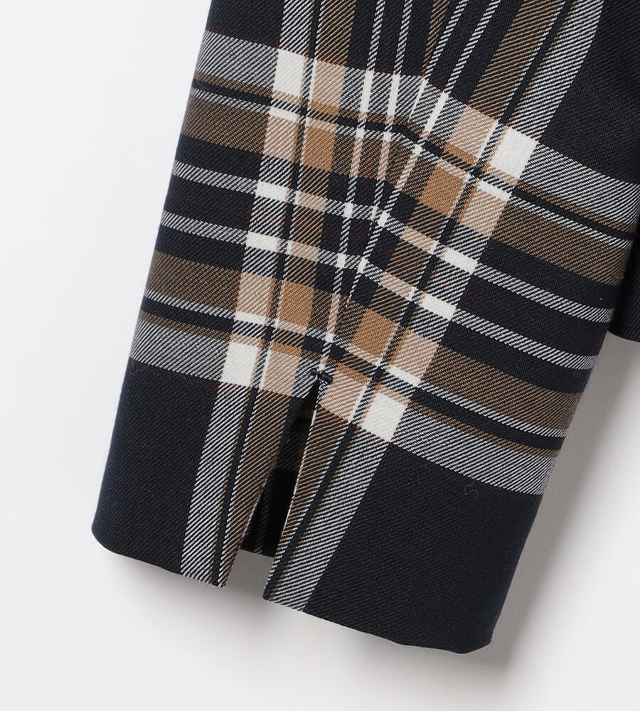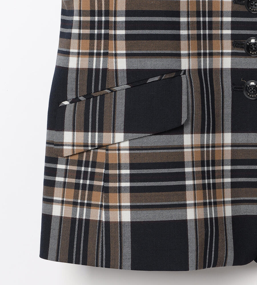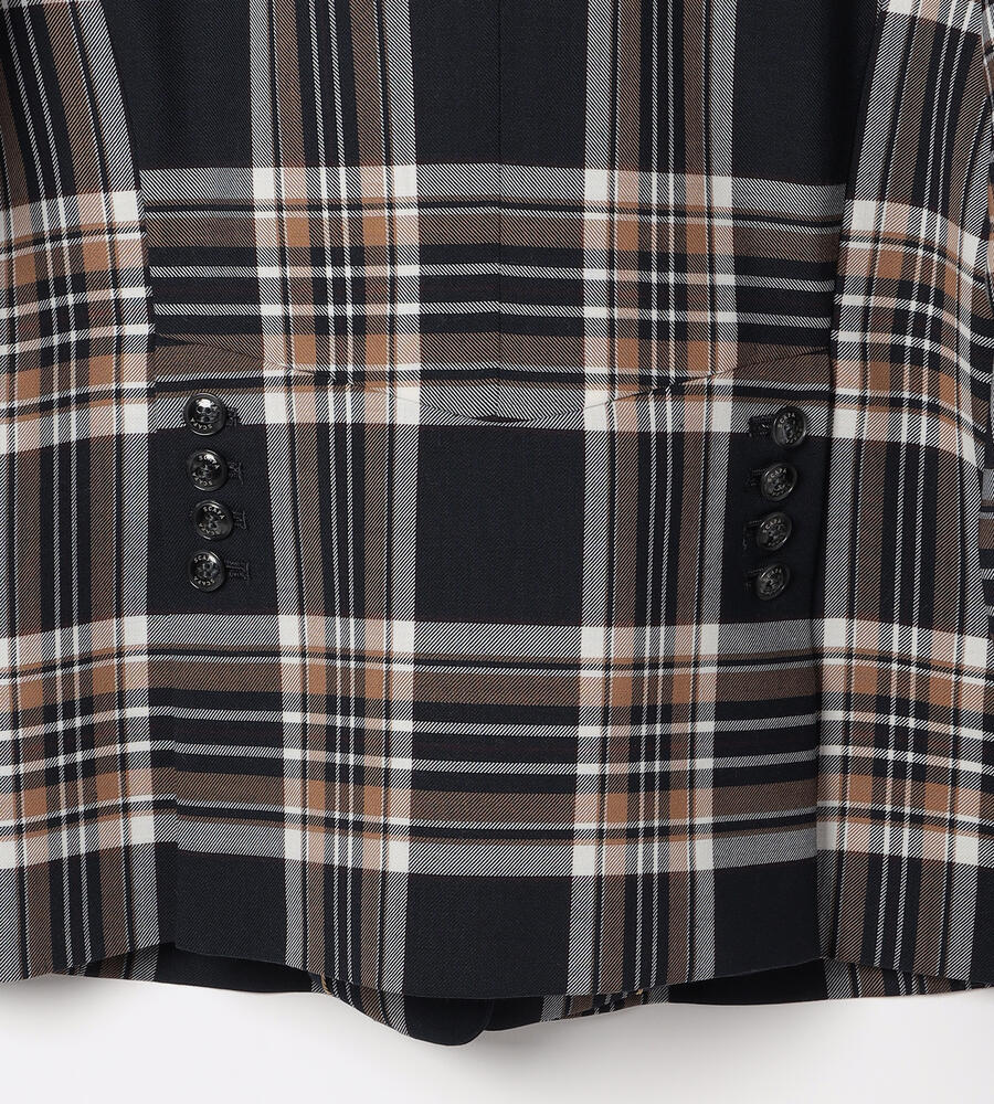 トラッドなタータン柄がスタイリングの主役になるジャケット。美しく計算されたシルエット、スリムなラペルがスタイリッシュな雰囲気に。左右にはフラップポケットを配置、バックにあしらったボタンディテールがポイント。シンプルなインナーと合わせてラフな着こなすのもおすすめです。