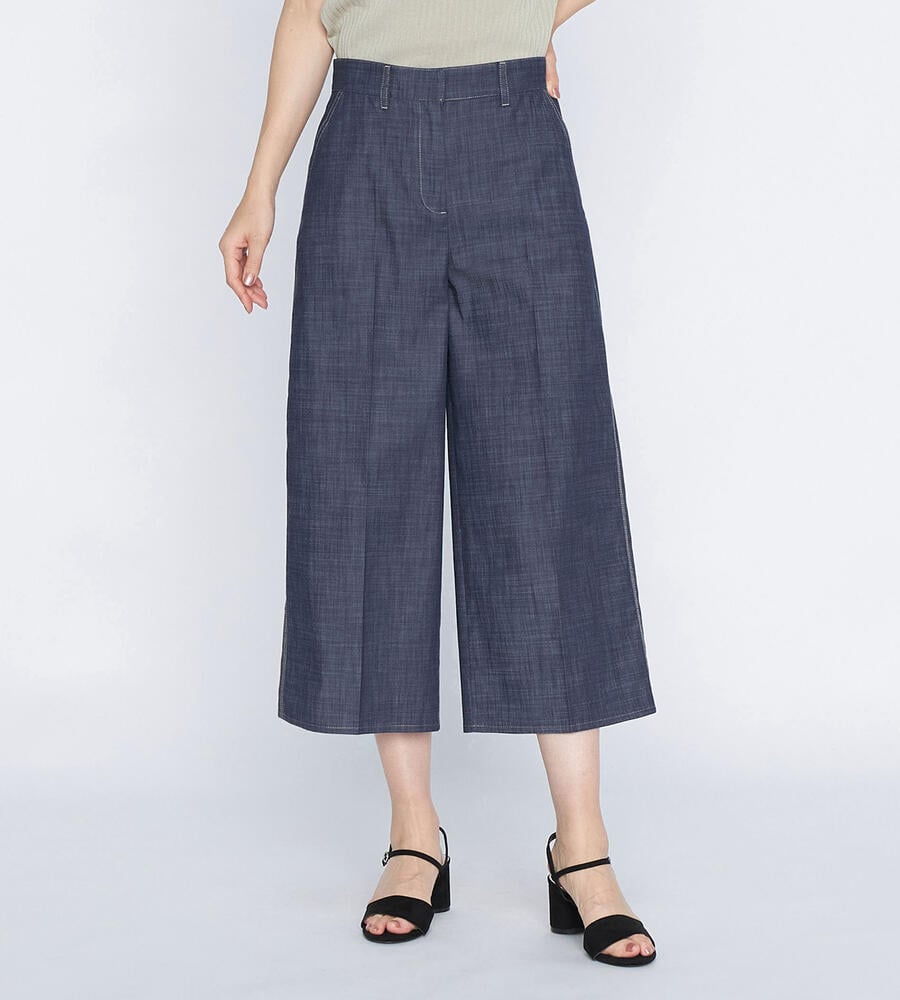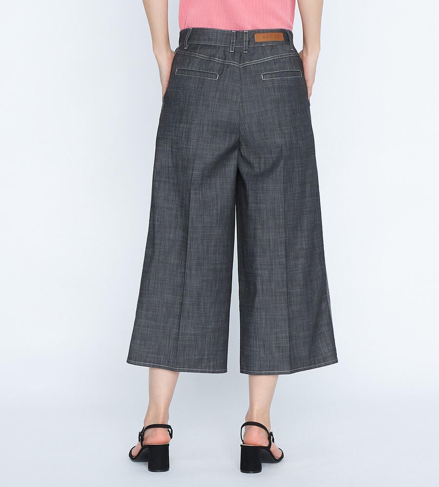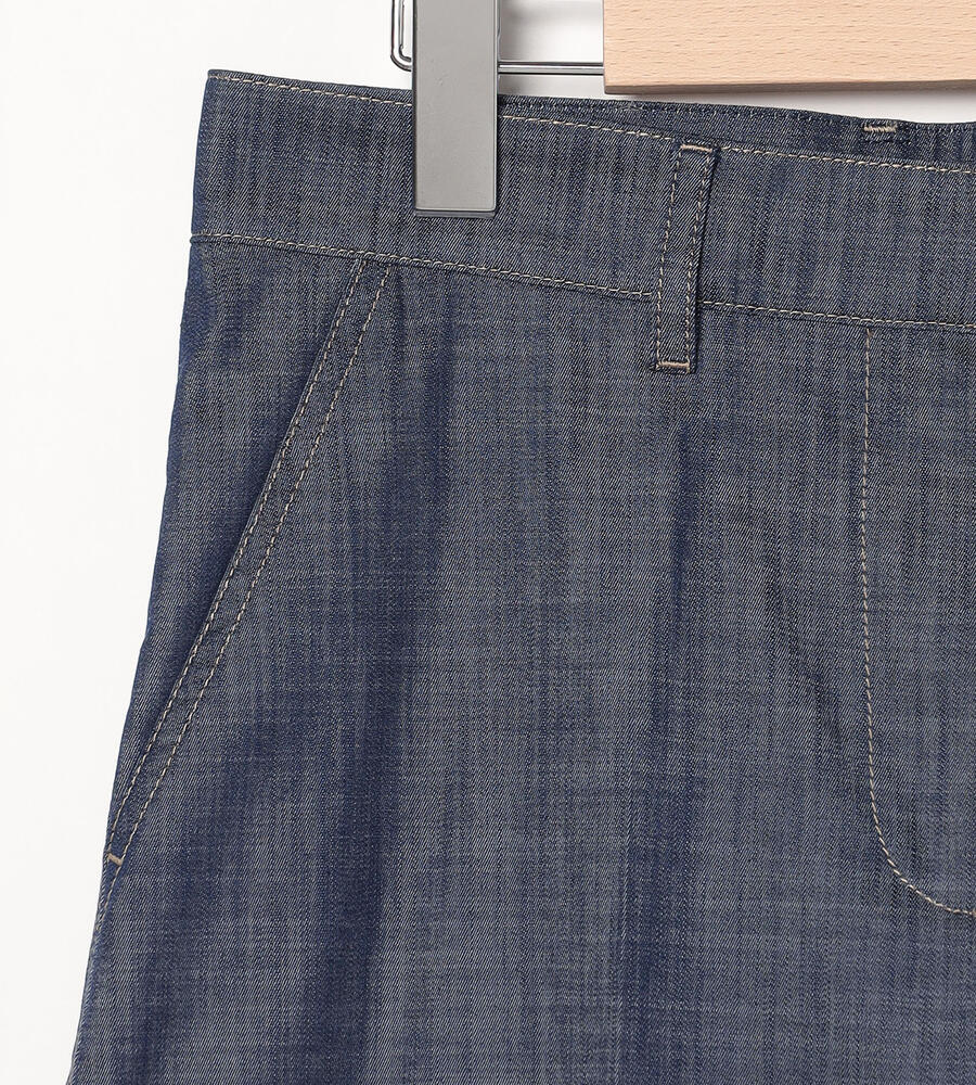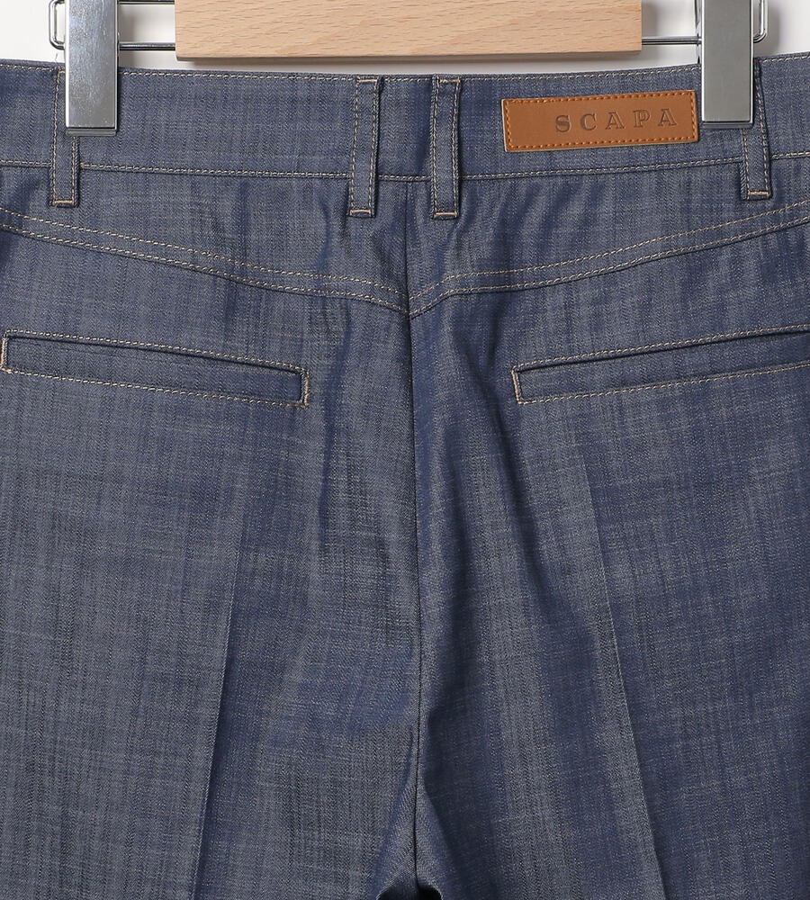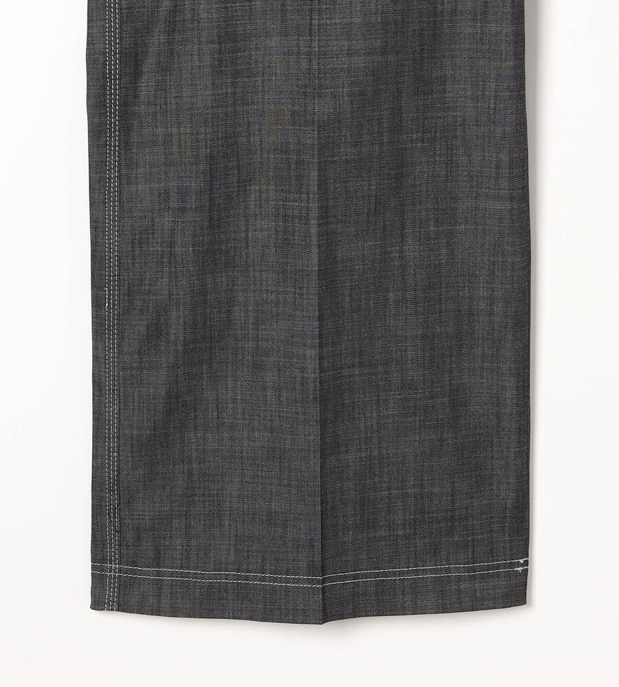 シルエットの程よいワイド感と半端丈の軽やかな印象が特徴のパンツ。ヨーク切り替えとヒップポケットを高めの位置にしており、後ろ姿はすっきりと見えます。センタープレスはシャープさをプラス。霜降り調の表情やフシ感が特徴の豊かな表情も魅力です。配色のステッチがカジュアルなアクセントとして効いています。