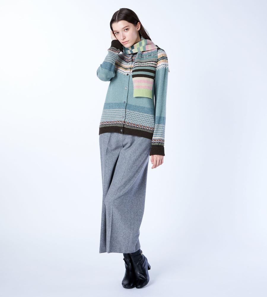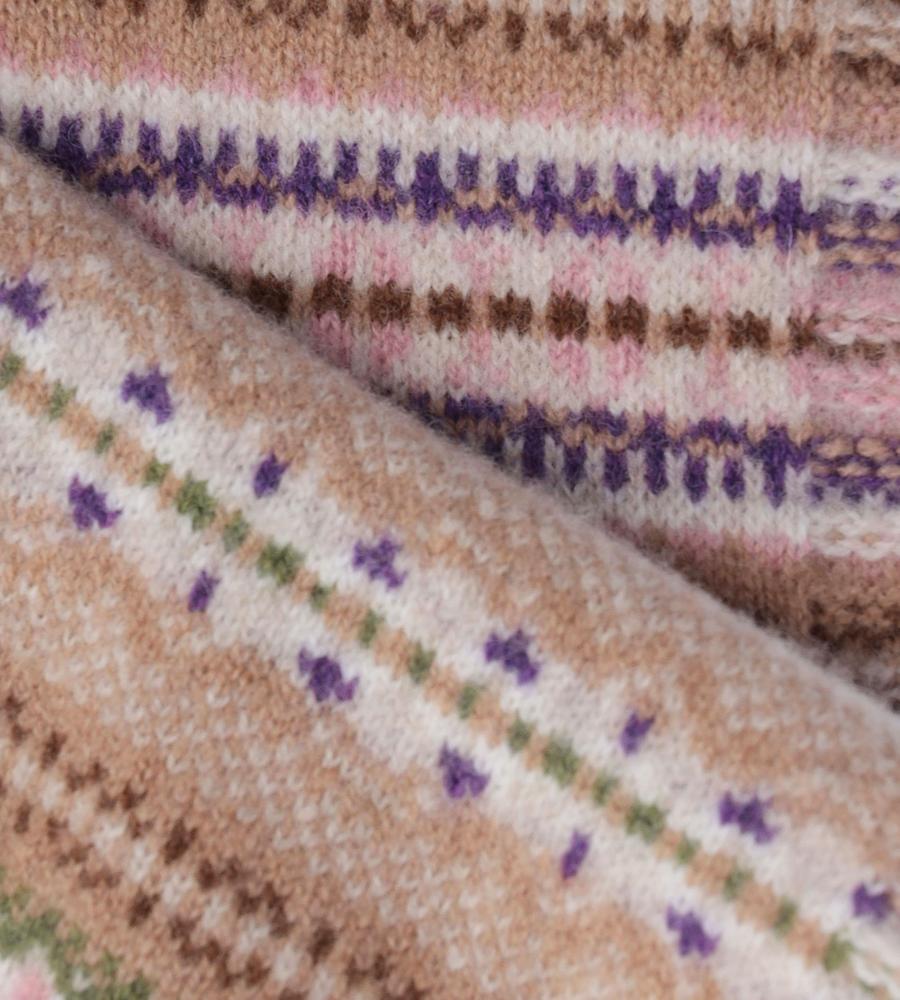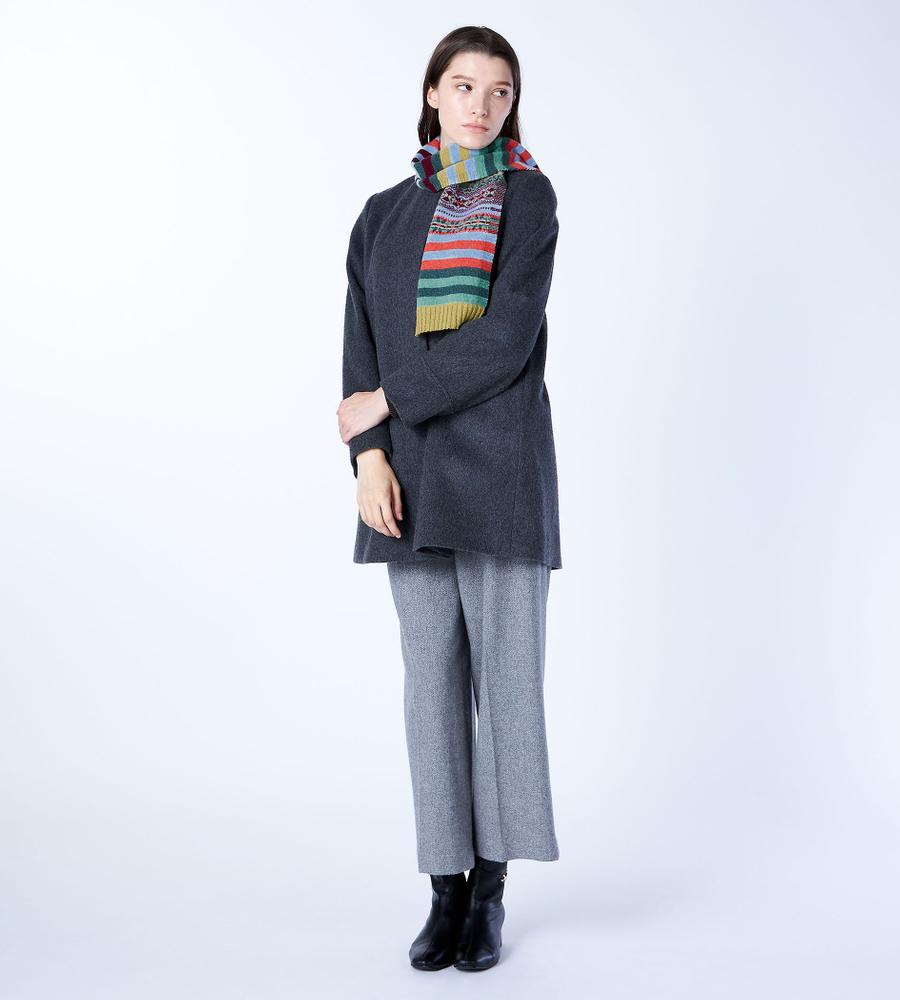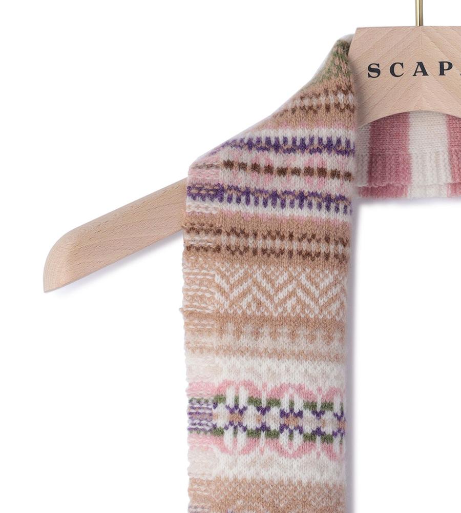 マルチストライプ柄とフェアアイル柄の組み合わせがおしゃれなミニマフラー。スコットランドのブランドERIBEは、オリジナリティある華やかなデザインが魅力。毛100%のあたたかな生地感で、秋冬シーズンの着こなしに最適。重くなりがちな秋冬シーズンの着こなしに、明るいアクセントを与えてくれるアイテムです。