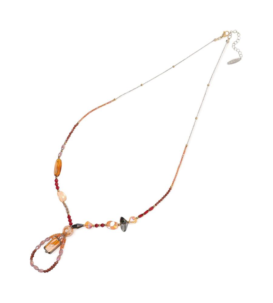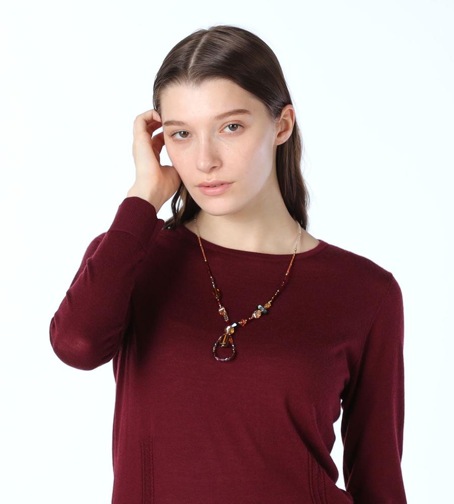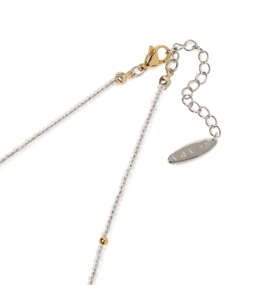 コーディネートに華やぎを添える美しいロングネックレス。色や形の異なるビーズを組み合わせ、センター部分に大ぶりなモチーフをあしらっています。Tシャツからニット、ドレスまで様々なアイテムと相性がよく、季節や着こなしを問わずにお使いいただける一品。アジャスター部分で多少の長さ調整も可能です。