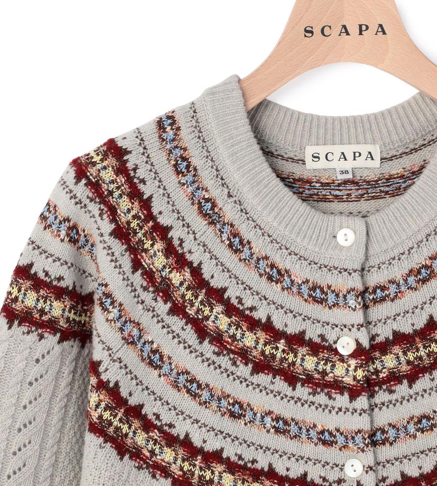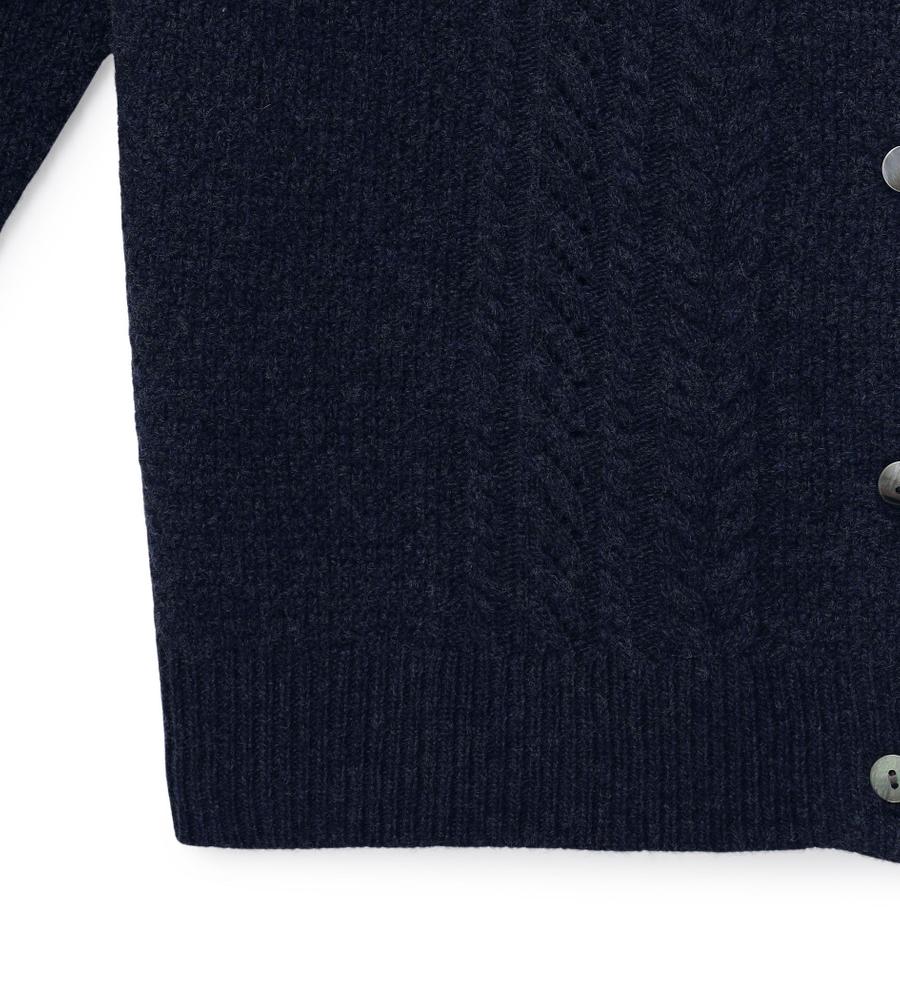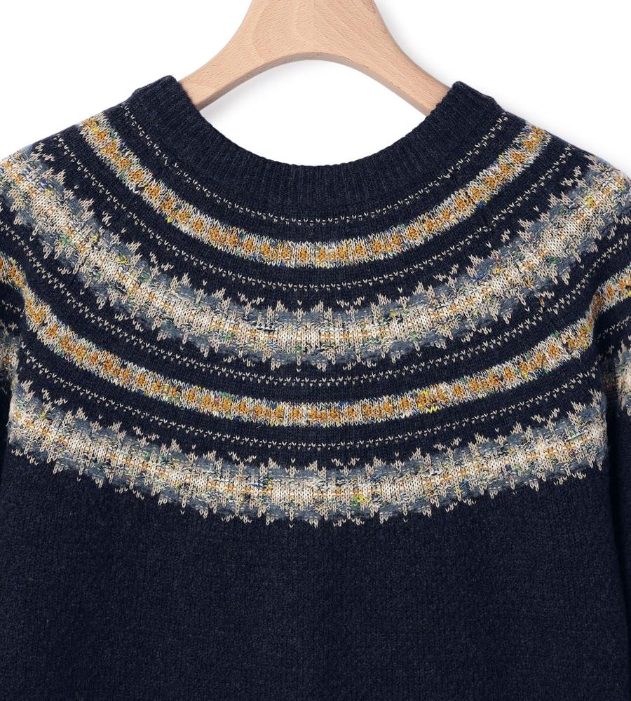 大人の品とぬくもりを感じさせるフェアアイル柄のクルーネックニットカーディガン。フロントと袖部分には透かし編みやケーブル編みを施しています。様々な素材を混紡した上質な風合いも魅力。ほどよくコンパクトなシルエットなため、羽織りにはもちろん、前ボタンを閉めてトップスとしてもお使いいただけます。