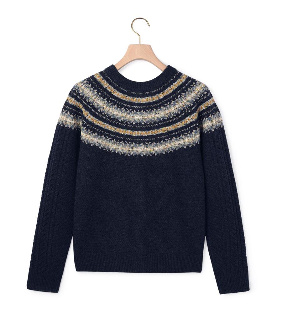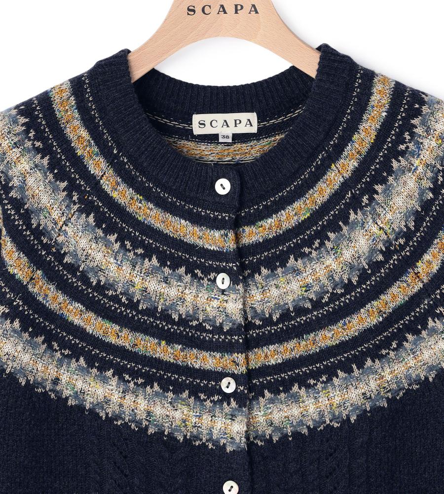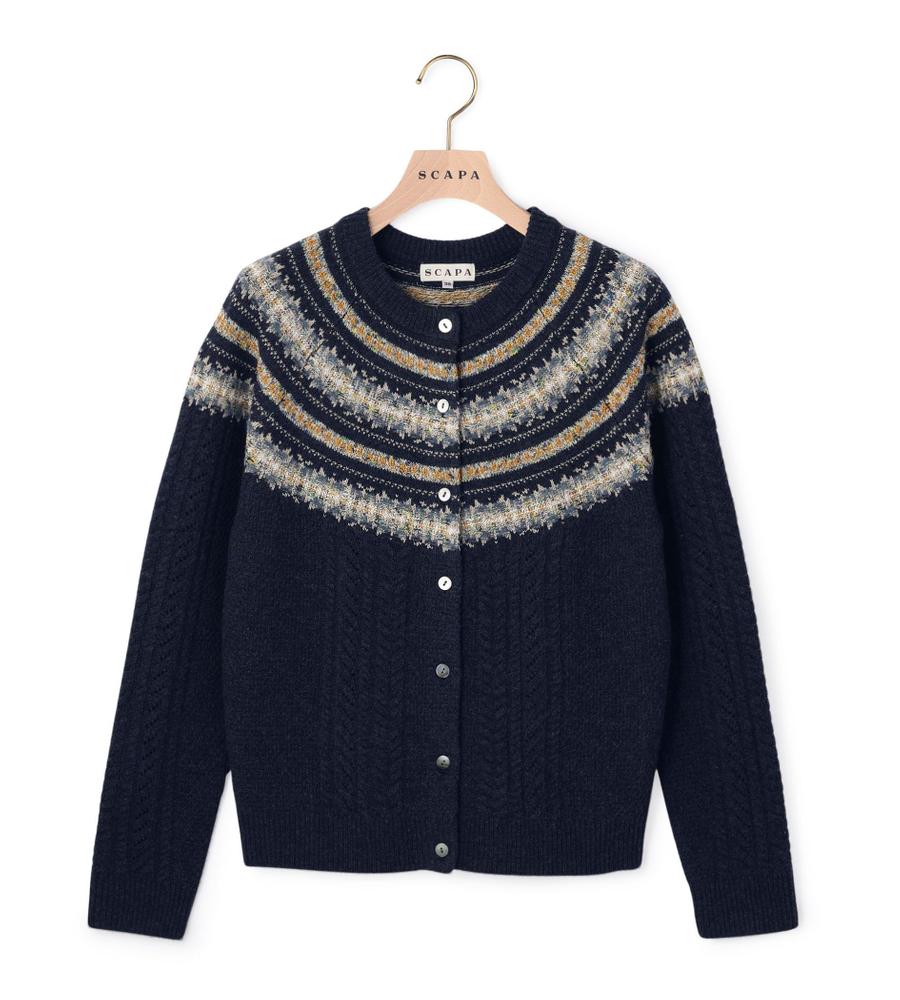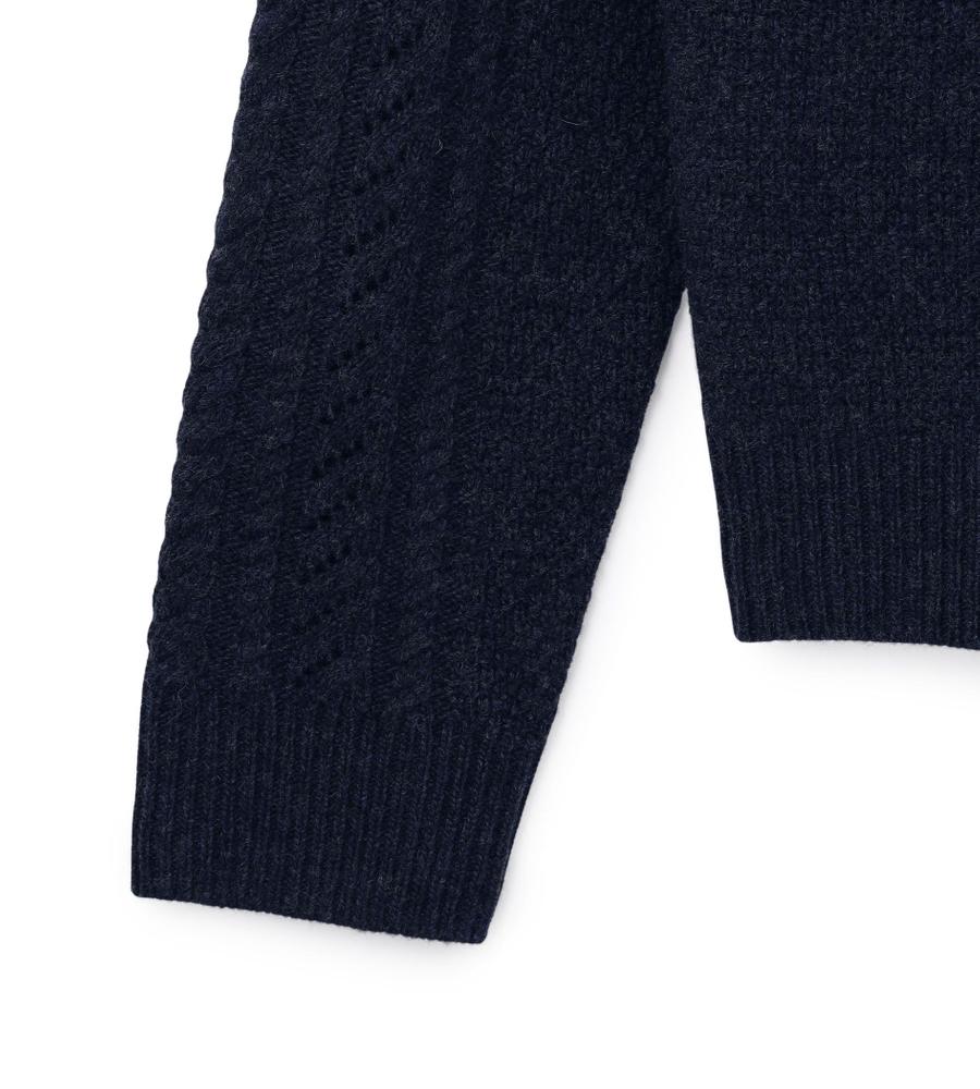 大人の品とぬくもりを感じさせるフェアアイル柄のクルーネックニットカーディガン。フロントと袖部分には透かし編みやケーブル編みを施しています。様々な素材を混紡した上質な風合いも魅力。ほどよくコンパクトなシルエットなため、羽織りにはもちろん、前ボタンを閉めてトップスとしてもお使いいただけます。