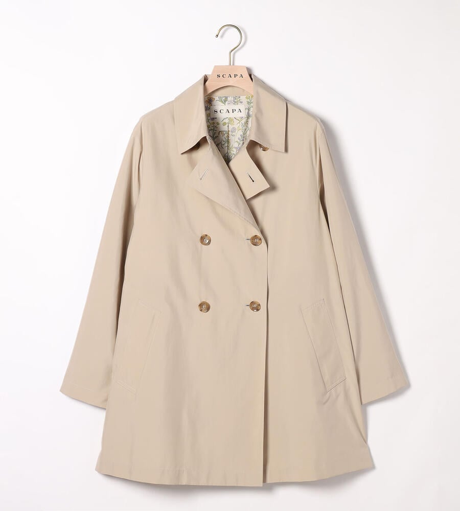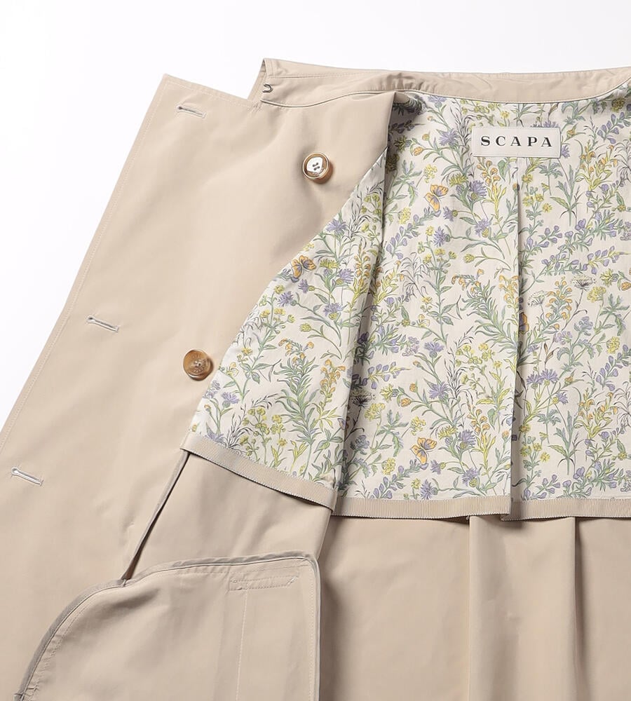 軽やかに羽織れる、薄手で上質なタフタ素材のステンカラースプリングコート。付属のベルトでウエストマークすれば、スタイルUPを狙うことができます。裏地の一部には上品なフラワープリントをあしらい、脱いだ時のアクセントに。季節の変わり目の体温調節に一役買ってくれる、優秀アウターウェアです。裏地のリバティは華やかでさりげなく上品な印象に。同柄のアイテムとセットで着こなすのもおすすめです。