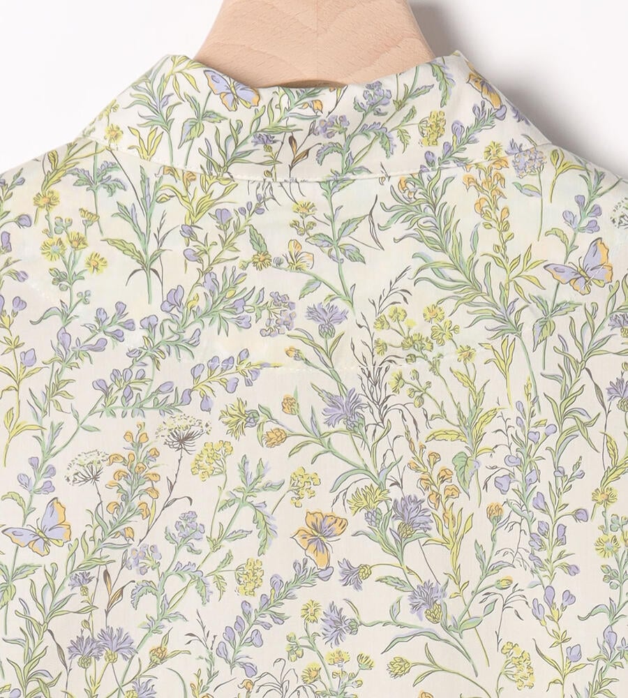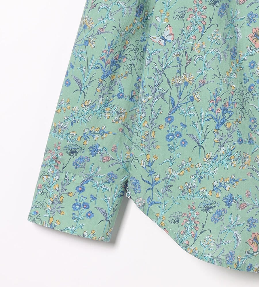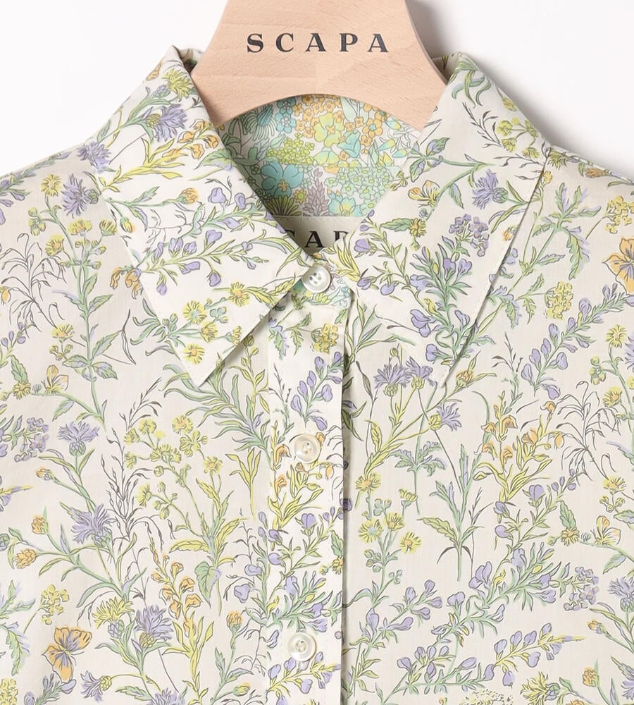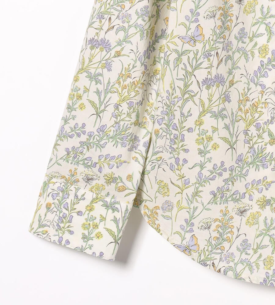 フラワーモチーフのリバティプリントを贅沢に用いたロングスリーブブラウス。ベーシックなレギュラーカラーで、飽きのこないシルエットに仕上げました。裾がラウンドカットされているため、ボトムからタックアウトするのもおすすめ。襟裏を別のリバティプリントで切り替えているのもこだわりのポイントです。同柄のリバティをコートの裏地にさりげなくあしらったコートと合わせるのもおすすめです。