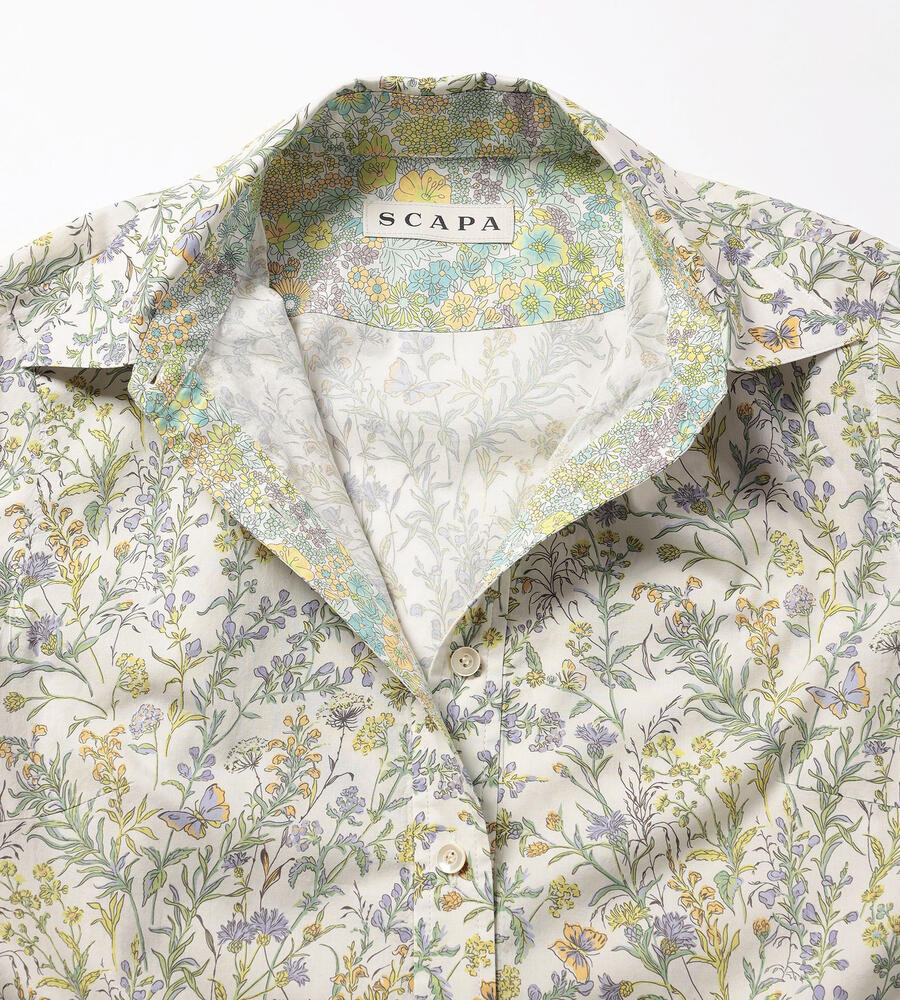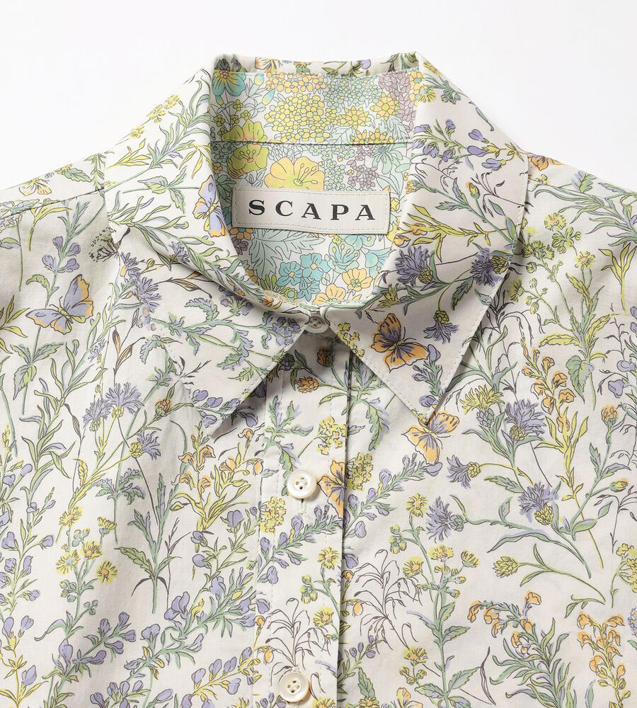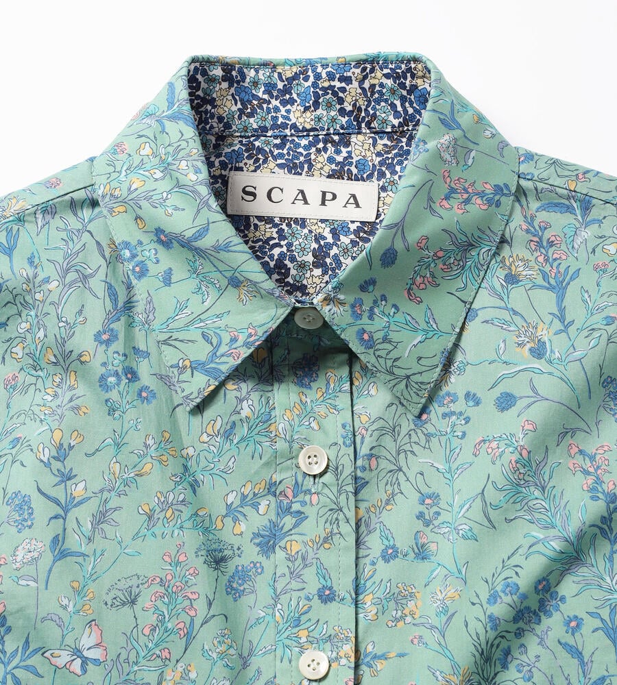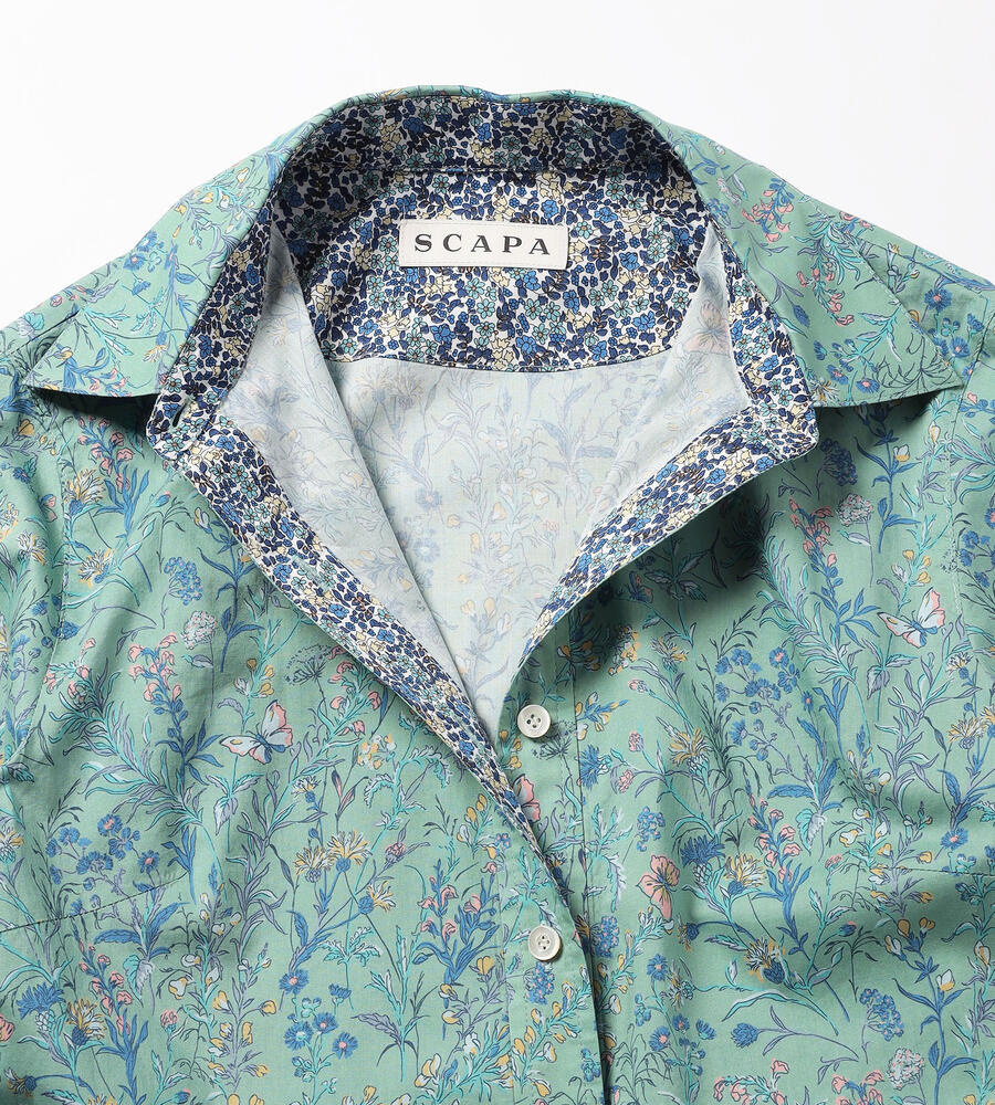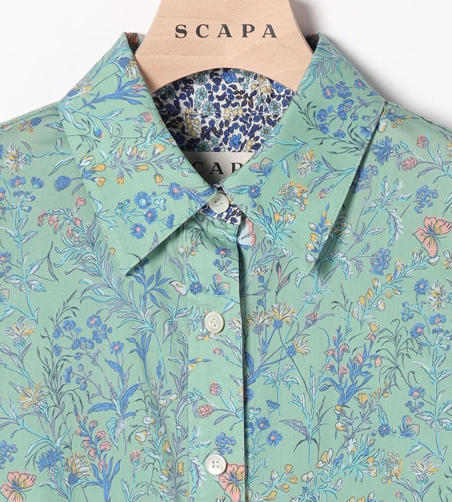フラワーモチーフのリバティプリントを贅沢に用いたロングスリーブブラウス。ベーシックなレギュラーカラーで、飽きのこないシルエットに仕上げました。裾がラウンドカットされているため、ボトムからタックアウトするのもおすすめ。襟裏を別のリバティプリントで切り替えているのもこだわりのポイントです。同柄のリバティをコートの裏地にさりげなくあしらったコートと合わせるのもおすすめです。