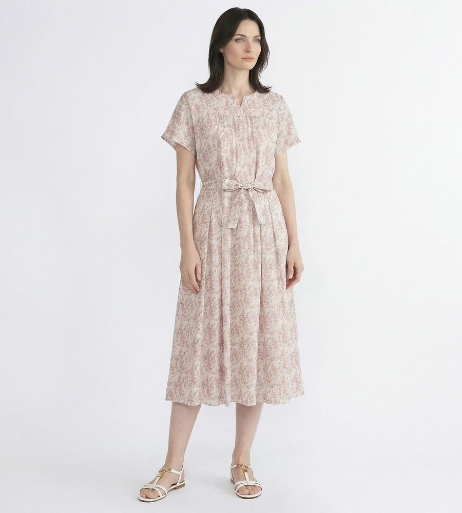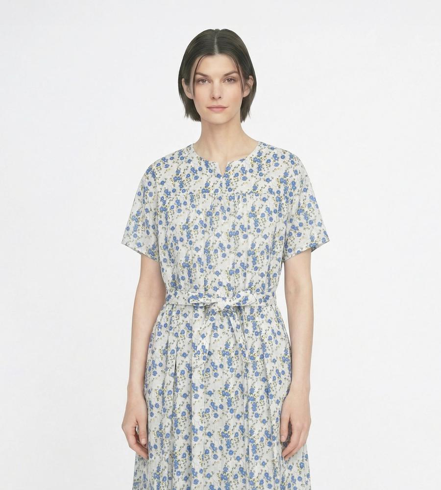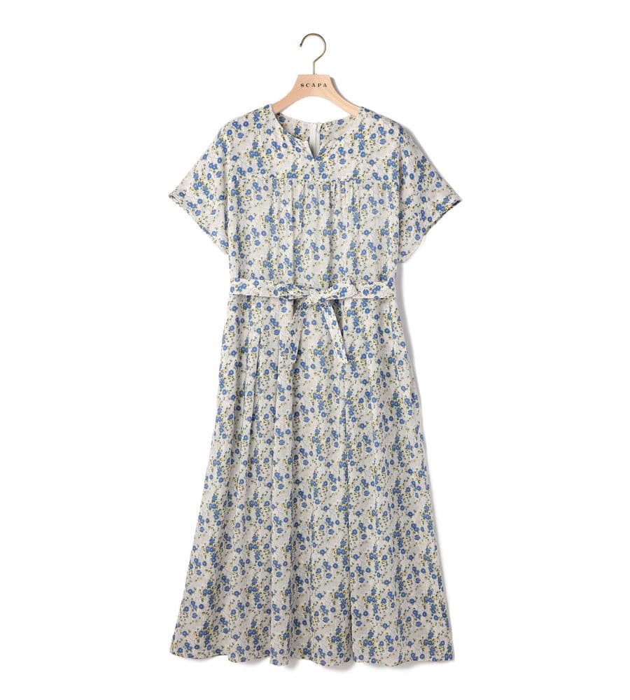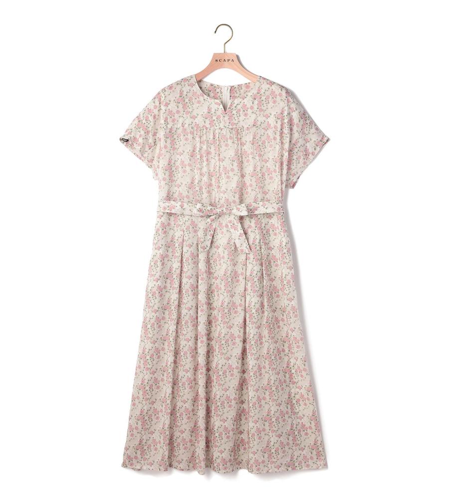 フェミニンな着こなしがかなう、Liberty Print柄のワンピースです。衿元に抜け感を作るキーネック、胸元のギャザーやスカート部分のタックプリーツなどディテールにもこだわりました。くびれコンシャスなリボンベルトもポイント、あわせるアイテム次第でカジュアルにもキレイ目にも着られるアイテムです。