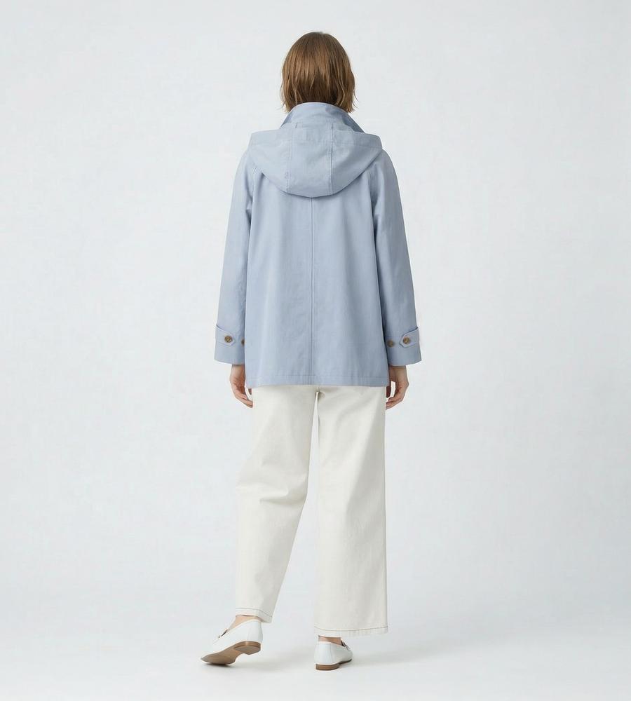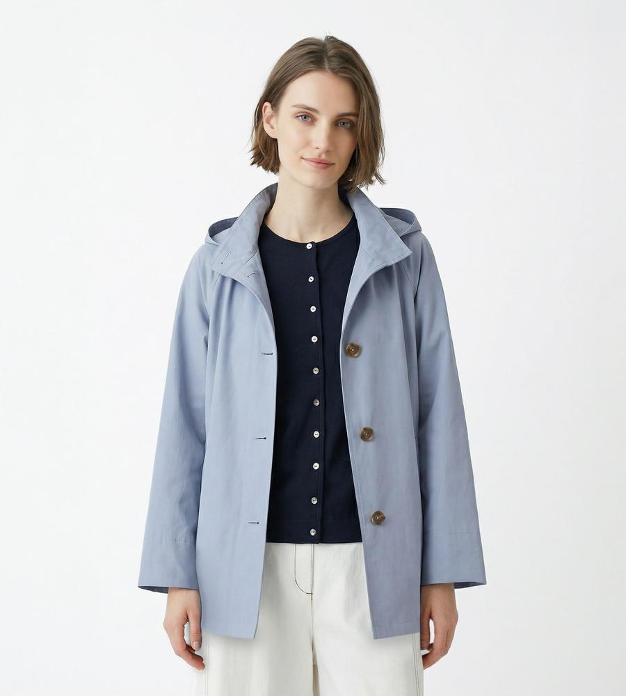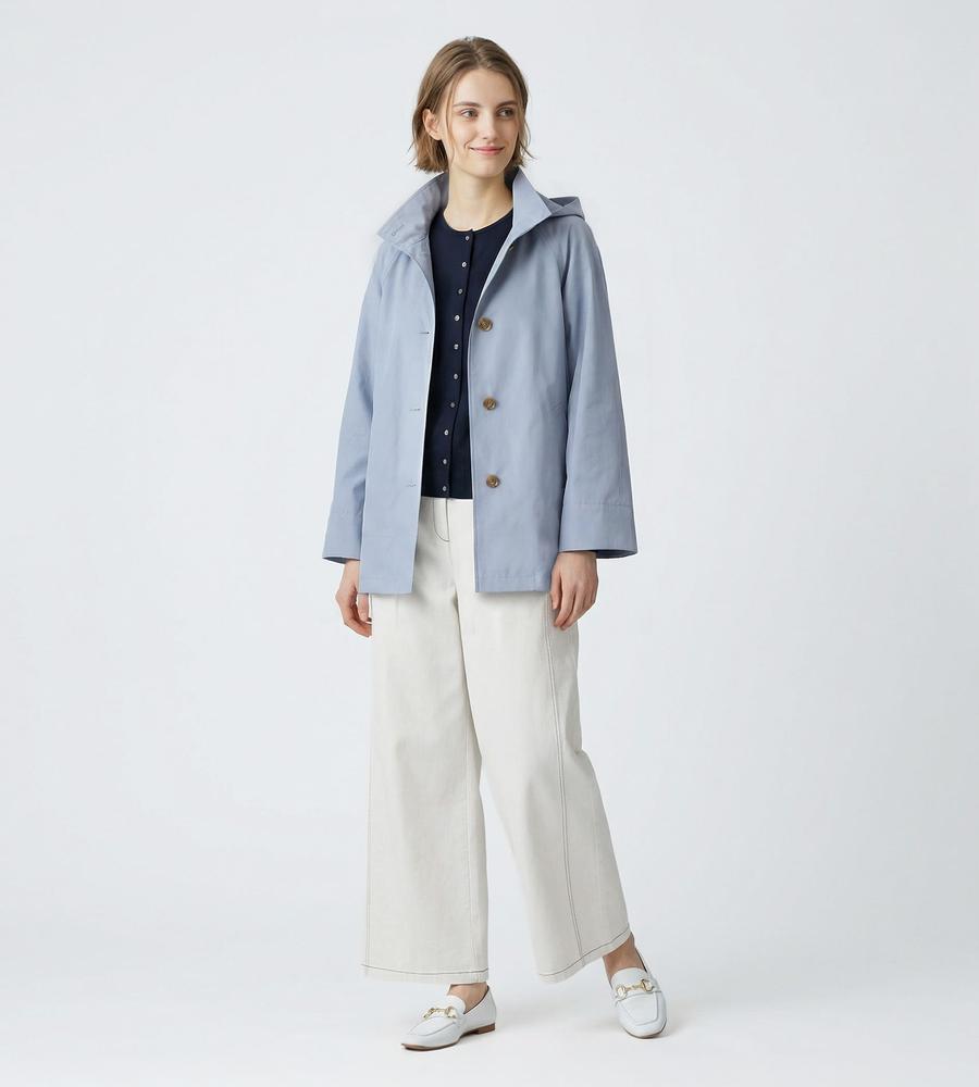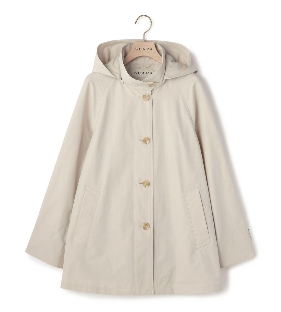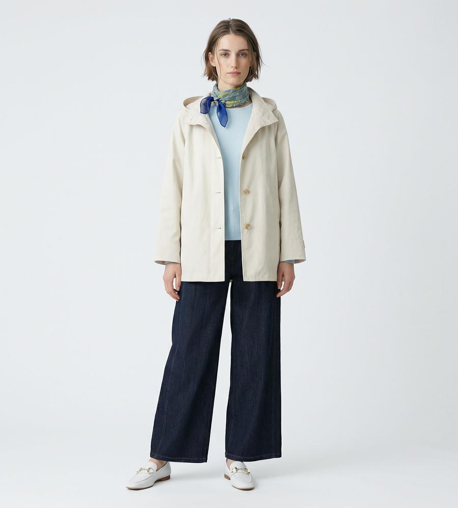 リラックスして羽織れるAラインのフードつきコート。フードは取り外しでき、シンプルなハイネックにアレンジも可能です。どんなボトムにも合わせやすく、デイリーコーデに活躍します。