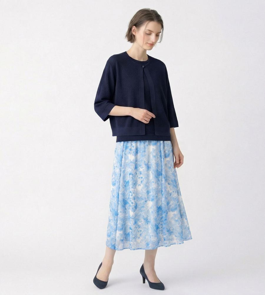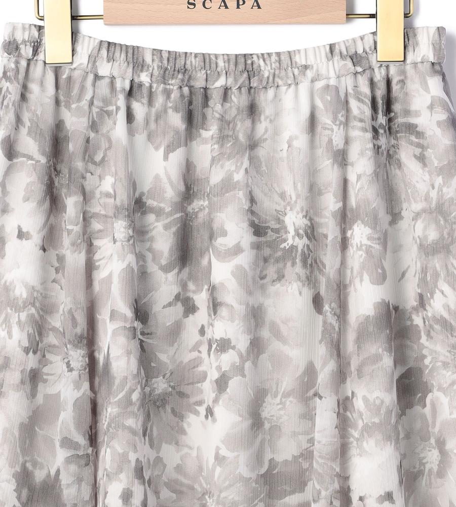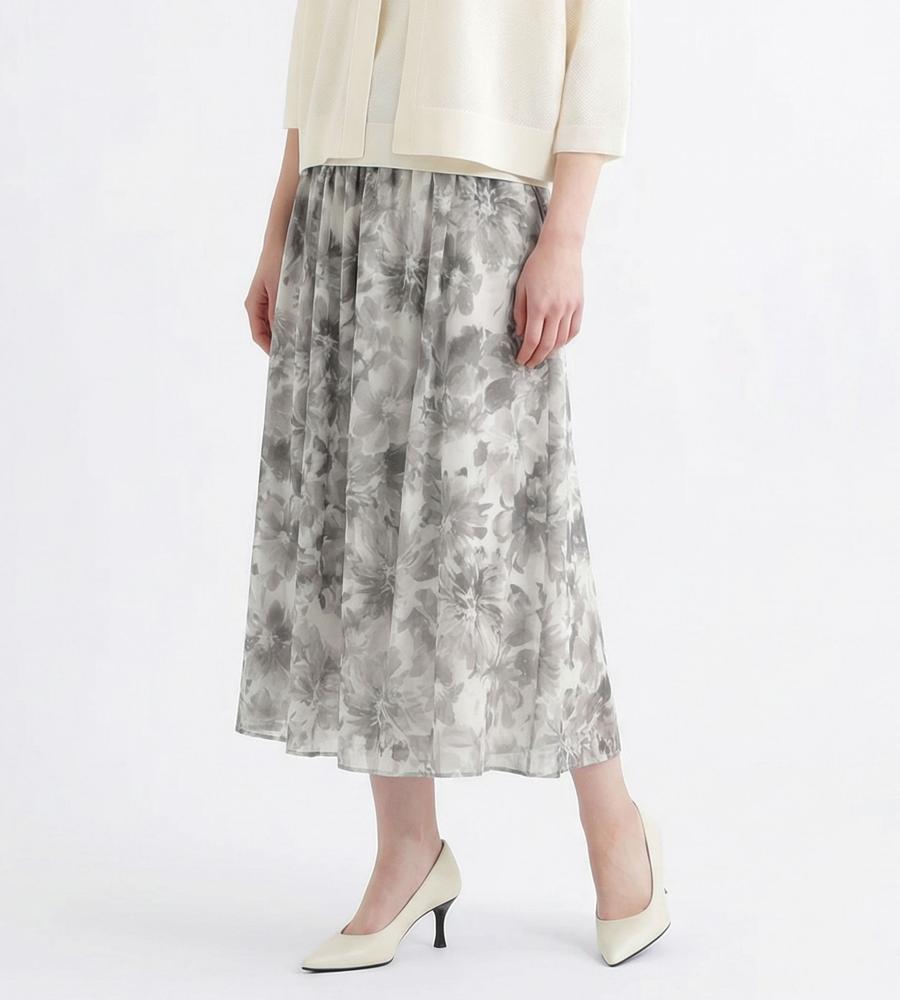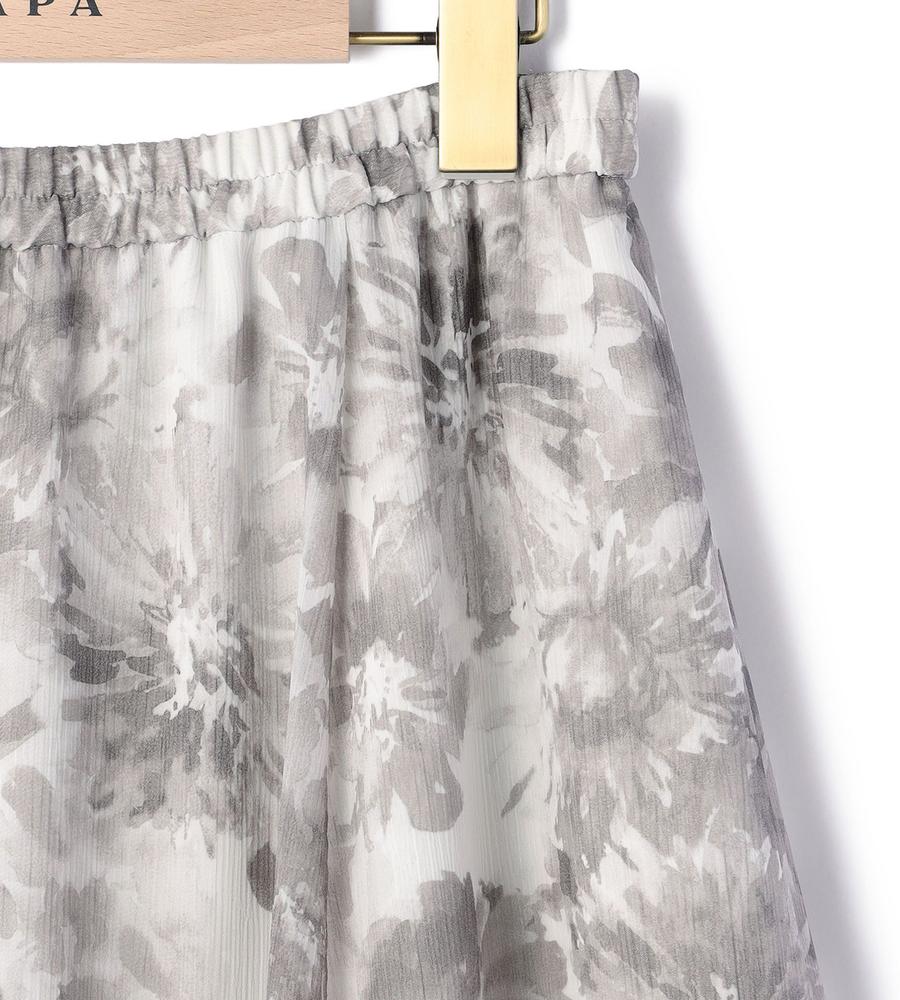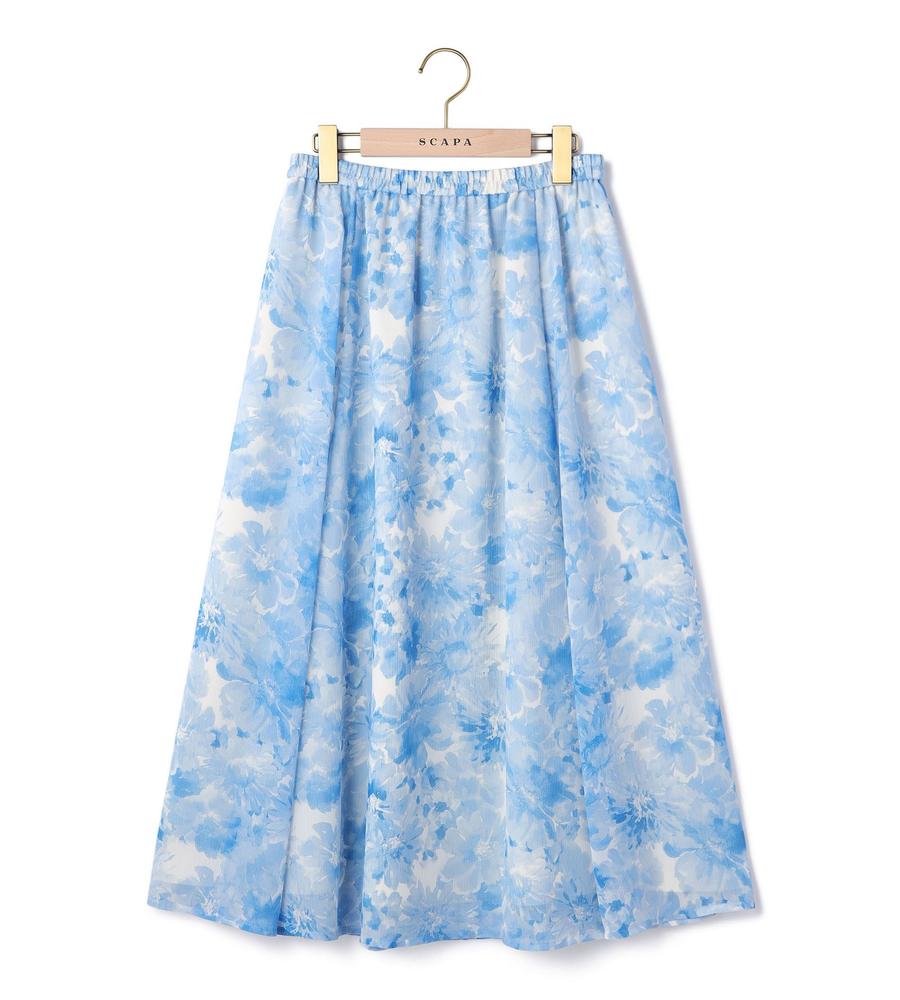 水彩画タッチのフラワー柄プリントで仕上げたスカートです。表面に凹凸感のある楊柳素材で肌ばなれが良く、これからの汗ばむ季節もサラッと快適に過ごせます。グラデーションを生かしたワントーンカラーであわせるアイテムを選ばないのがポイント、同素材のブラウスとのセットアップもおすすめです。