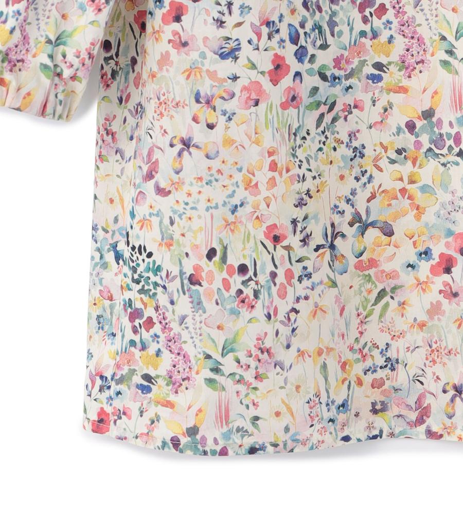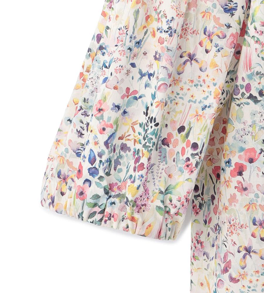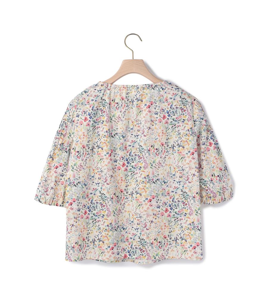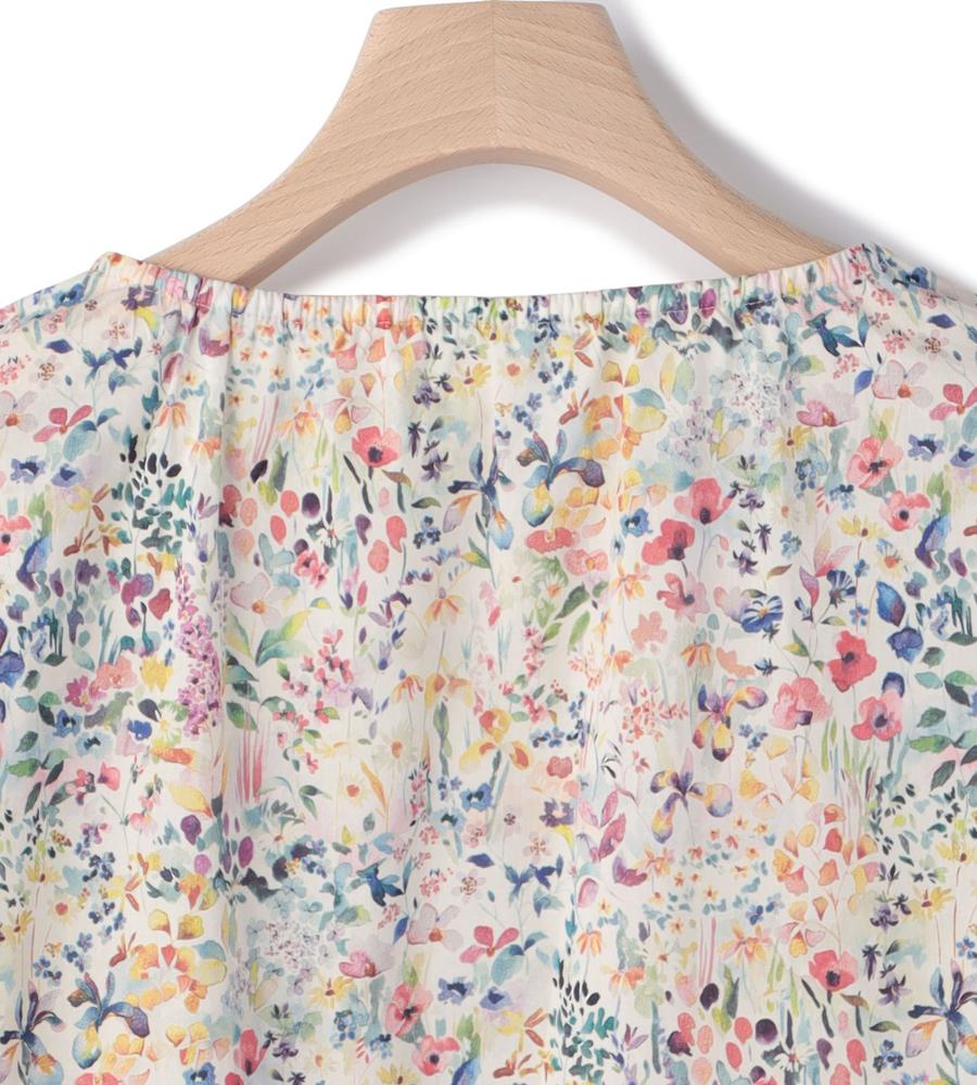 清楚でいてリッチな表情を醸すリバティプリントのブラウス。ネックラインや袖口のタックが、上品な立体シルエットを演出。二の腕をカバーする5分袖で、春夏秋と活躍します。