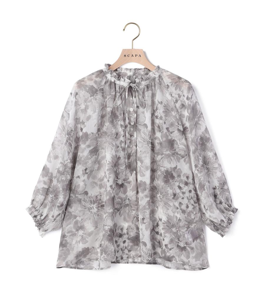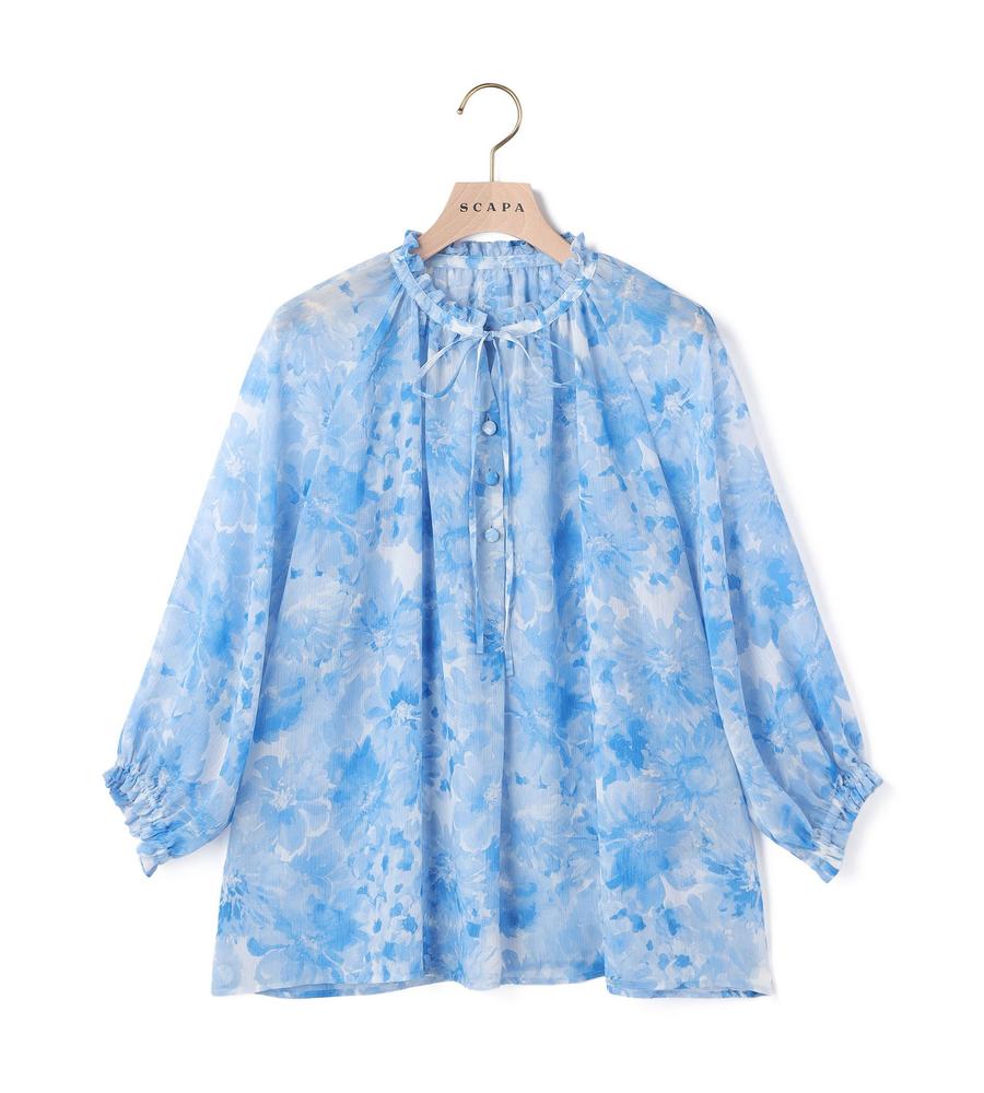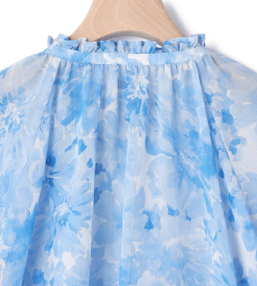 水彩画タッチのグラデーションフラワー柄プリントで仕上げたブラウスです。表面に凹凸感のある楊柳素材で肌ばなれが良く、これからの汗ばむ季節もサラッと快適に過ごせます。衿元にあしらわれたフリルやリボンが顔まわりをフェミニンにドレスアップ、同素材のブラウスとセットアップでそろえるのもおすすめです。