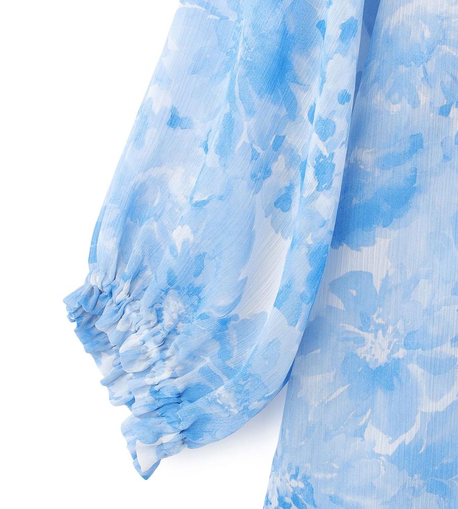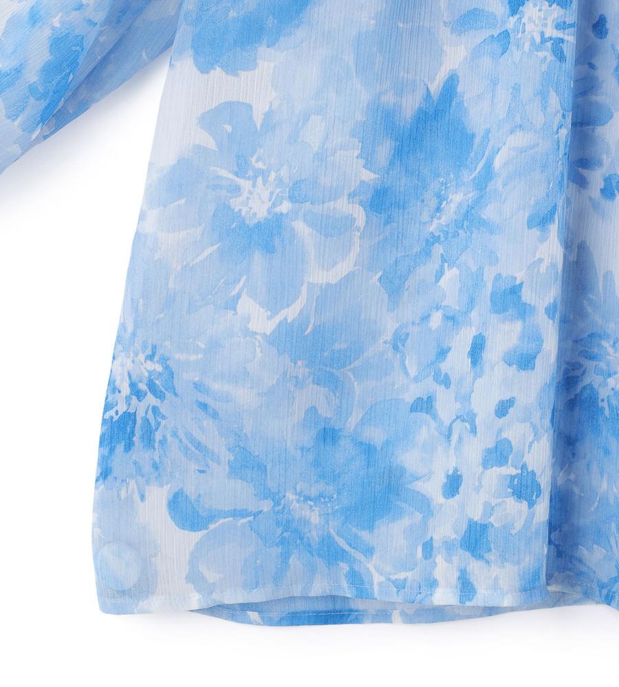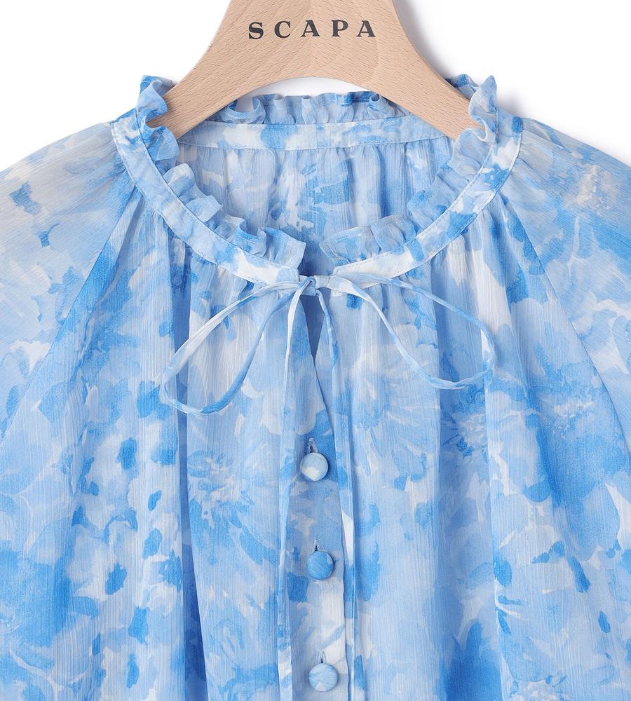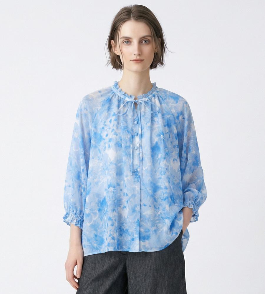 水彩画タッチのグラデーションフラワー柄プリントで仕上げたブラウスです。表面に凹凸感のある楊柳素材で肌ばなれが良く、これからの汗ばむ季節もサラッと快適に過ごせます。衿元にあしらわれたフリルやリボンが顔まわりをフェミニンにドレスアップ、同素材のブラウスとセットアップでそろえるのもおすすめです。
