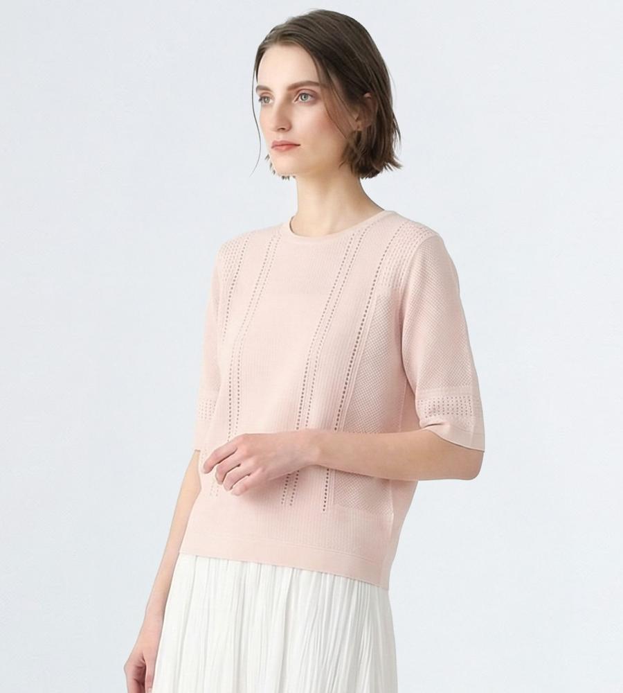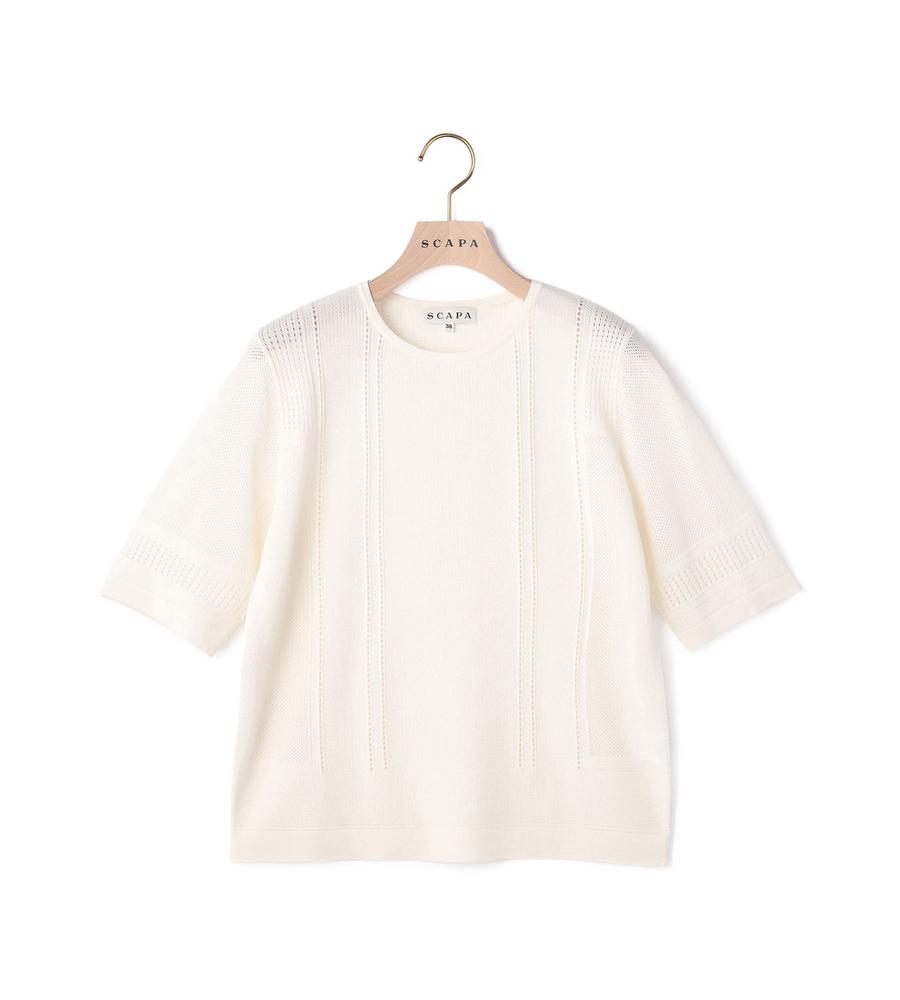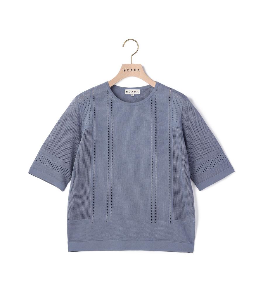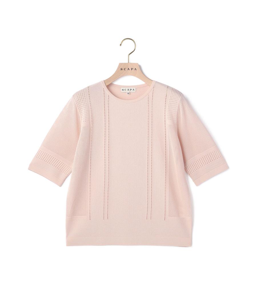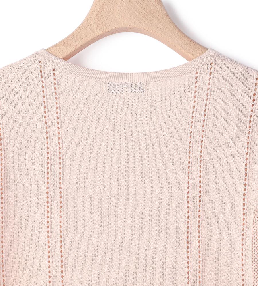 毎日のコーデにトレンド感をプラスする、涼やかな編み地で仕上げたプルオーバーニットです。さりげない透け感がセクシーになり過ぎない大人の肌見せスタイルをかなえてくれます。部分的に編み地を切り替えた表情豊かなデザイン性も魅力、同素材のカーディガンとアンサンブルでそろえるのもおすすめです。