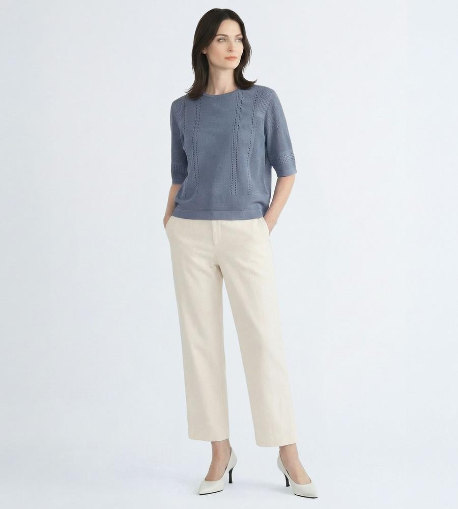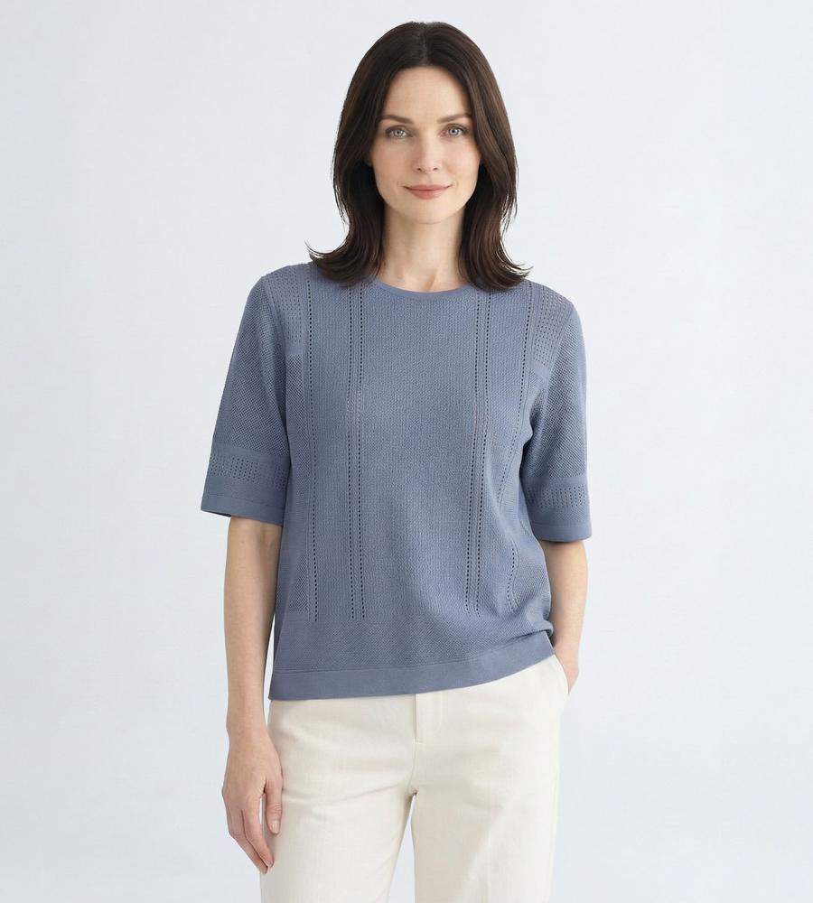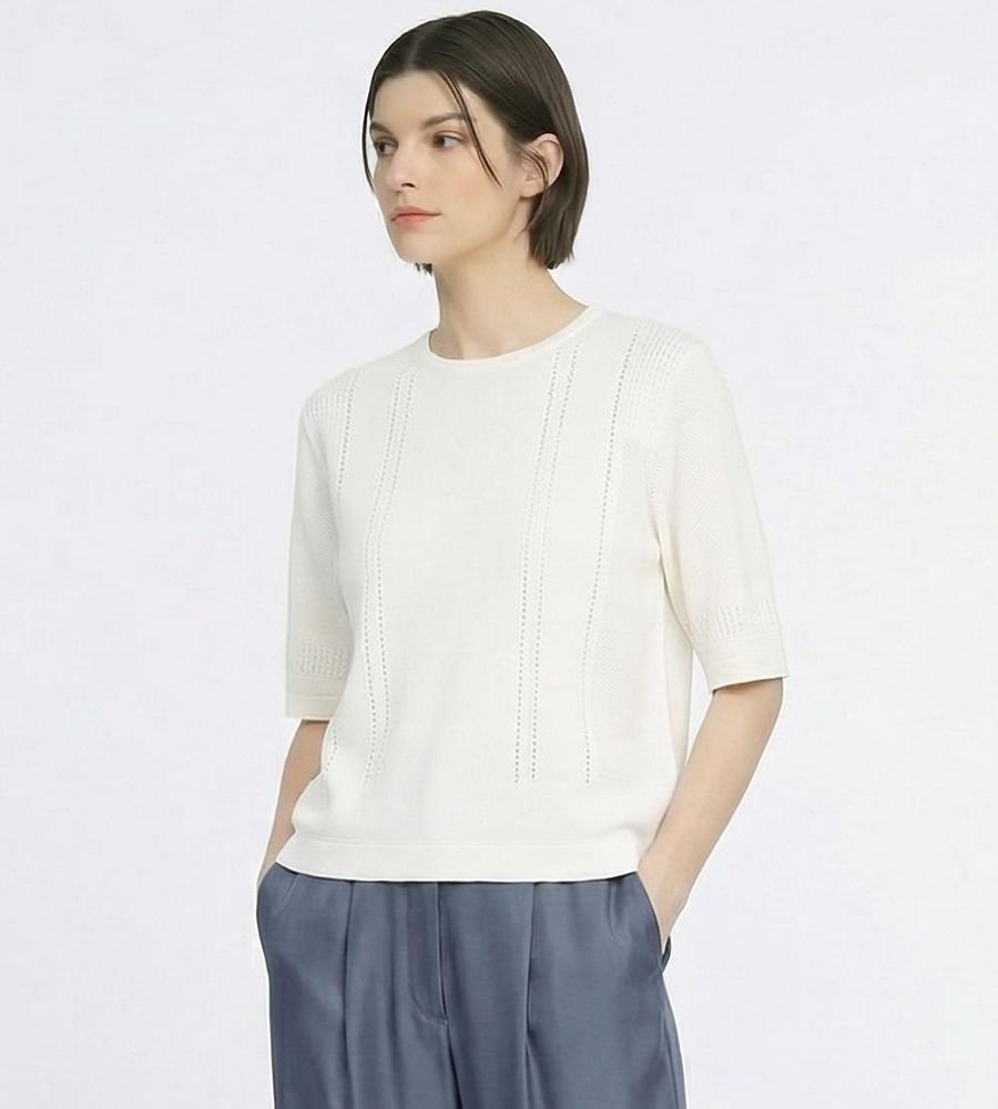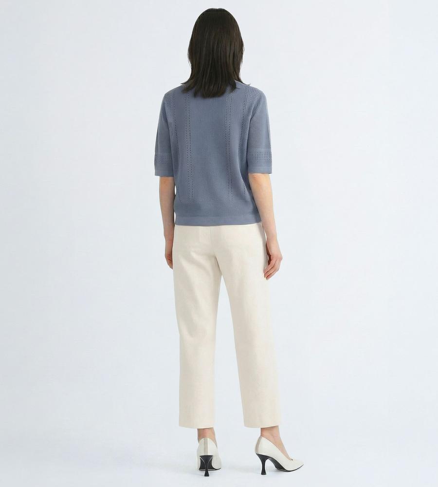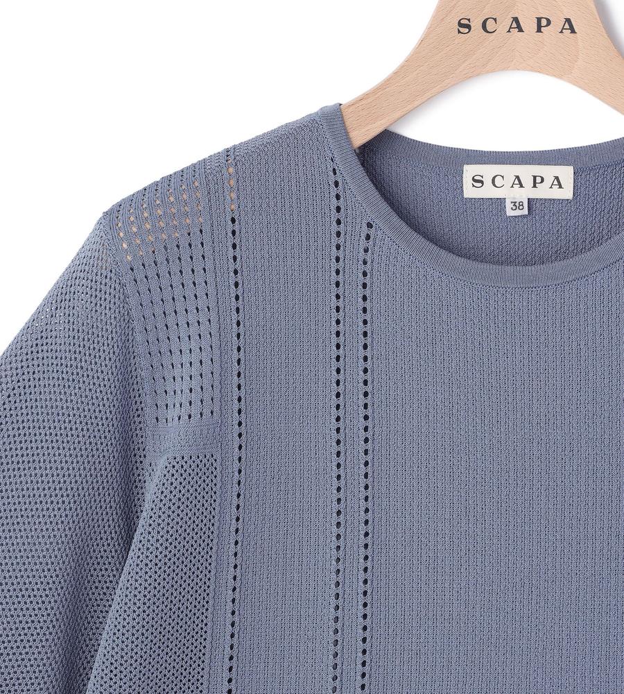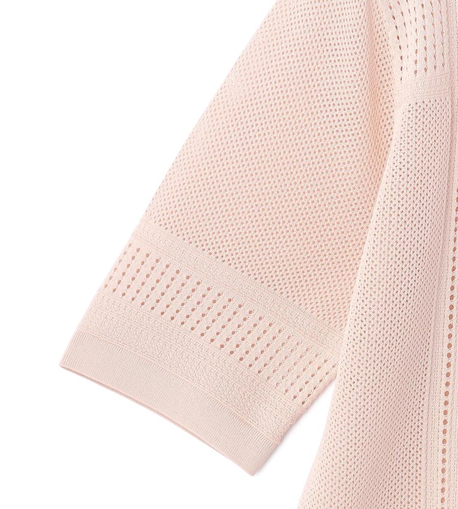 毎日のコーデにトレンド感をプラスする、涼やかな編み地で仕上げたプルオーバーニットです。さりげない透け感がセクシーになり過ぎない大人の肌見せスタイルをかなえてくれます。部分的に編み地を切り替えた表情豊かなデザイン性も魅力、同素材のカーディガンとアンサンブルでそろえるのもおすすめです。
