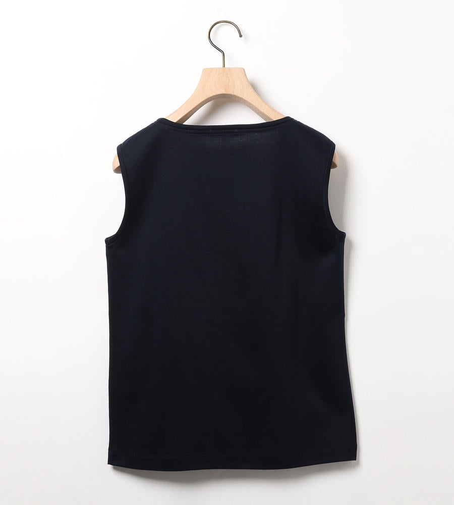 肌触りのよいスムース地で仕立てたシンプルなノースリーブカットソーです。シンプルで合わせやすく、一枚着としても、インナーとしてもベーシックに活躍します。左裾にさりげなく添えた刺繍がワンポイントに。