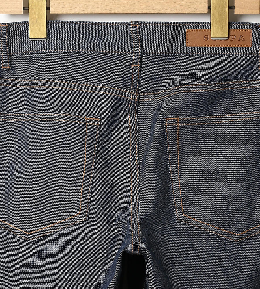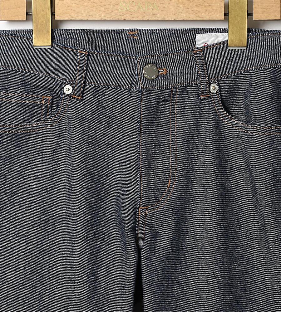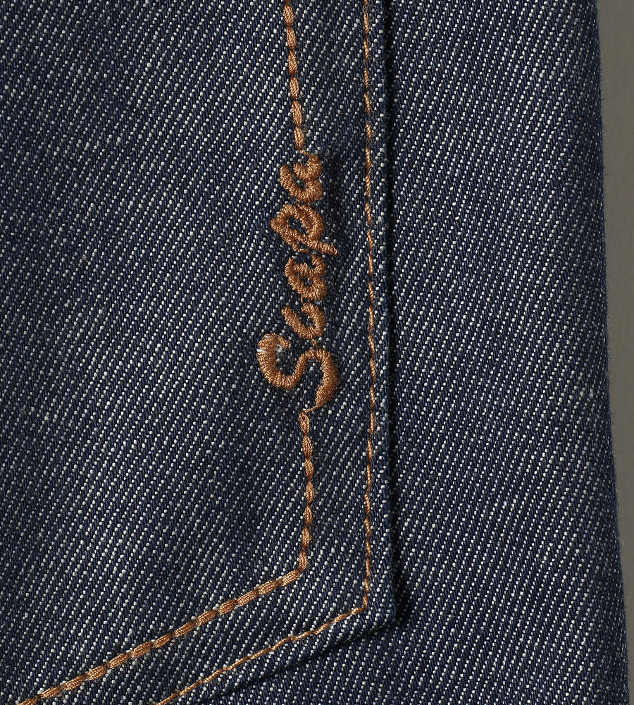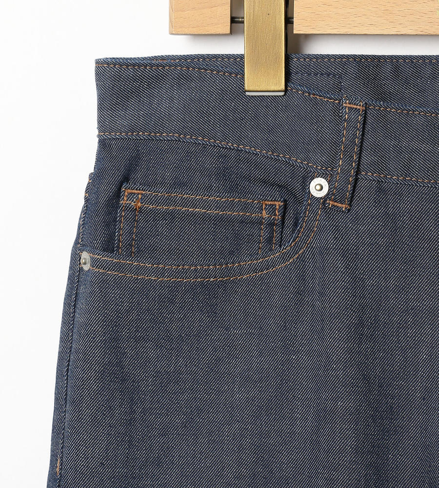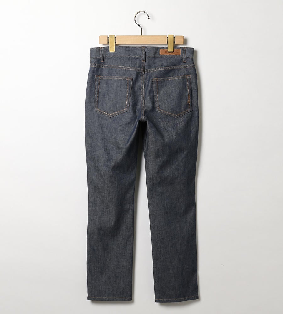 すっきりとしたきれいなストレートシルエットのデニムパンツ。右バックウエストのロゴ入りパッチや右バックポケットのネームステッチがアクセントに。ストレッチの効いたデニムを使用しているのでヒップ周りが楽になり、足捌きも良好。シンプルなデザインでコーディネートに取り入れやすくなっています。