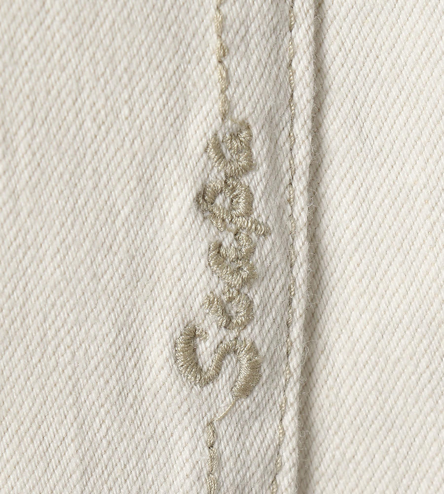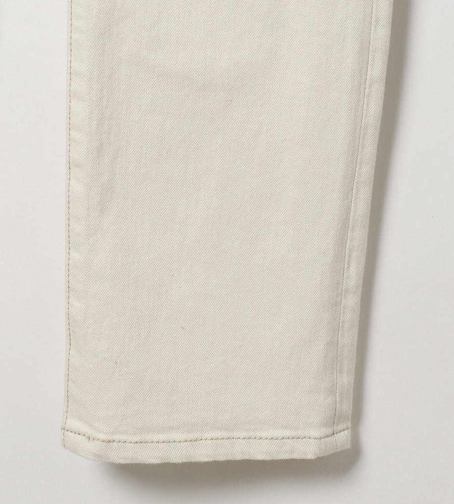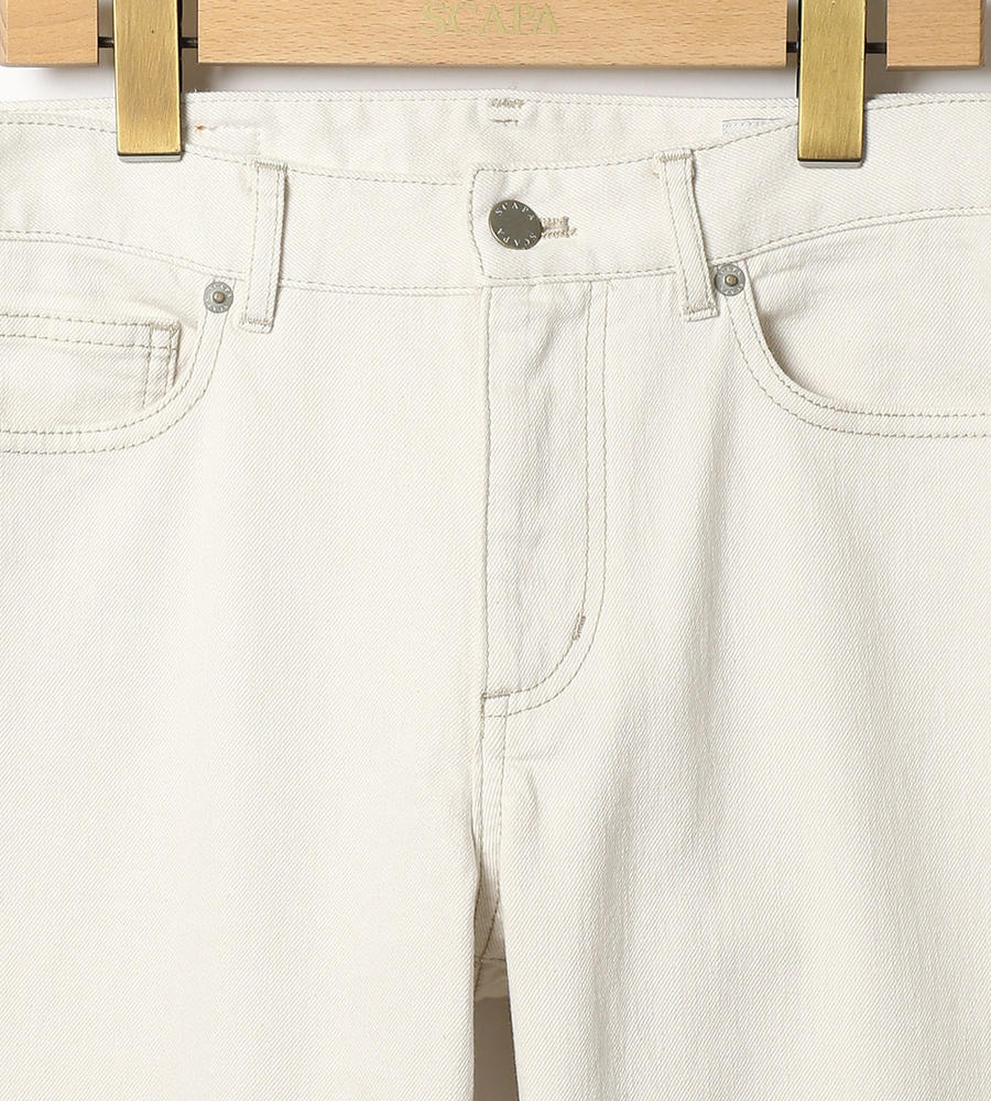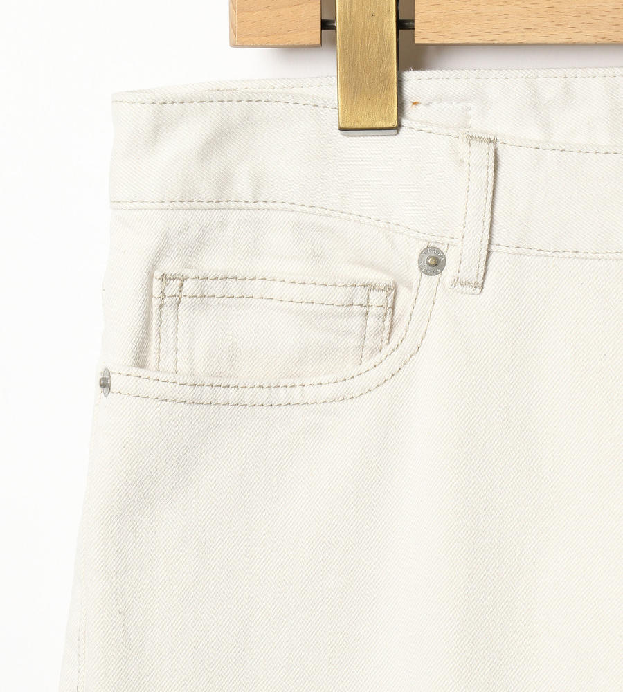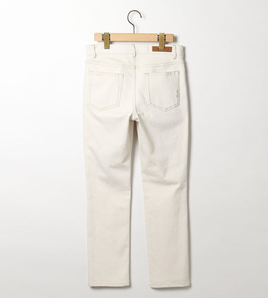 爽やかな印象を与える、きれいなストレートシルエットのホワイトデニムパンツ。右バックウエストのロゴ入りパッチや右バックポケットのネームステッチがアクセントに。ストレッチの効いたデニムを使用しているのでヒップ周りが楽になり、足捌きも良好。スポーティなフェミニンルックが手軽にお楽しみいただけるアイテムです。