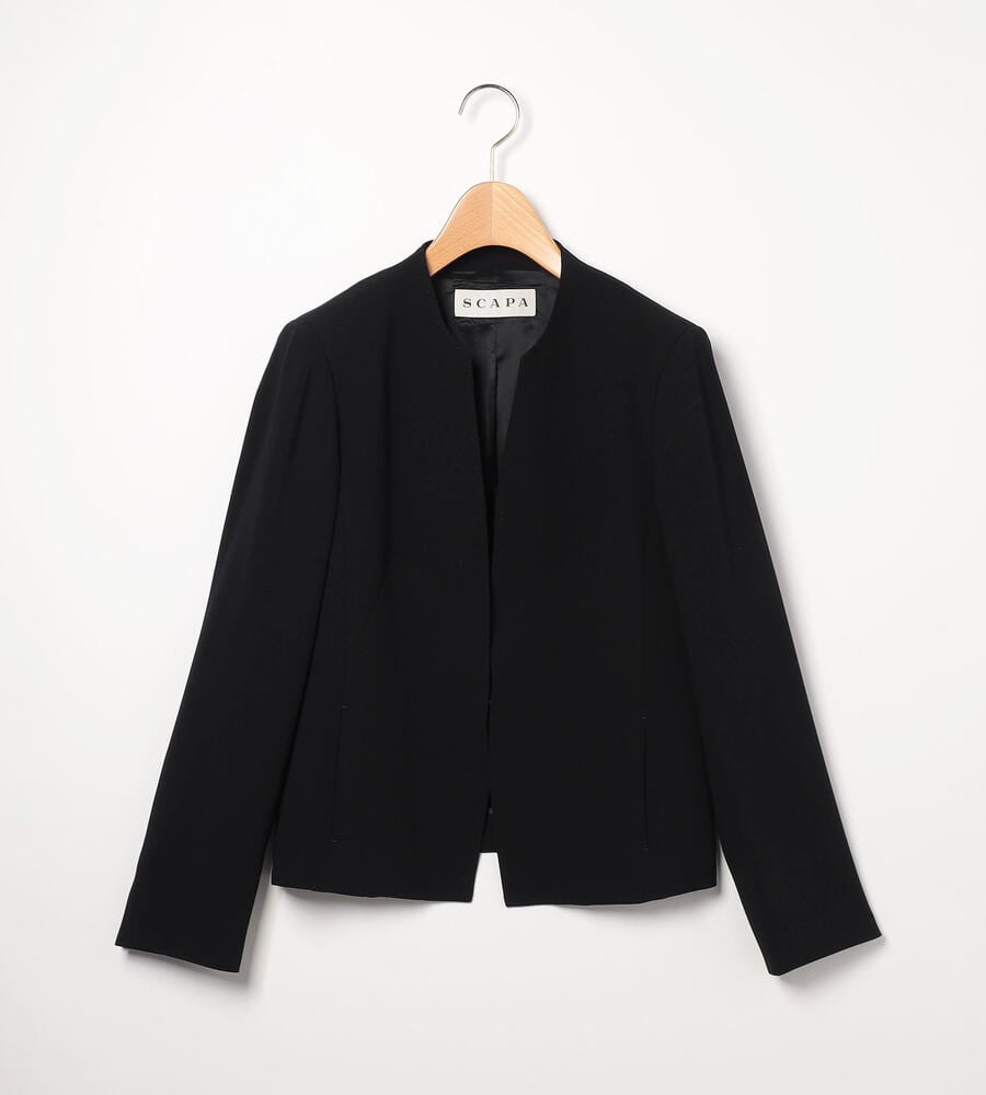 ノーカラーデザインでコンパクト&シンプルに仕上げたバックサテンジャケット。フロントはフック仕様。シャープな胸もとのVラインが顔まわりをすっきりと見せ、インナーとのレイヤードも楽しめます。ネックラインや前立てにほどこしたステッチディテールにもこだわりを感じるアイテムです。