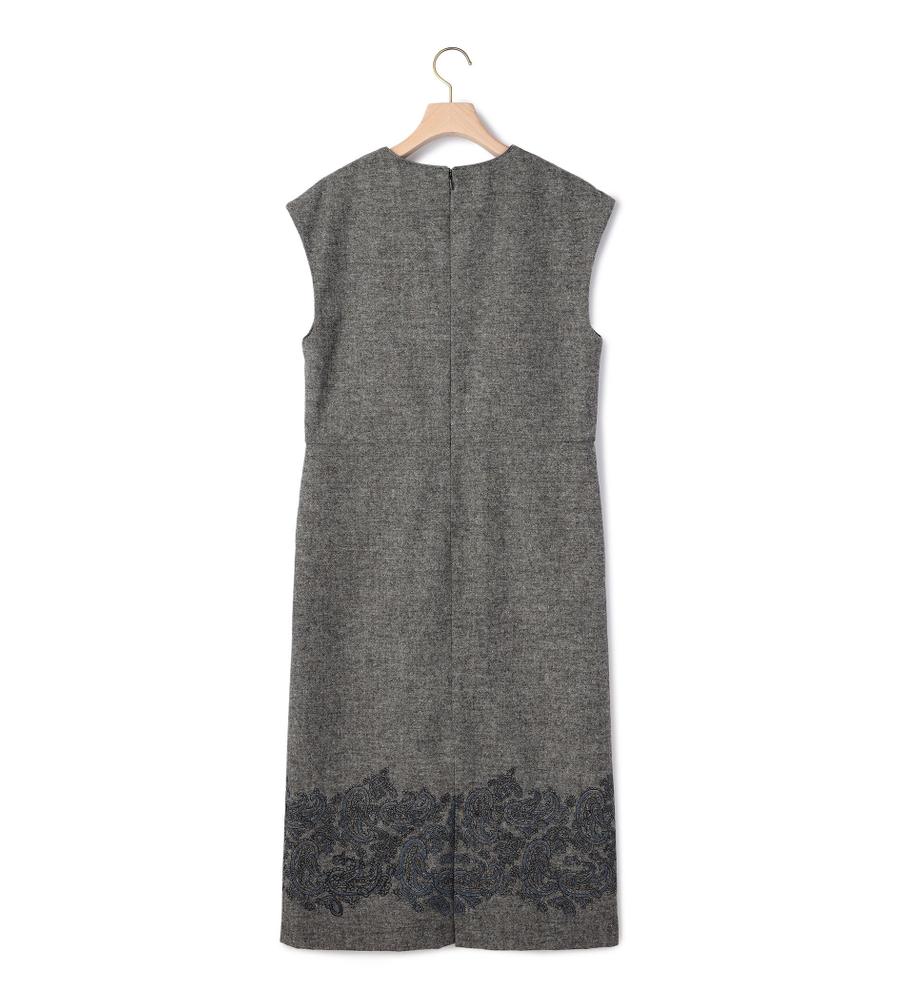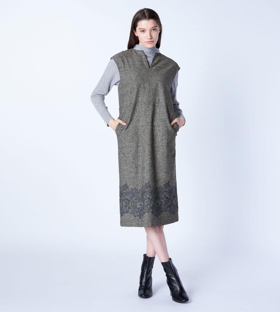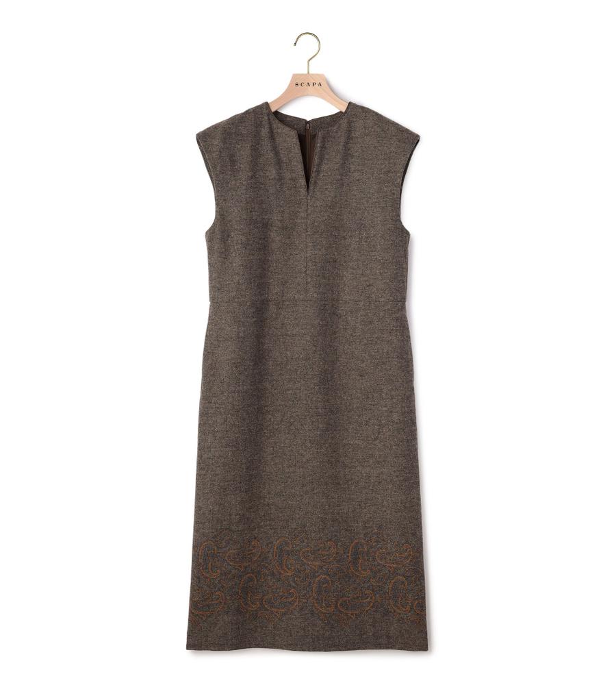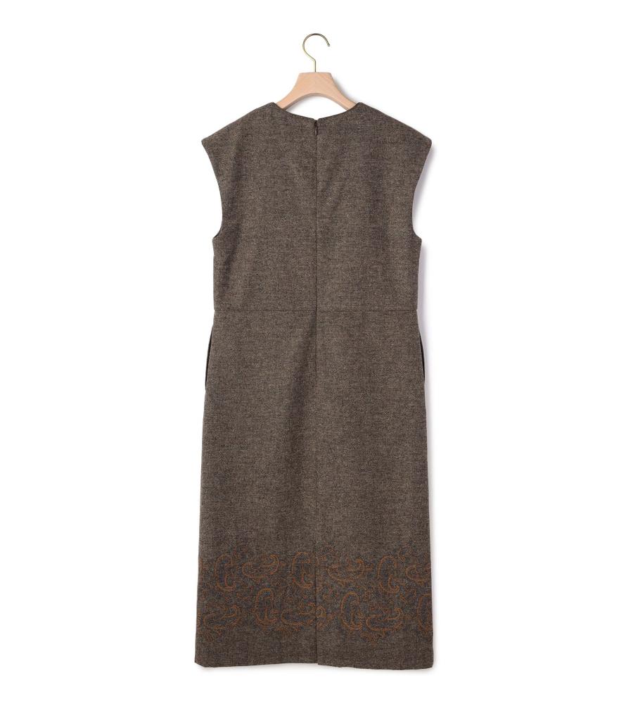 ツイード素材のスリーブレスワンピース。裾にあしらった、ペイズリー柄の刺繍デザインがポイントとなっています。ネック部分はスリット入りで、首もとにちょうど良い抜け感をプラス。一枚着でカーディガンやジャケットを羽織ったり、インにタートルニットやブラウスを重ねたり、自由なスタイリングで取り入れることができます。もたつきのないすっきりシルエットです。