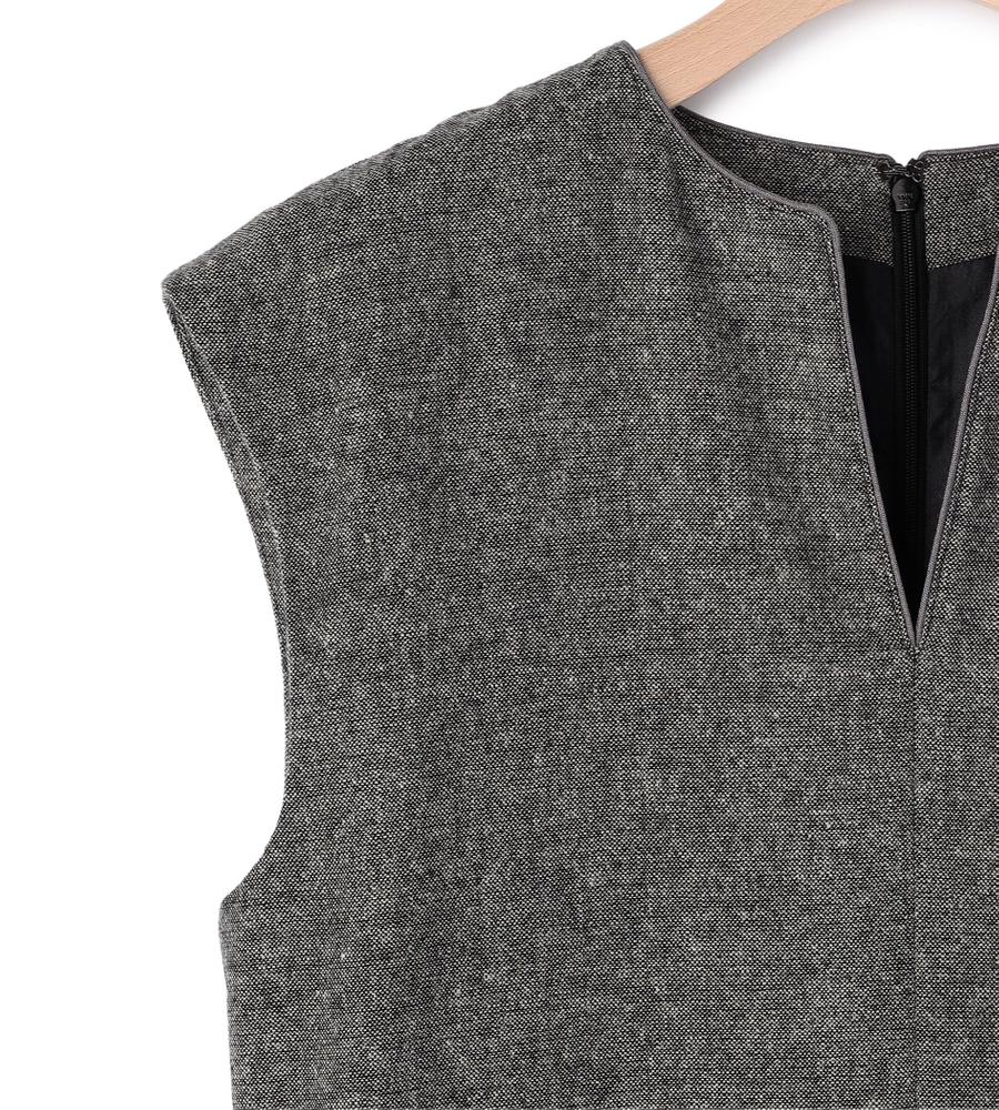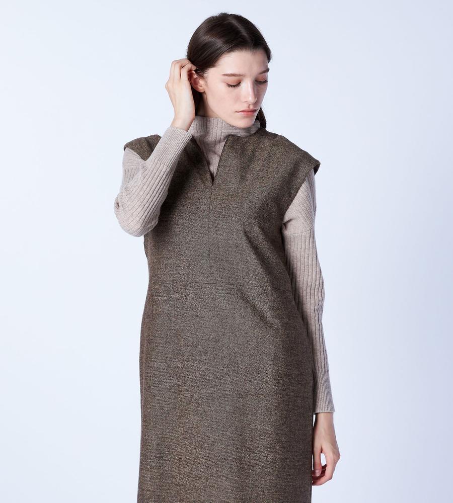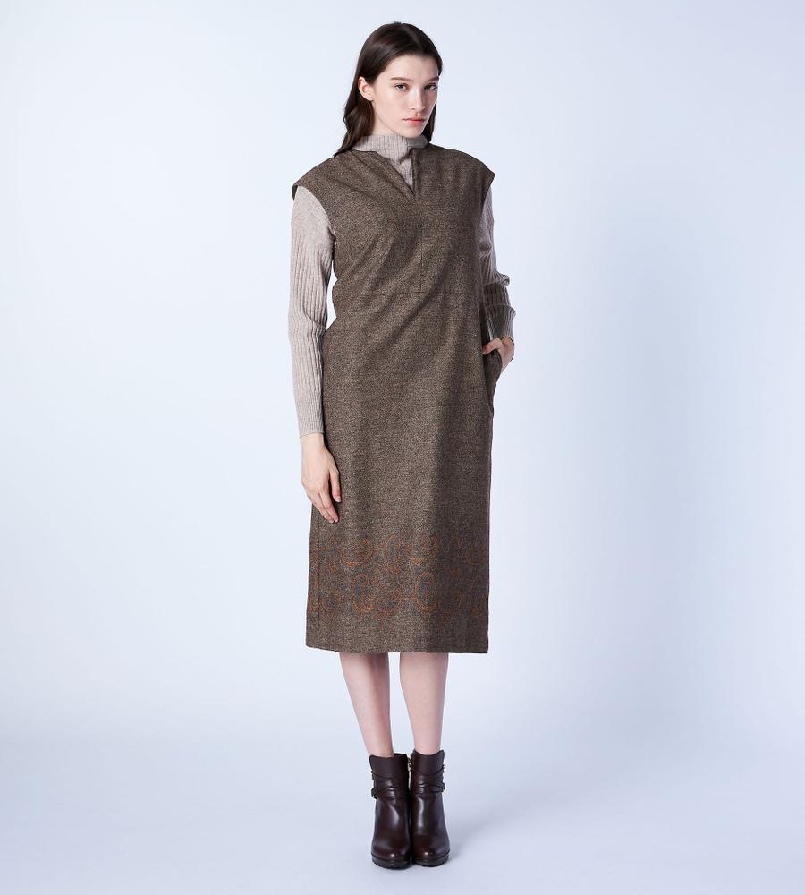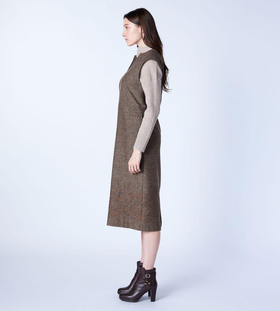 ツイード素材のスリーブレスワンピース。裾にあしらった、ペイズリー柄の刺繍デザインがポイントとなっています。ネック部分はスリット入りで、首もとにちょうど良い抜け感をプラス。一枚着でカーディガンやジャケットを羽織ったり、インにタートルニットやブラウスを重ねたり、自由なスタイリングで取り入れることができます。もたつきのないすっきりシルエットです。