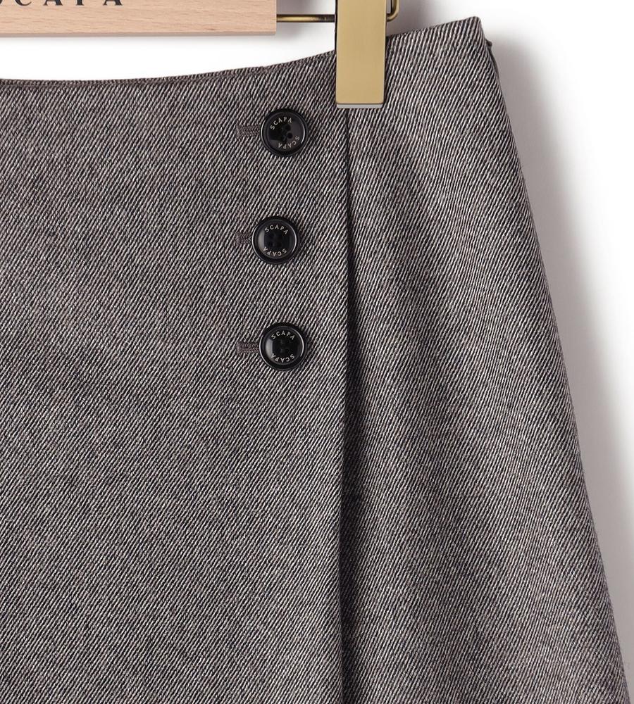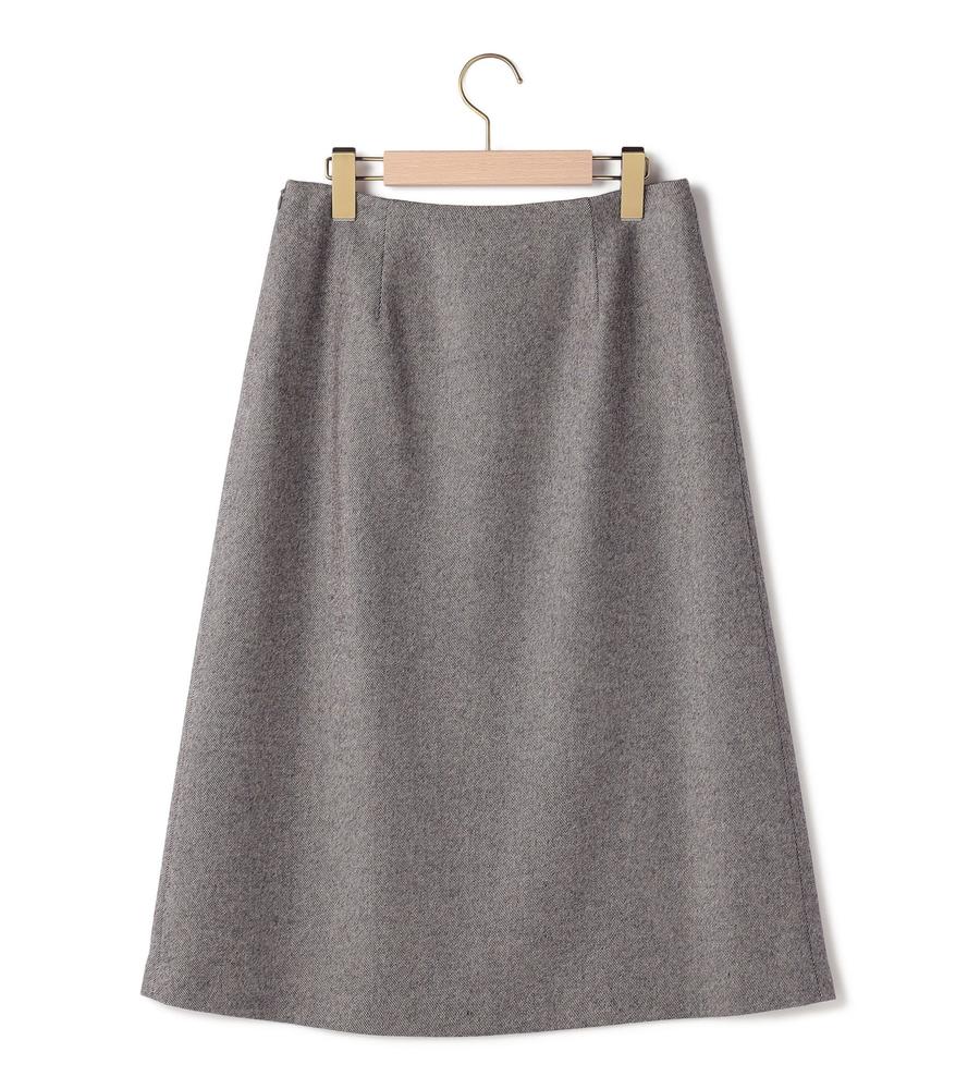 ハリ感がありシックでクラシカルなムードのあるツイルツィード生地で仕立てたミディ丈スカート。巻きスカート風のデザインのフロントとブランドオリジナルのロゴ入りボタンのアクセントがスタイリッシュなデザインポイント。お手持ちのトップスに合わせて、エレガントな着こなしが叶うアイテムです。