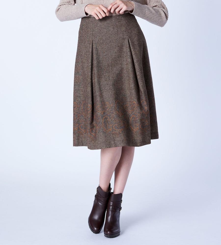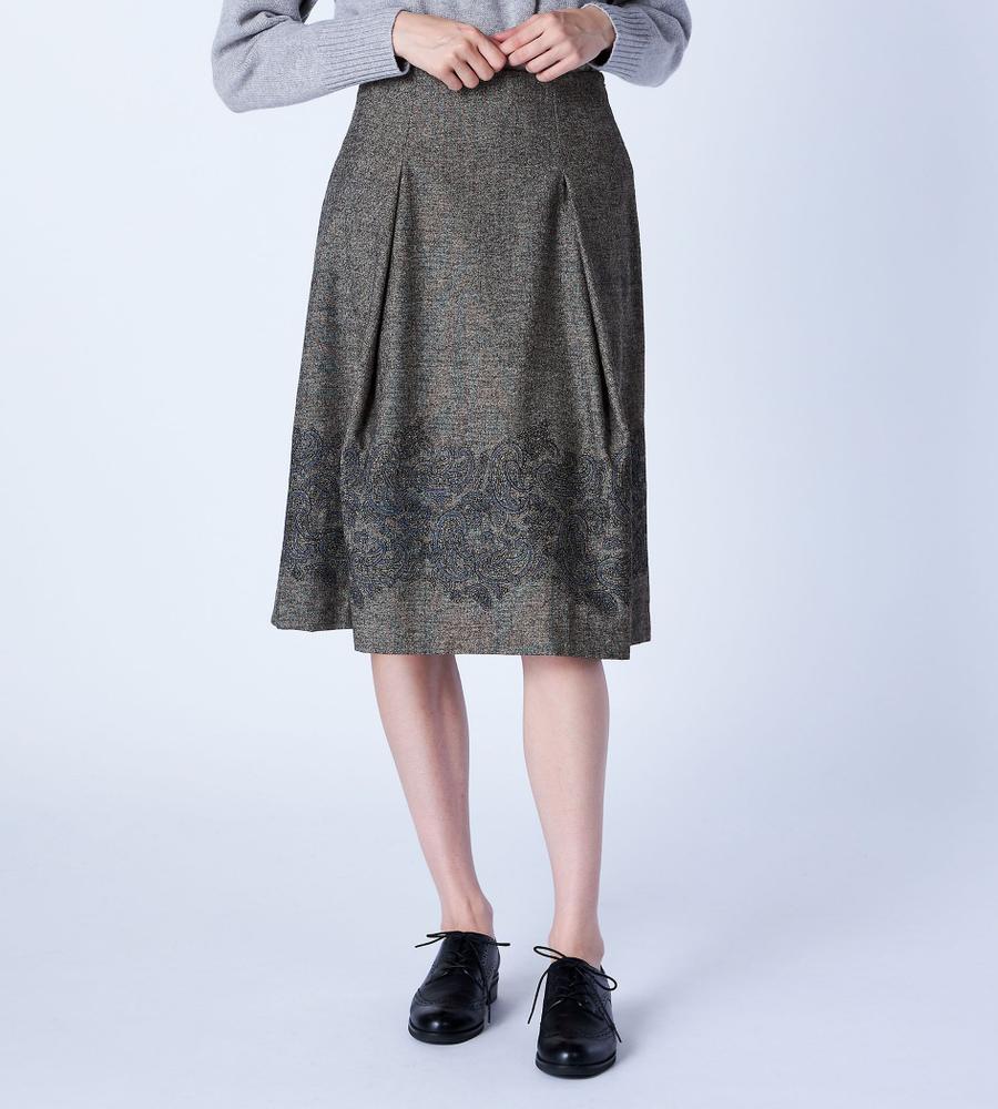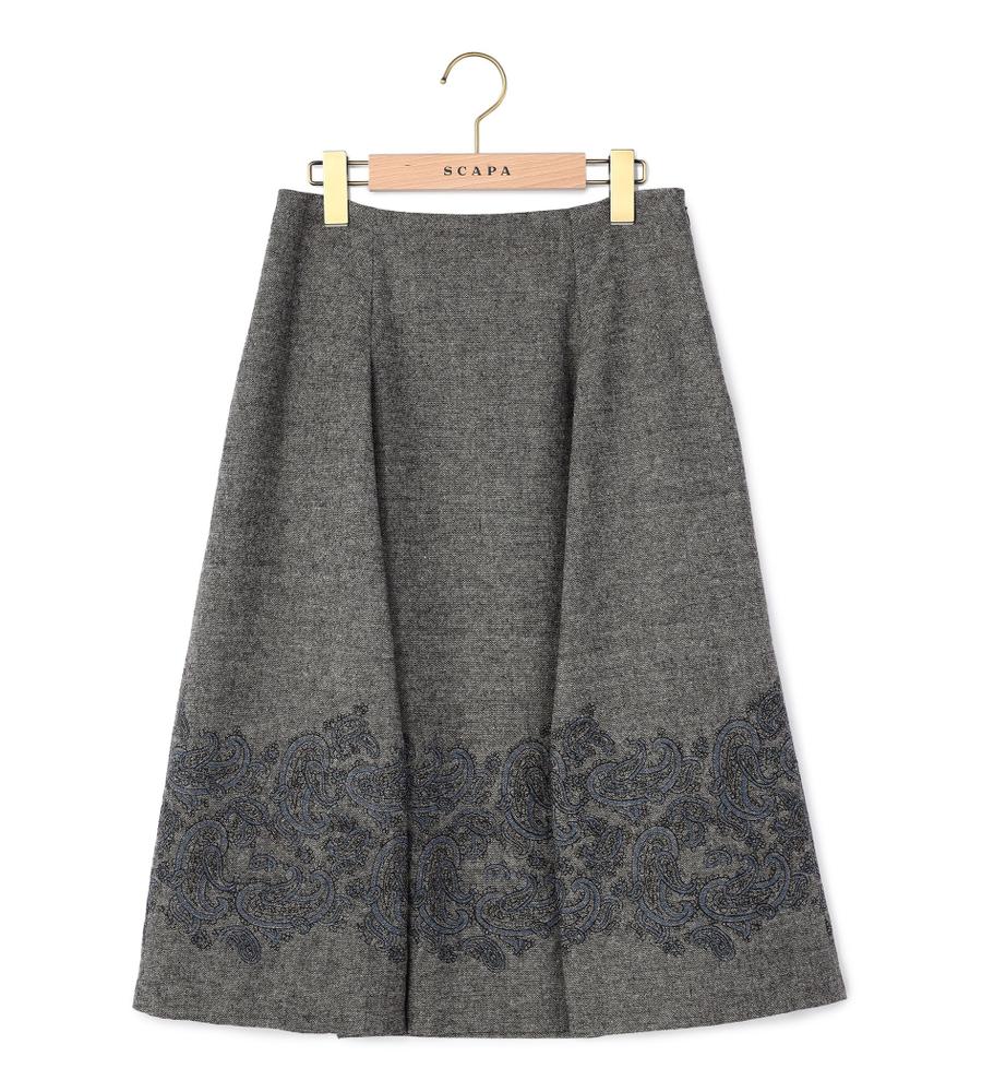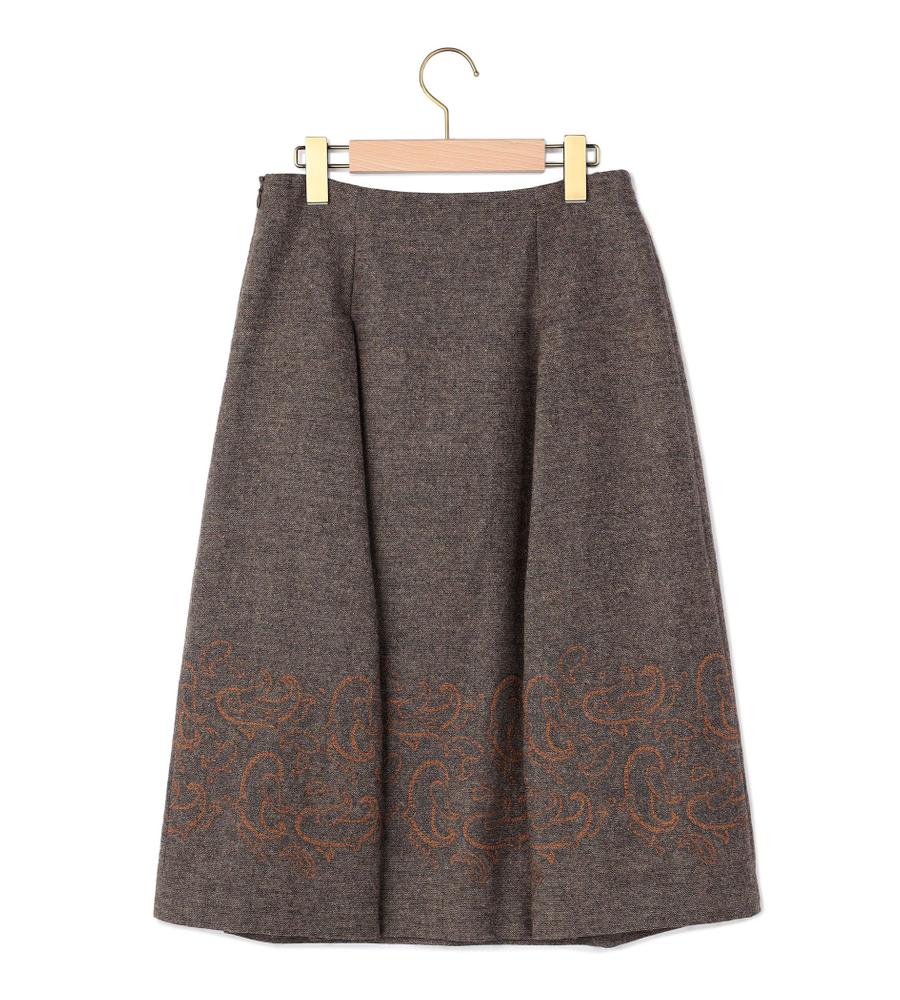 毛混のウォーミーな素材を用いたスカート。プリーツを入れることで、優美なドレープと量感が生まれる仕立て。スタイリングに気品と大人の可愛らしさをもたらす1点です。特筆すべきは裾に大きく配した、繊細で華やかなエンブロイダリー。手の込んだ意匠で、上質な秋冬コーデを完成させるアイテムです。