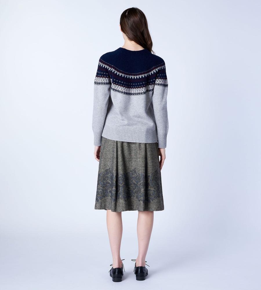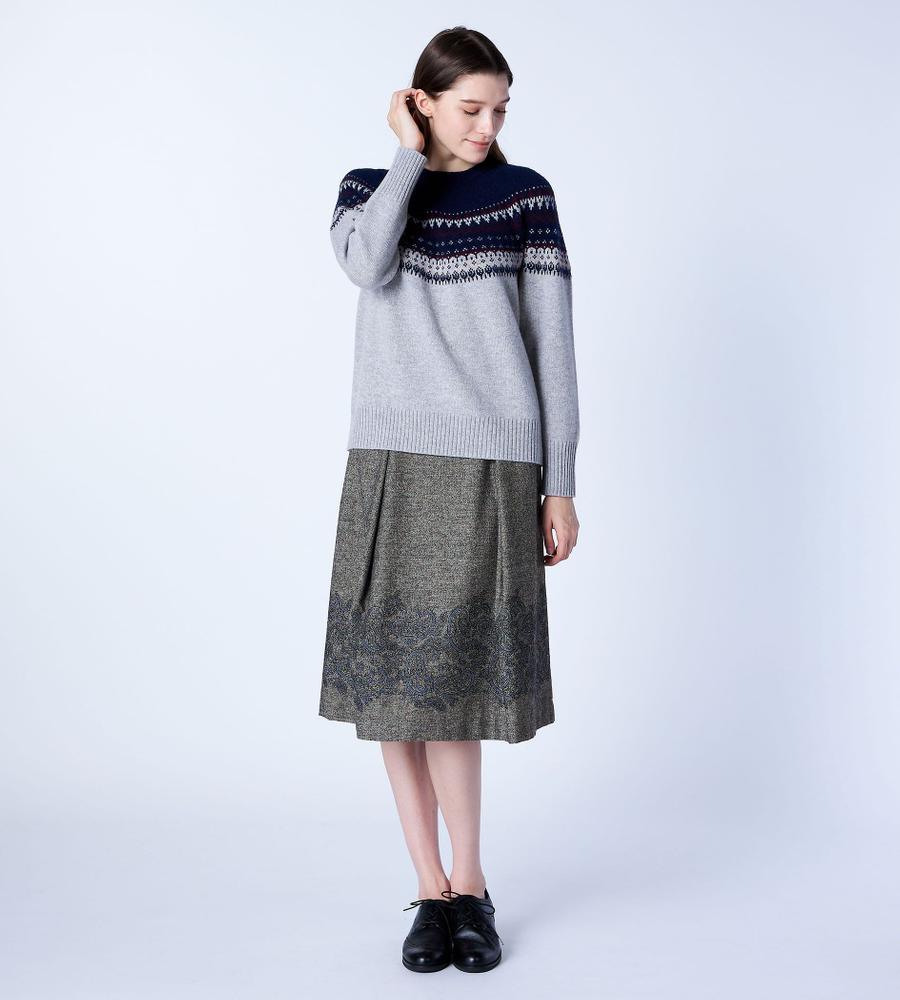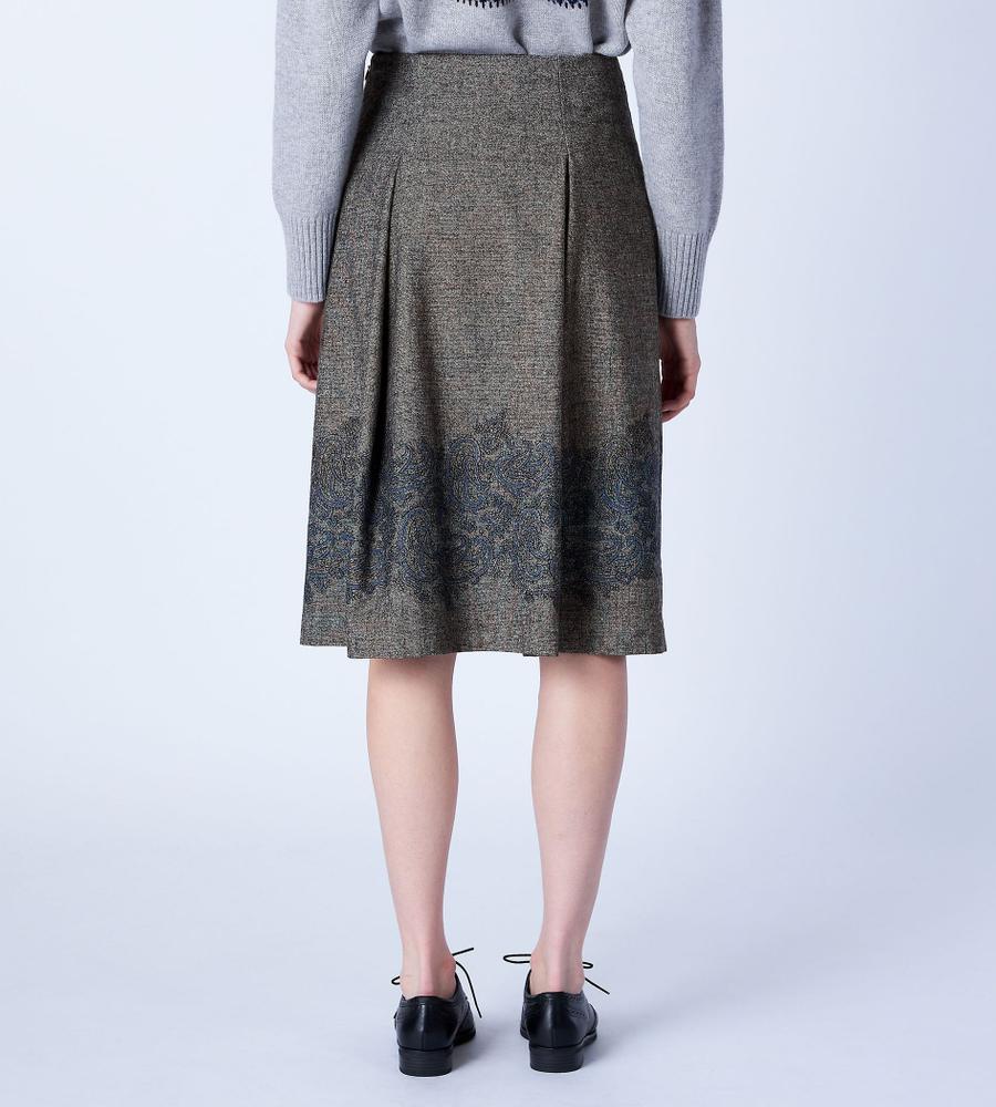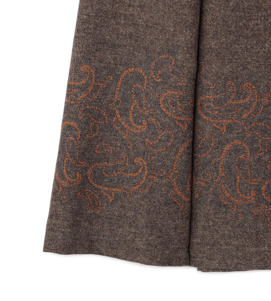 毛混のウォーミーな素材を用いたスカート。プリーツを入れることで、優美なドレープと量感が生まれる仕立て。スタイリングに気品と大人の可愛らしさをもたらす1点です。特筆すべきは裾に大きく配した、繊細で華やかなエンブロイダリー。手の込んだ意匠で、上質な秋冬コーデを完成させるアイテムです。