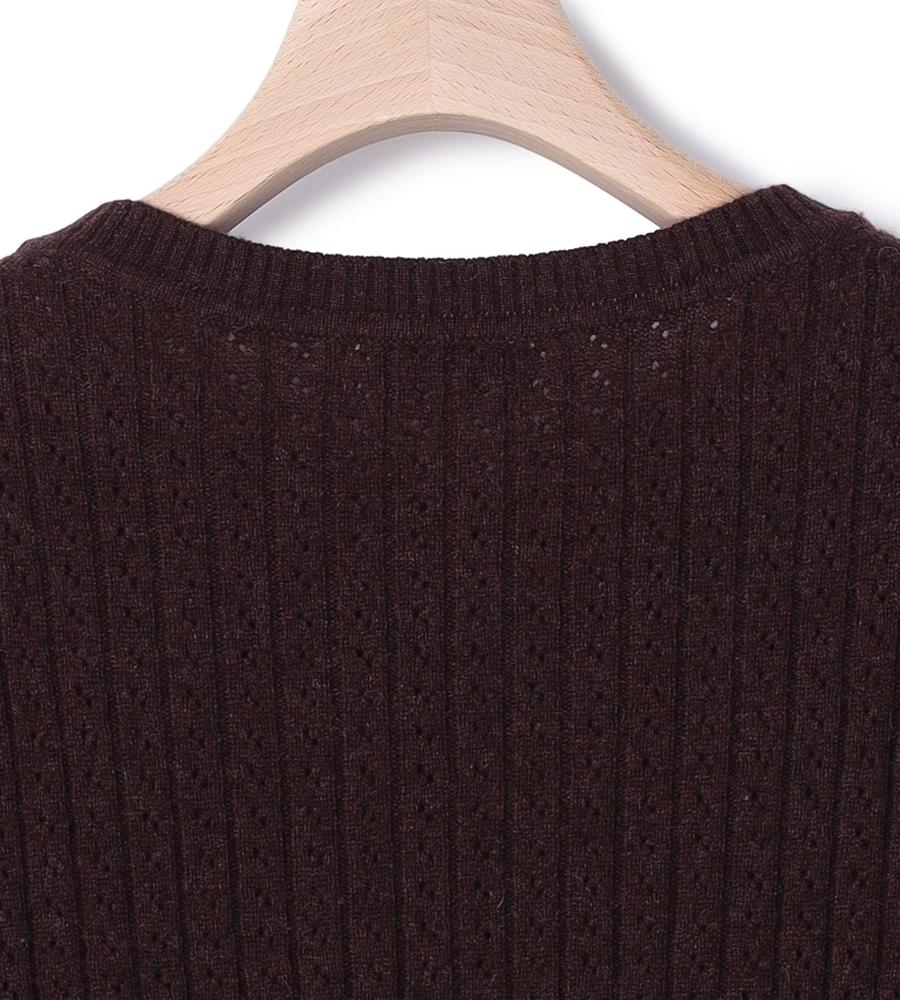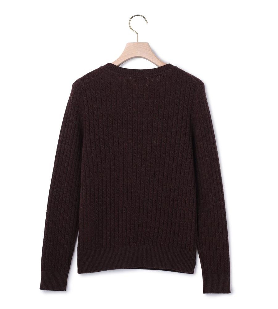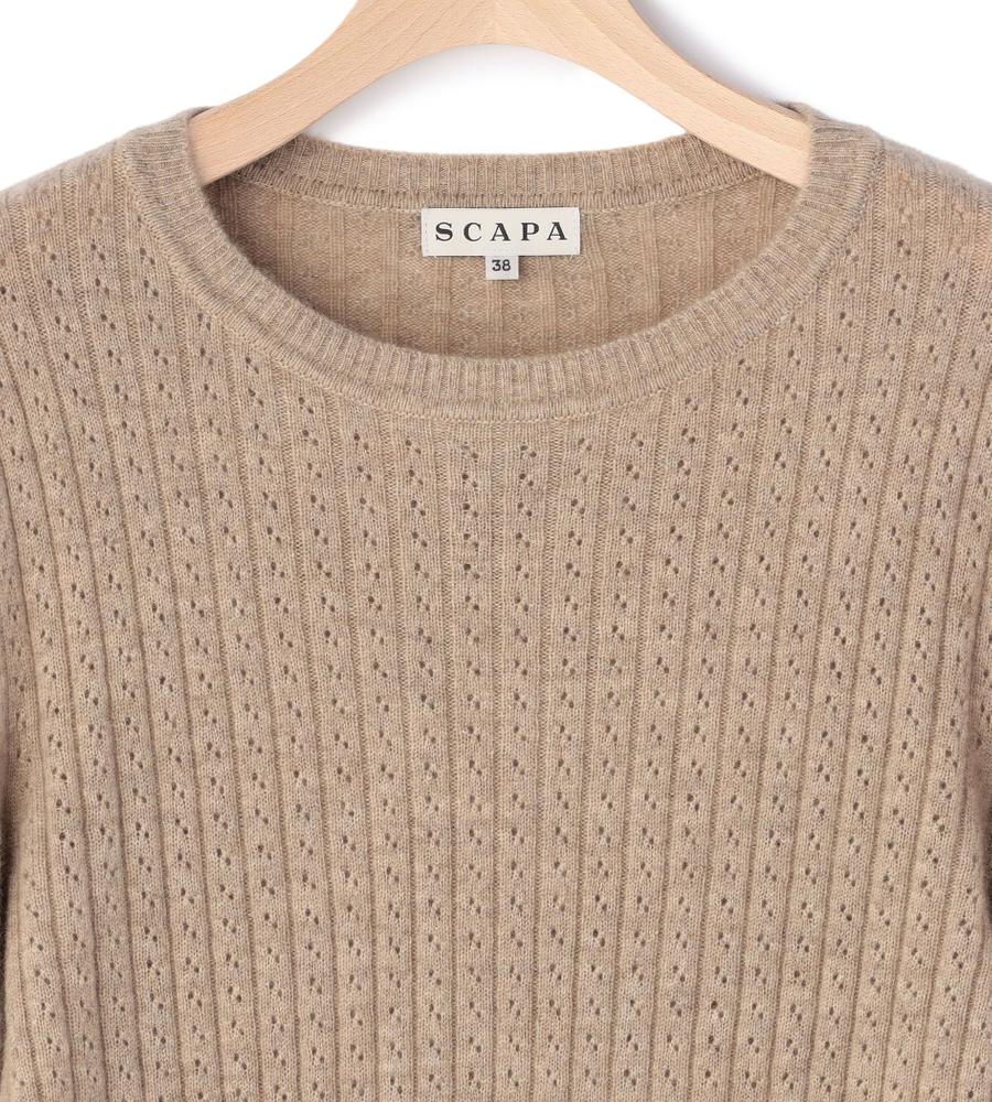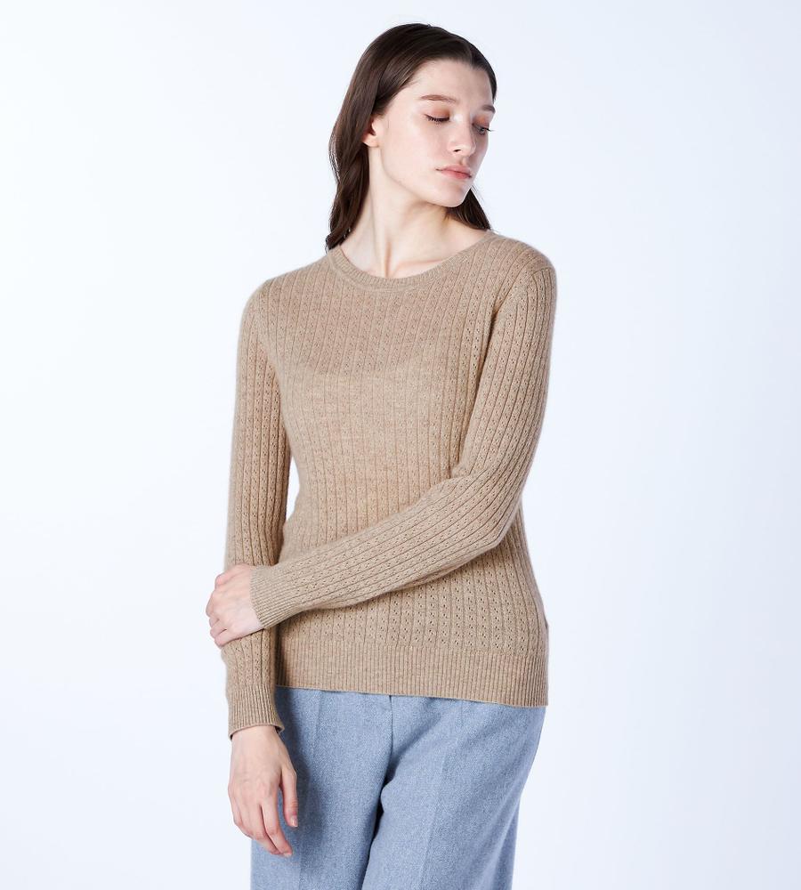 カシミヤをふんだんに用いたニットトップス。レースのような模様が浮かぶ編地で、上質ながらも大人の女性らしい気品を備えた1点です。身体にすっきりと寄り添うシルエットは、ジャケットなどのインナーにも最適。1枚使いでしっかり暖かさを実感できる、頼もしいアイテムです。ネックラインが開きすぎていないのもきちんとした印象で楽しめるポイント。