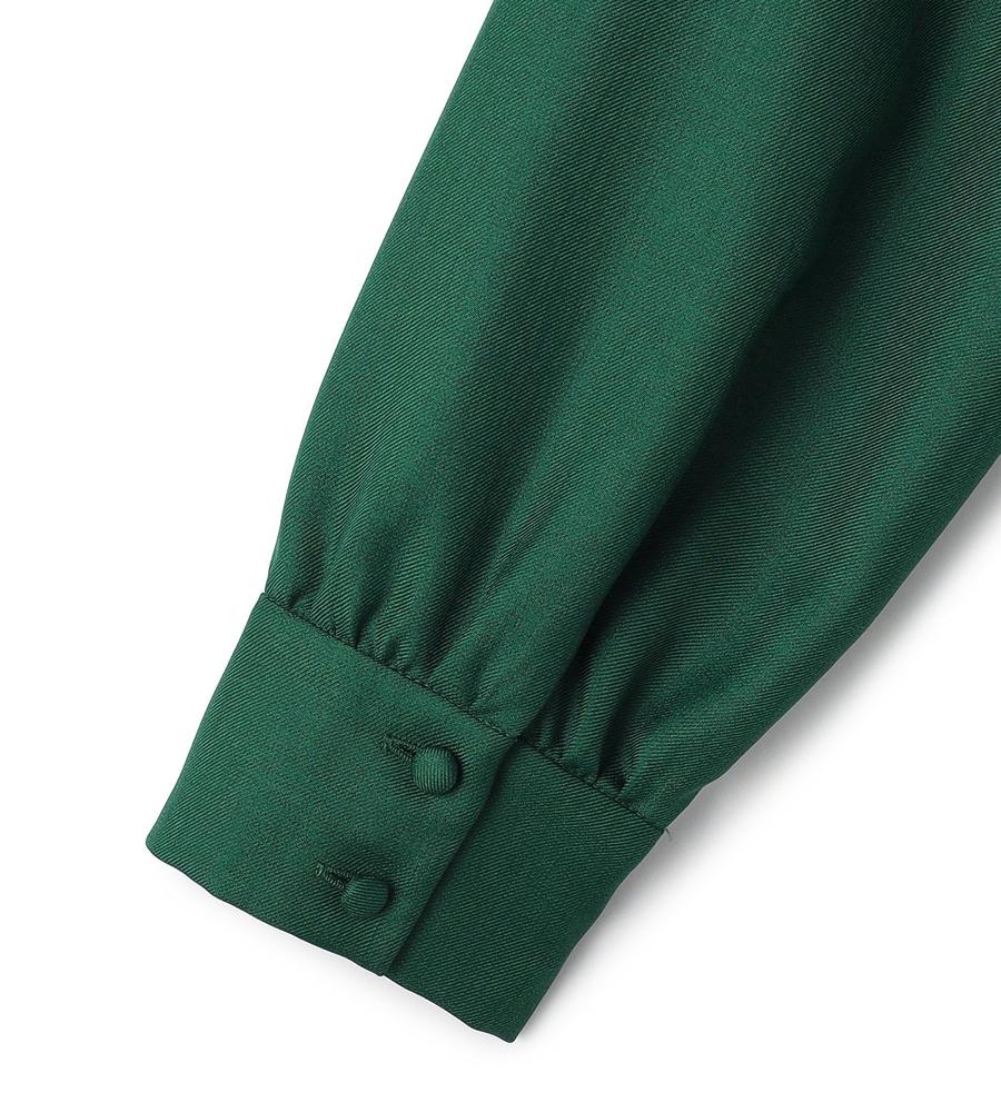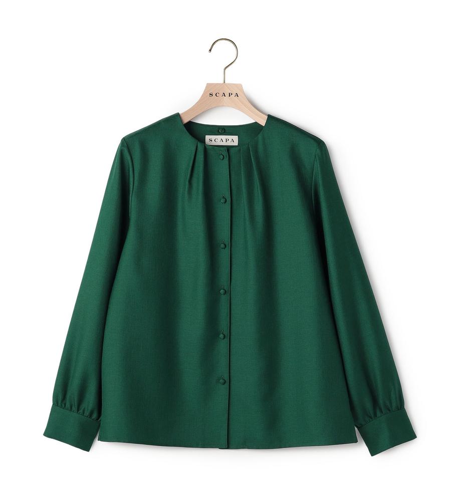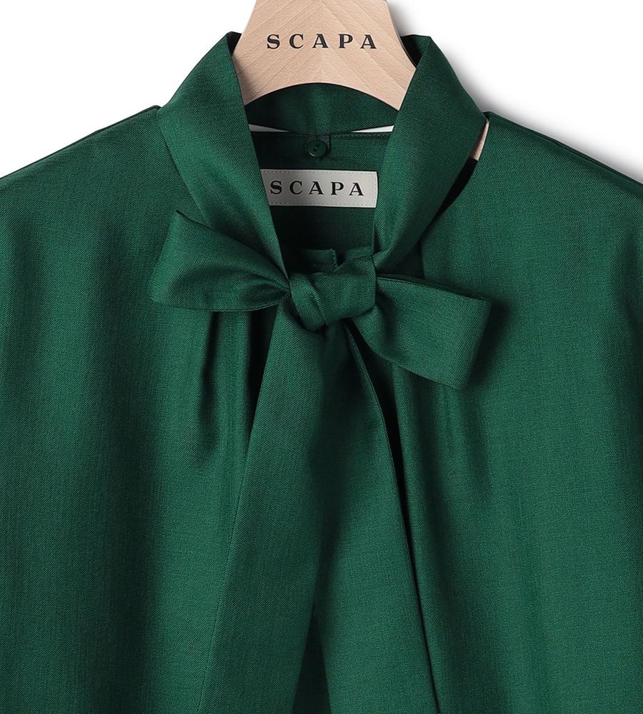 取り外し可能なボウタイリボン付きの長袖ブラウス。ボウタイを外すとノーカーラーのすっきりとしたデザインになり、異なる2つの雰囲気の着こなしを楽しめるアイテム。フロントのコロンとしたくるみボタンもデザインポイント。お出かけにはもちろん、フォーマルなシーンにも映えるエレガントな一枚です。