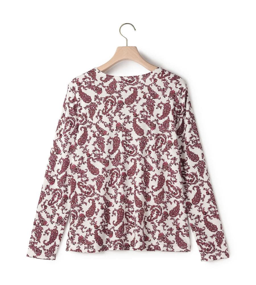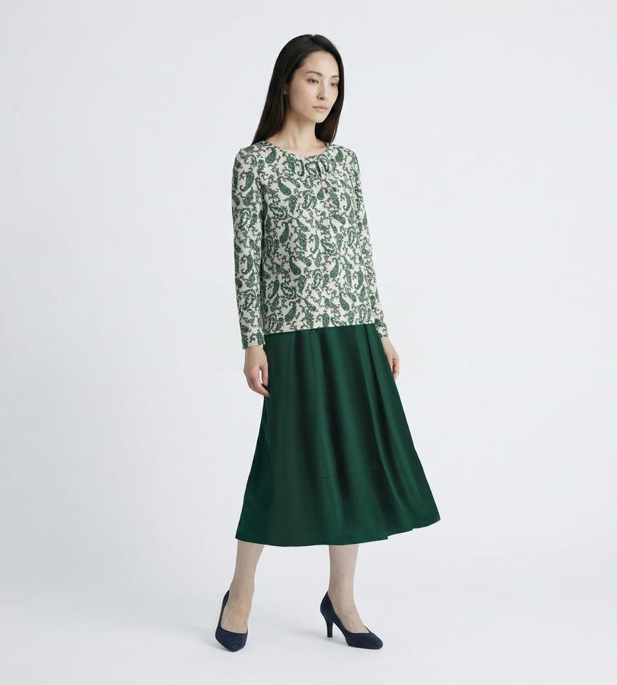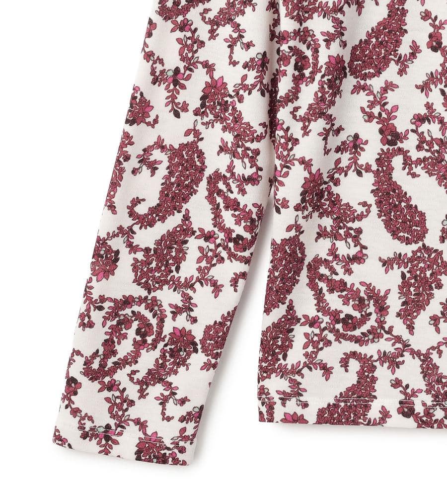 プティットフルール(小さな花)の総柄プリントが華やかなデザインのクルーネック長袖カットソー。首元のタックが立体感のあるドレープを作り、フェミニンな雰囲気を演出。毛混合のあたたかみのある肌触りで秋冬シーズンにぴったり。一枚で、または重ね着でコーディネートの幅が広がるアイテムです。