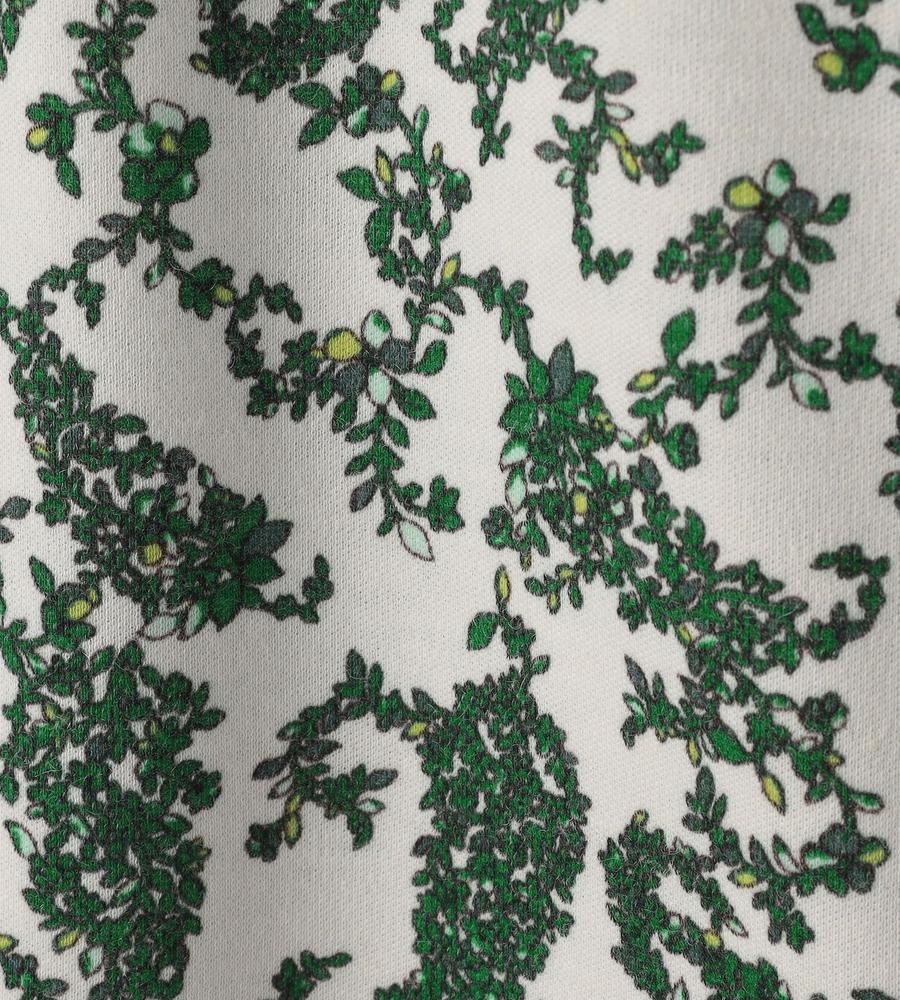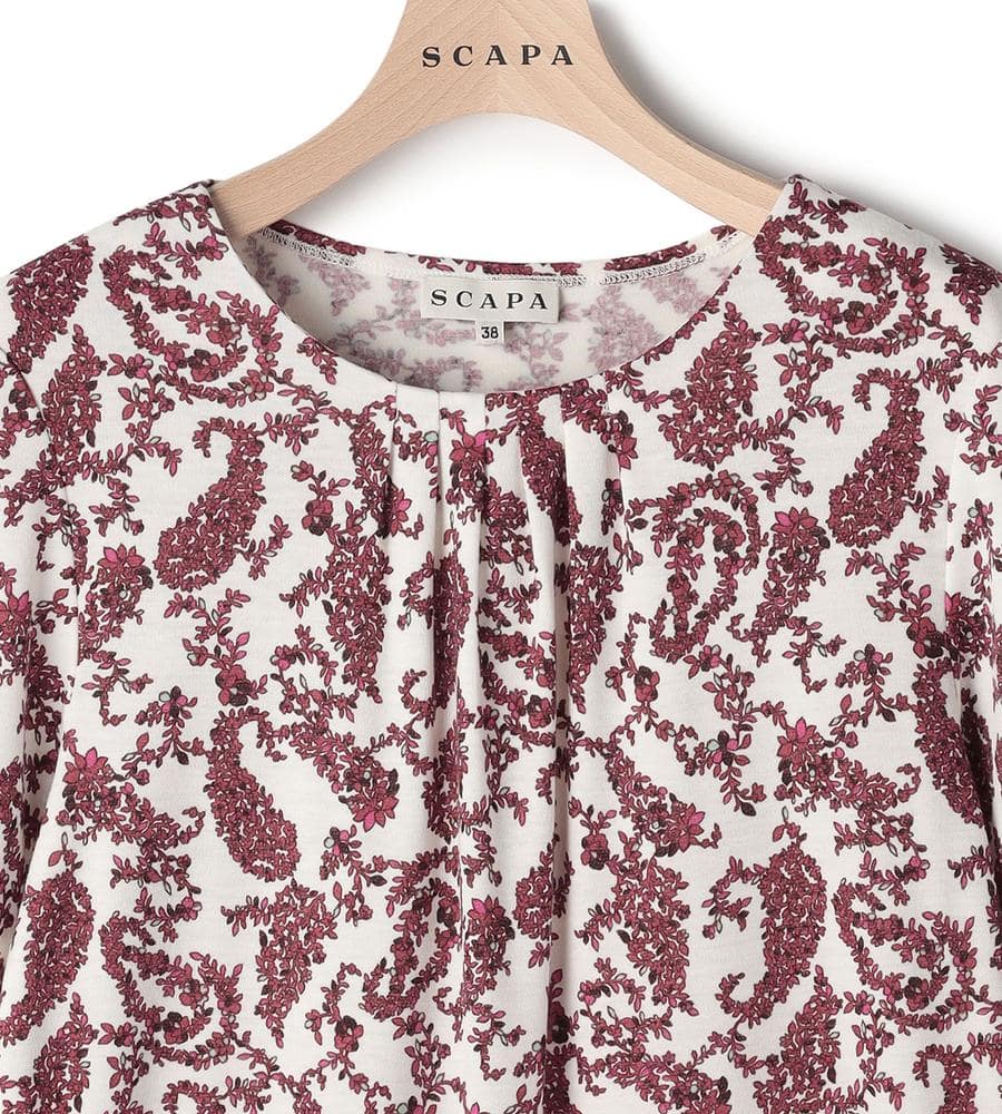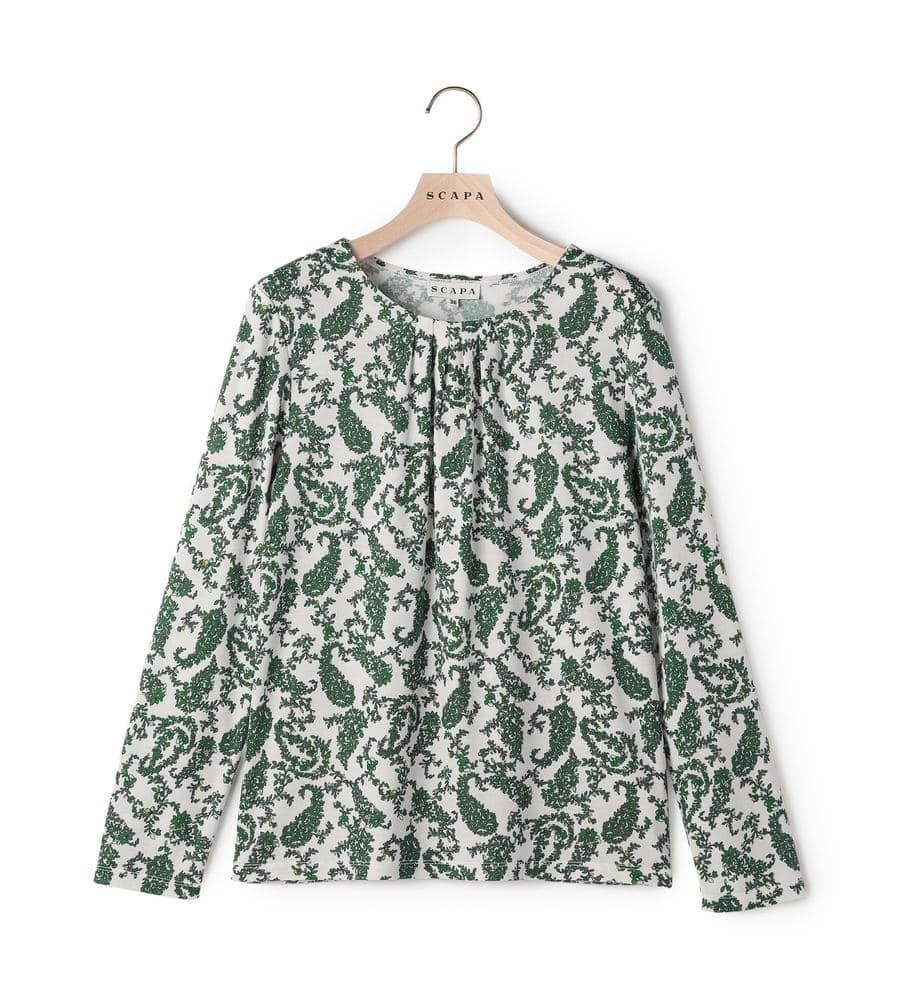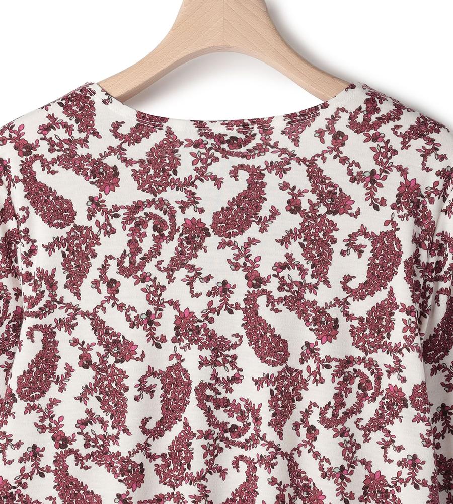プティットフルール(小さな花)の総柄プリントが華やかなデザインのクルーネック長袖カットソー。首元のタックが立体感のあるドレープを作り、フェミニンな雰囲気を演出。毛混合のあたたかみのある肌触りで秋冬シーズンにぴったり。一枚で、または重ね着でコーディネートの幅が広がるアイテムです。