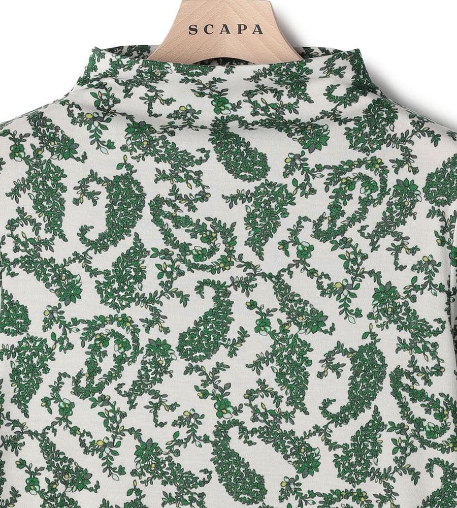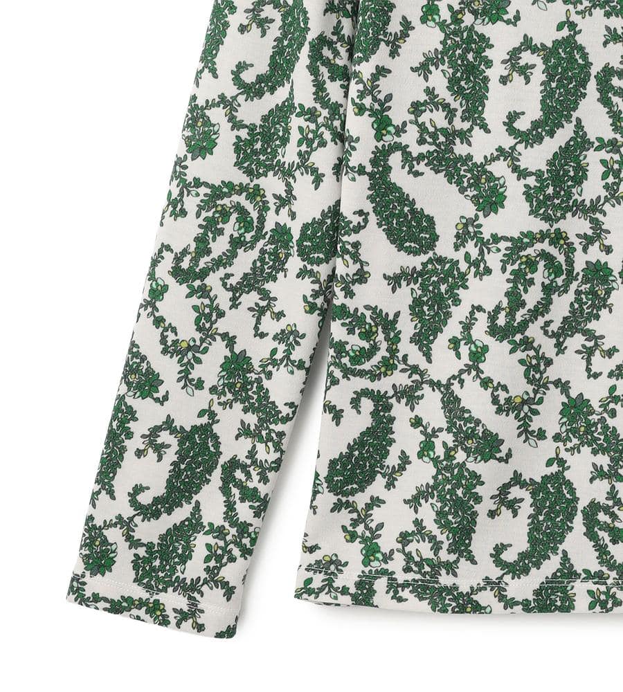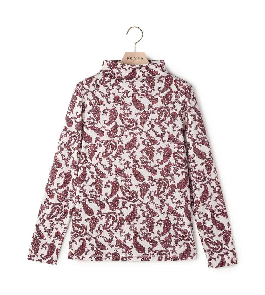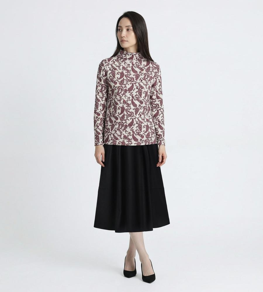 プティットフルール(小さな花)の総柄プリントが華やかなデザインのボトルネック長袖カットソー。首元のタックが立体感のあるドレープを作り、フェミニンな雰囲気を演出。毛混合のあたたかみのある肌触りで秋冬シーズンにぴったり。一枚で、または重ね着でコーディネートの幅が広がるアイテムです。