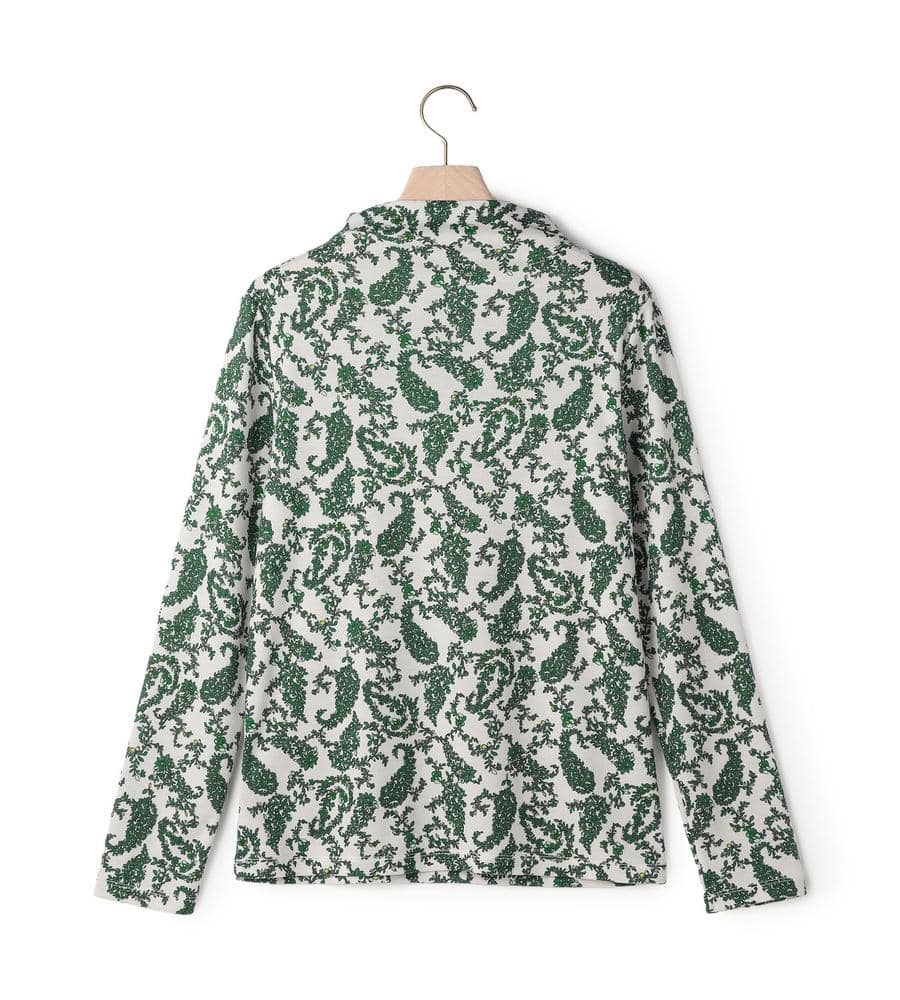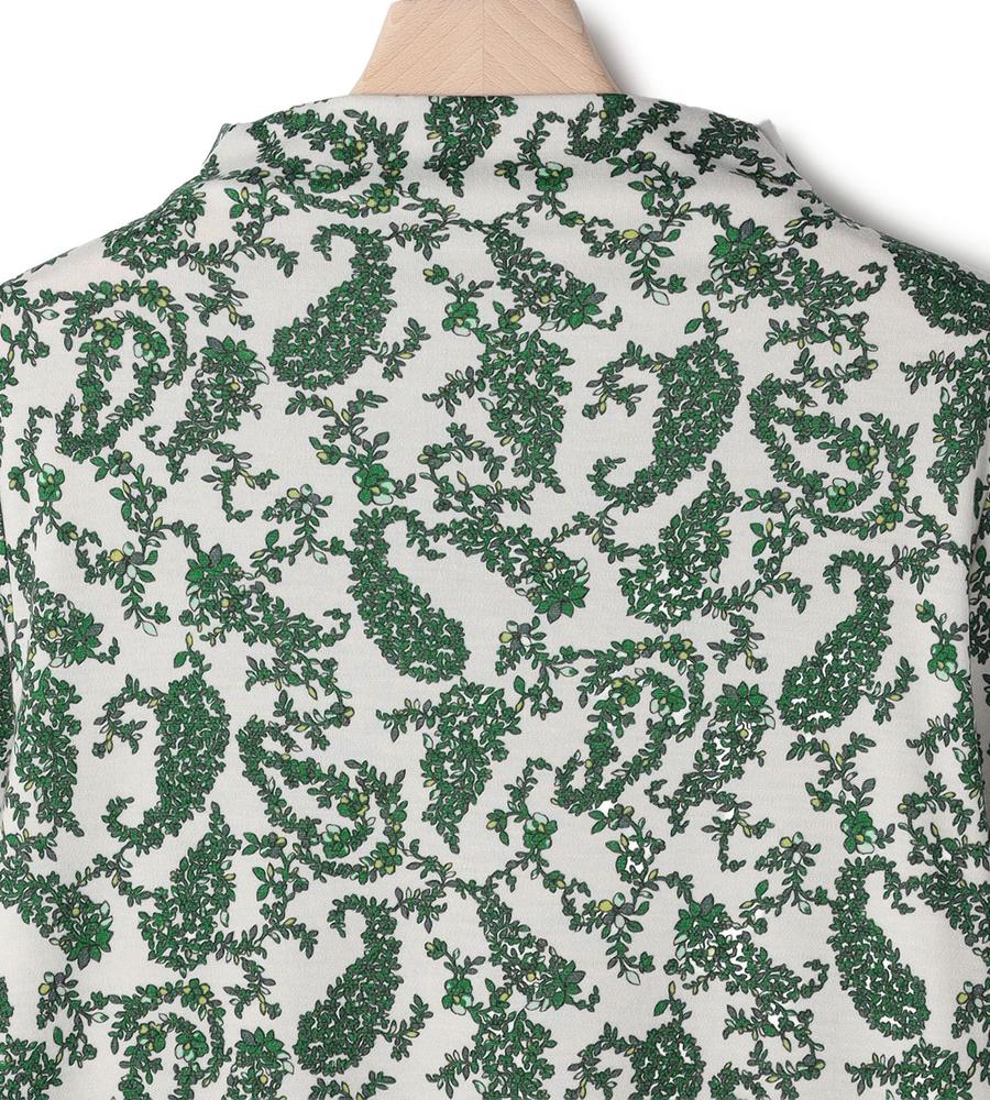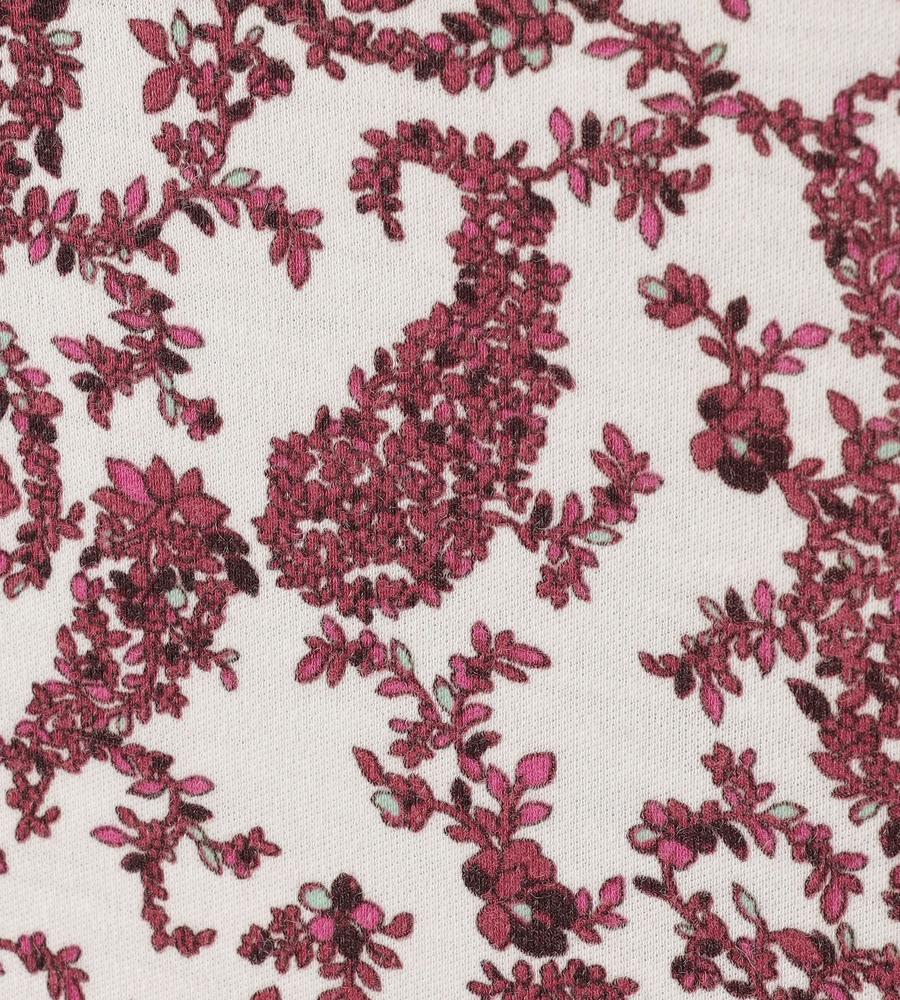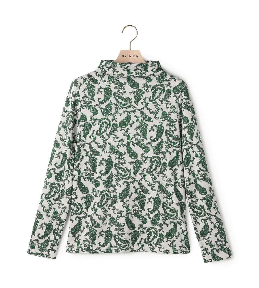 プティットフルール(小さな花)の総柄プリントが華やかなデザインのボトルネック長袖カットソー。首元のタックが立体感のあるドレープを作り、フェミニンな雰囲気を演出。毛混合のあたたかみのある肌触りで秋冬シーズンにぴったり。一枚で、または重ね着でコーディネートの幅が広がるアイテムです。