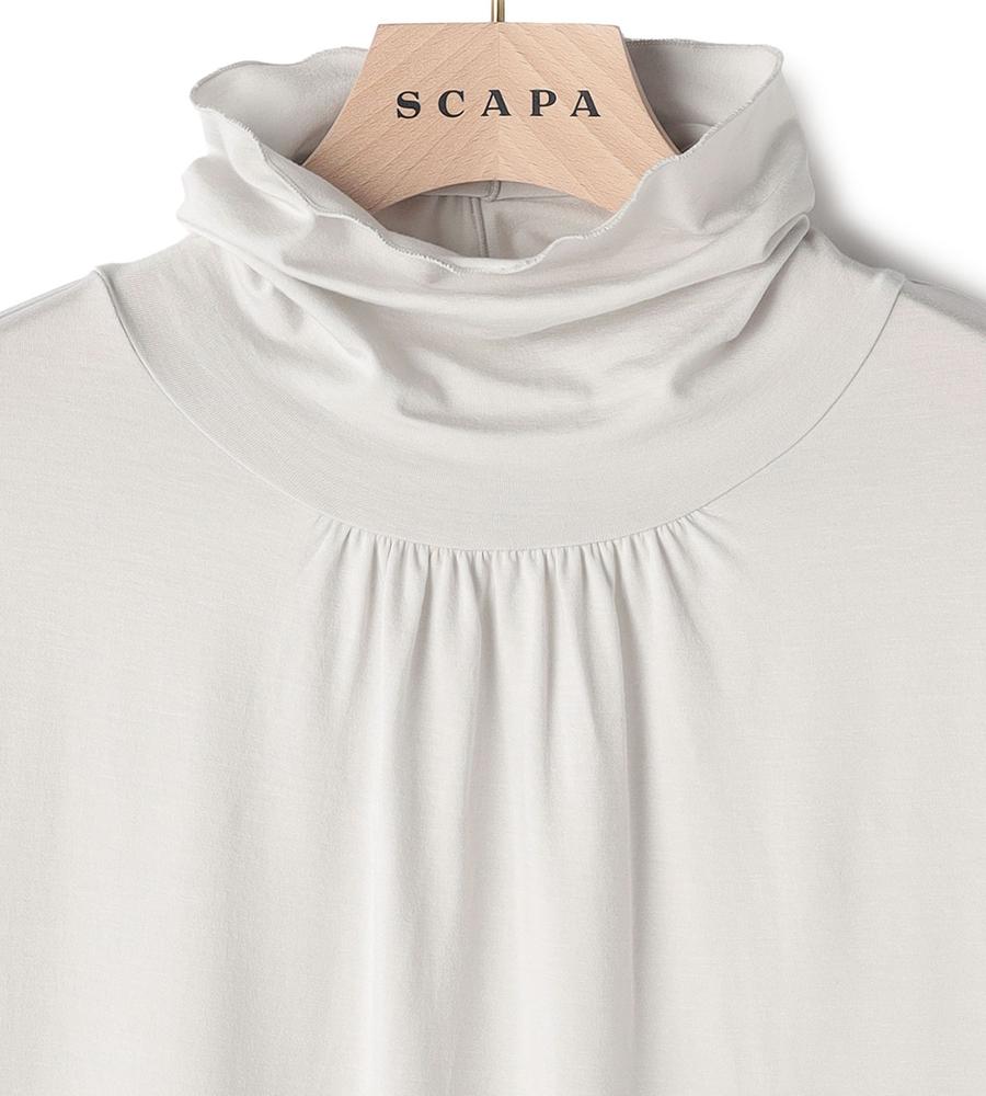 くしゅっとしたハイネックがエレガントなデザインの長袖カットソー。胸元のギャザーもおしゃれなデザインポイント。ストレッチ仕様で体の動きにフィットし、快適な着心地なのも嬉しいポイント。重ね着にも便利なライトウェイトですっきりとしたシルエット。デイリーに活躍するシンプルなデザインのアイテムです。