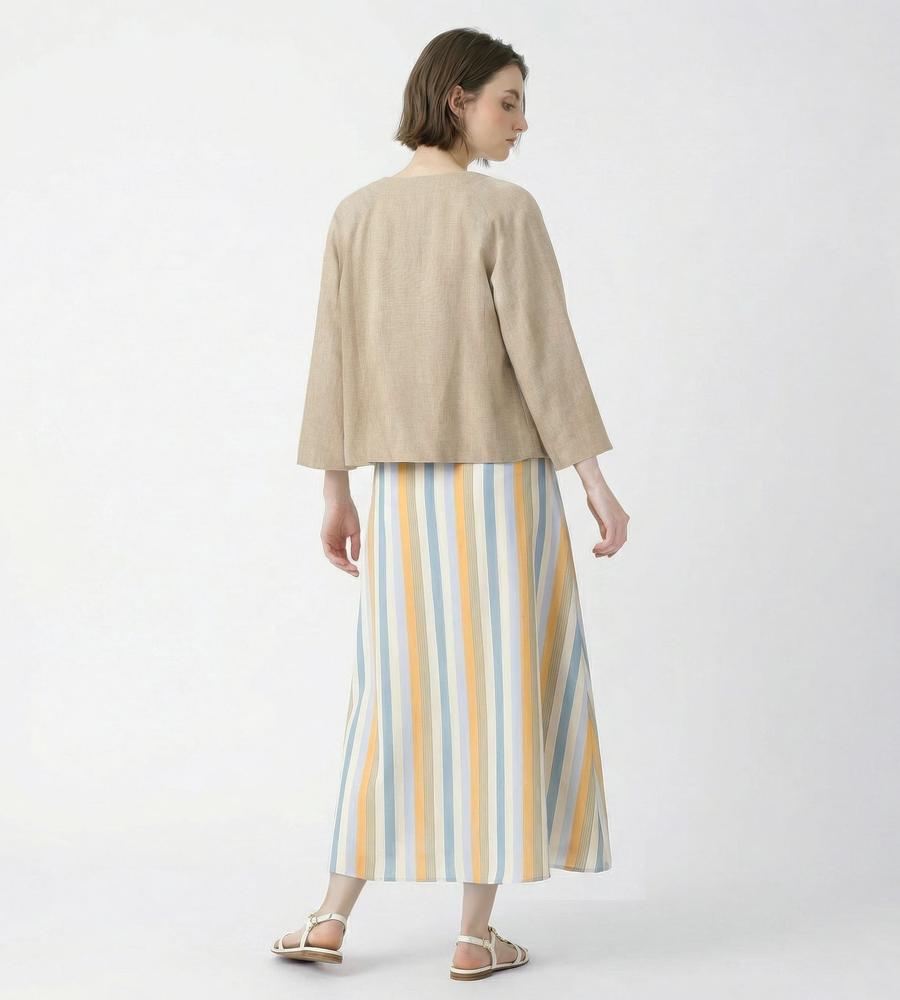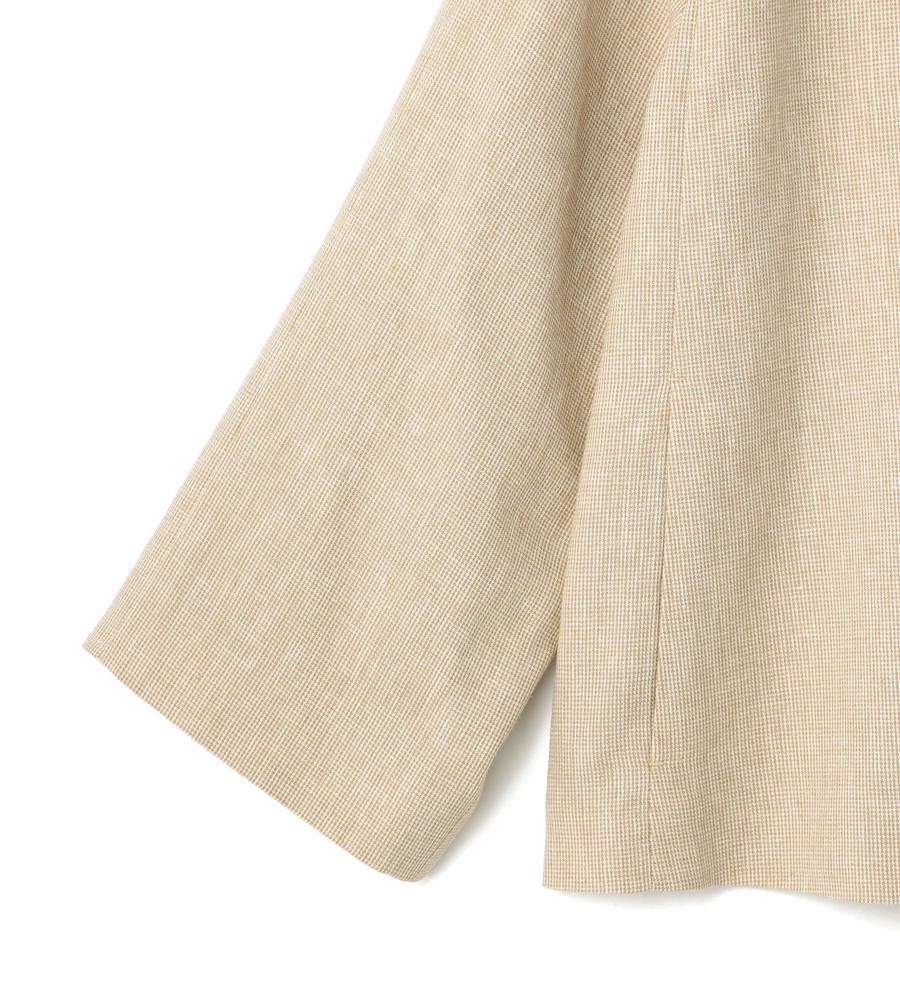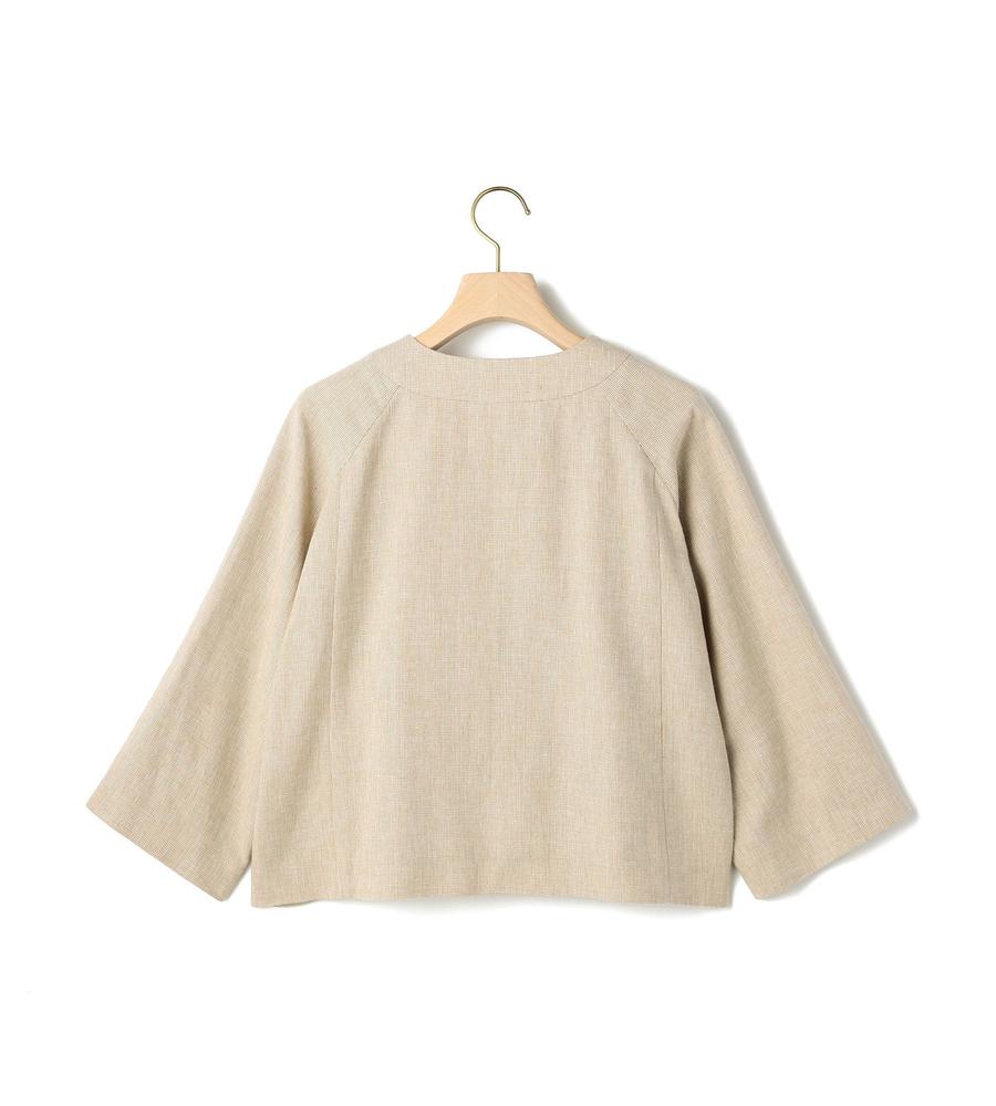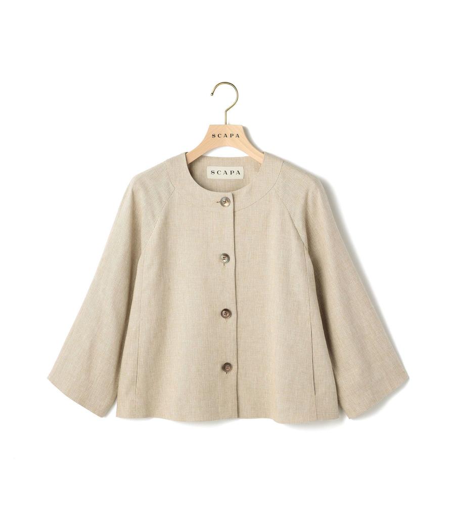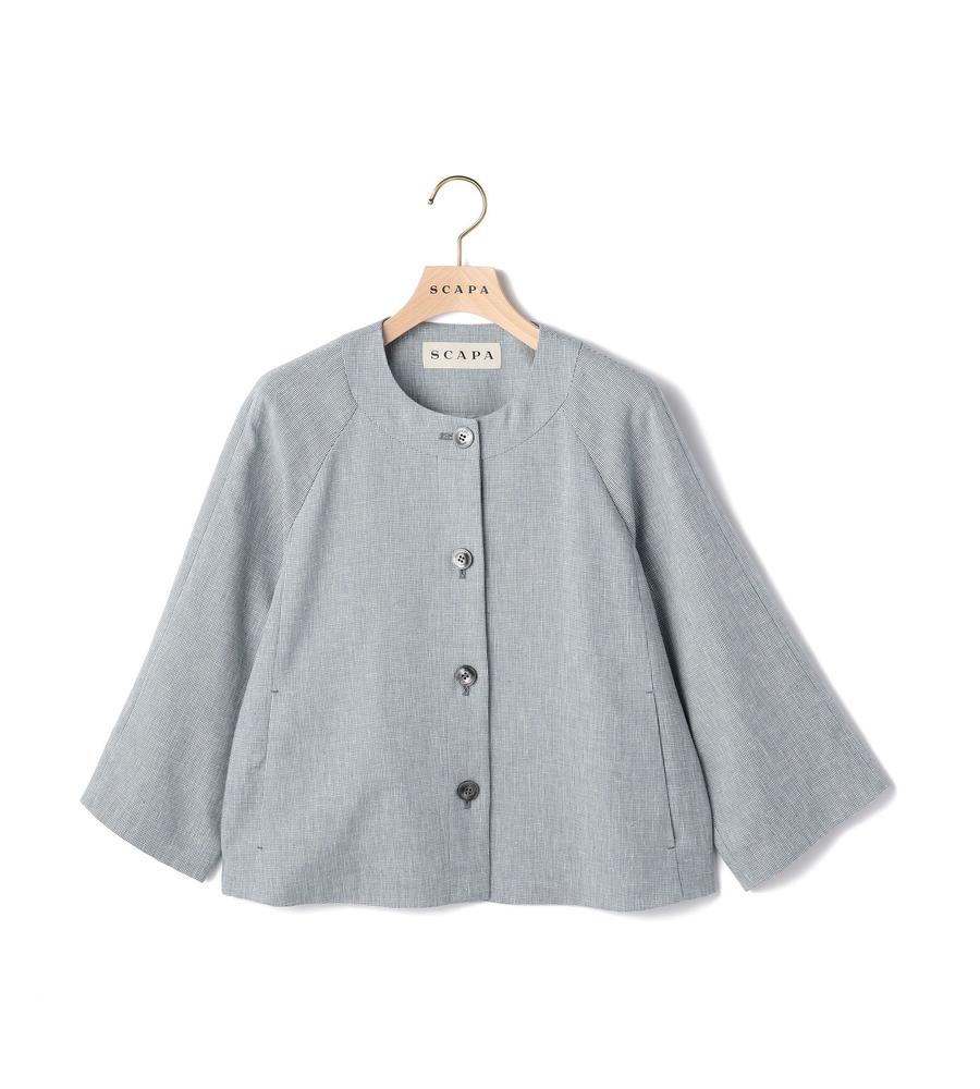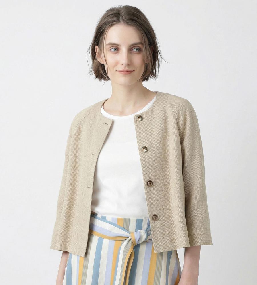 女性らしくリラックスした表情を作れるノーカラージャケット。適度なゆとりで羽織りやすく、すっきりした着丈でスタイル良くきまるのもうれしい。日差しのある日にも心地良い、さらりとした質感になっています。