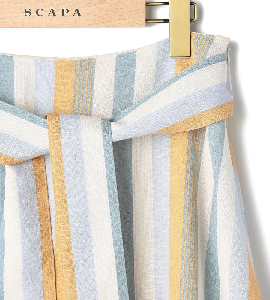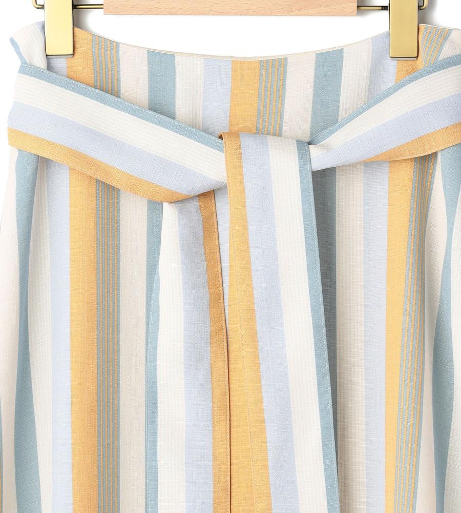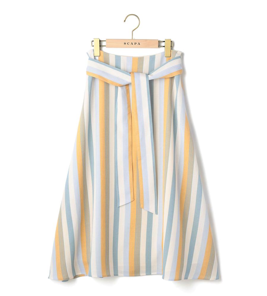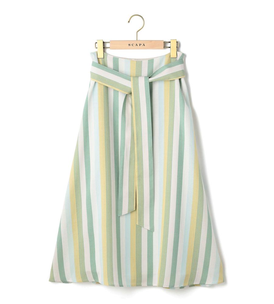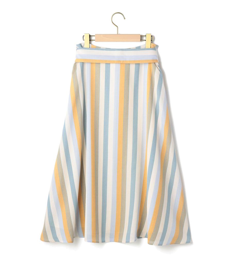 着こなしの主役になるマルチストライプ柄スカート。共布ベルト付属なので、トップスをインしてもサマになります。モダンなタウンスタイルも、華やかなリゾートスタイルもお任せな一枚。
