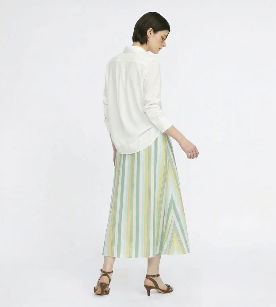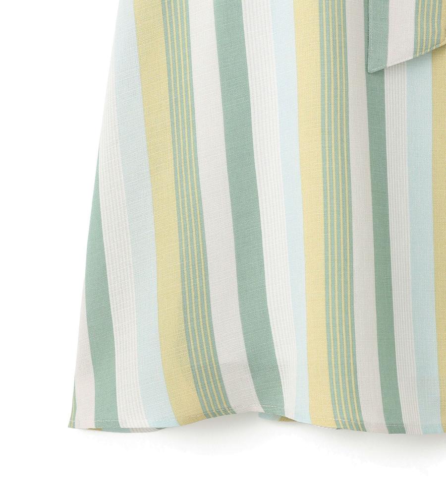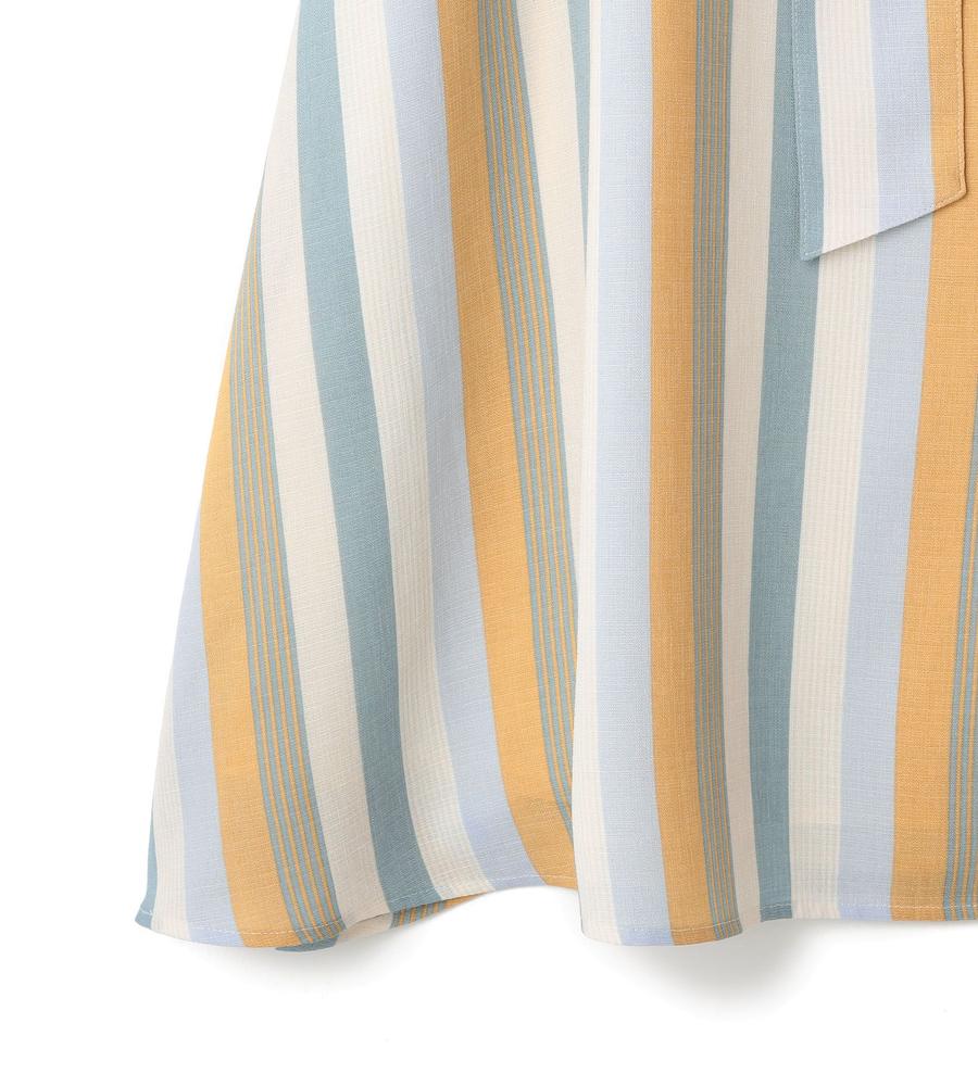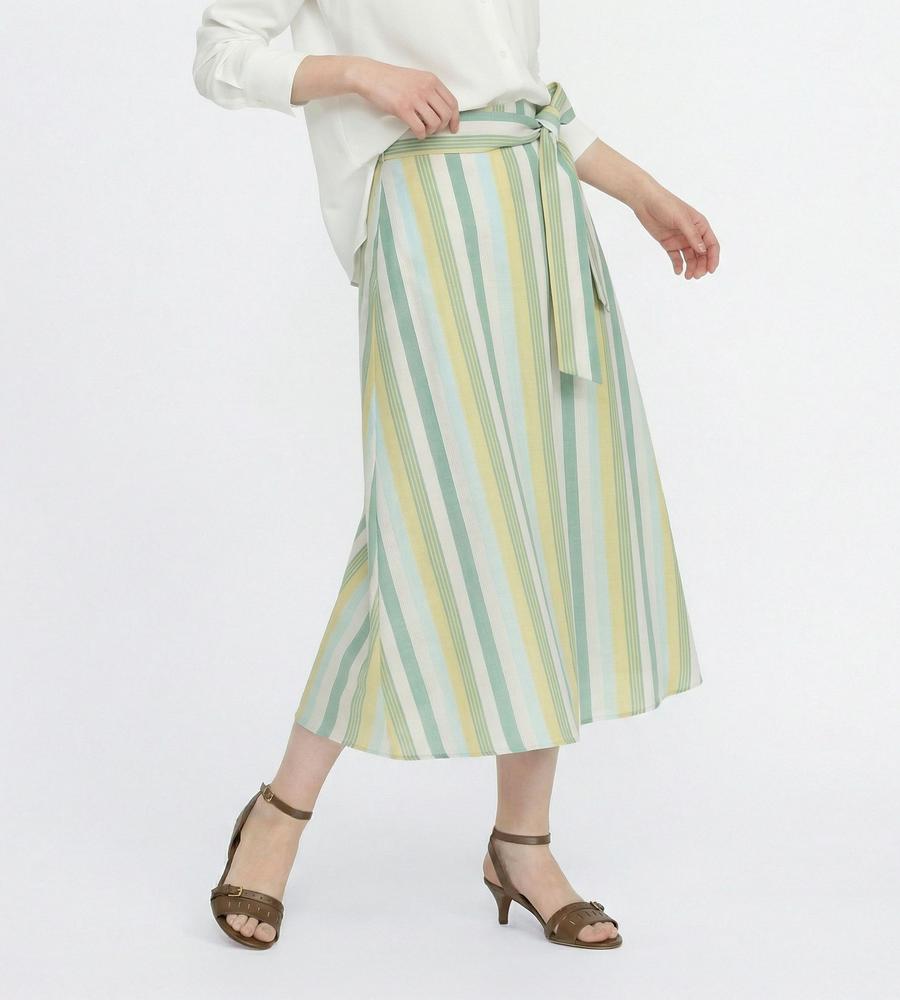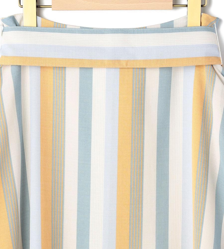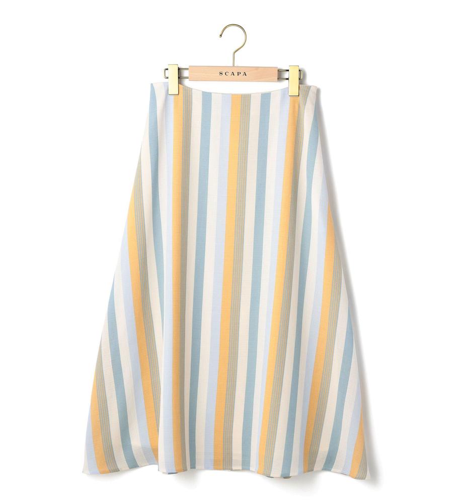 着こなしの主役になるマルチストライプ柄スカート。共布ベルト付属なので、トップスをインしてもサマになります。モダンなタウンスタイルも、華やかなリゾートスタイルもお任せな一枚。