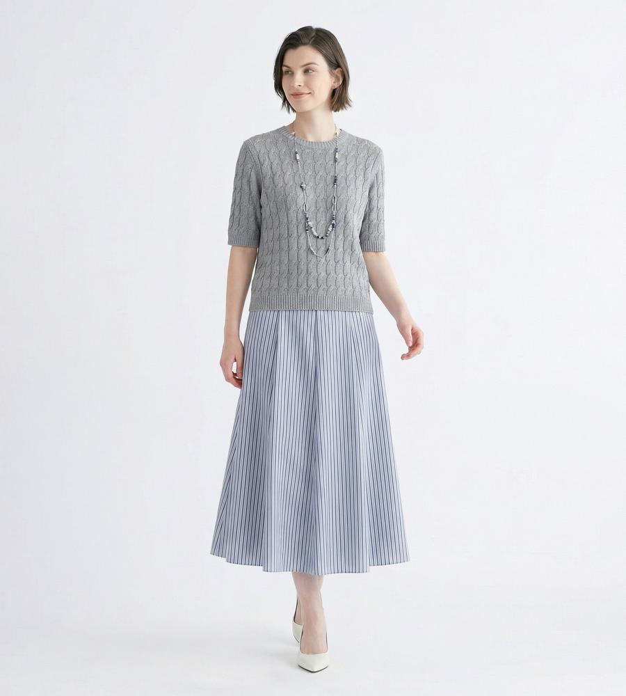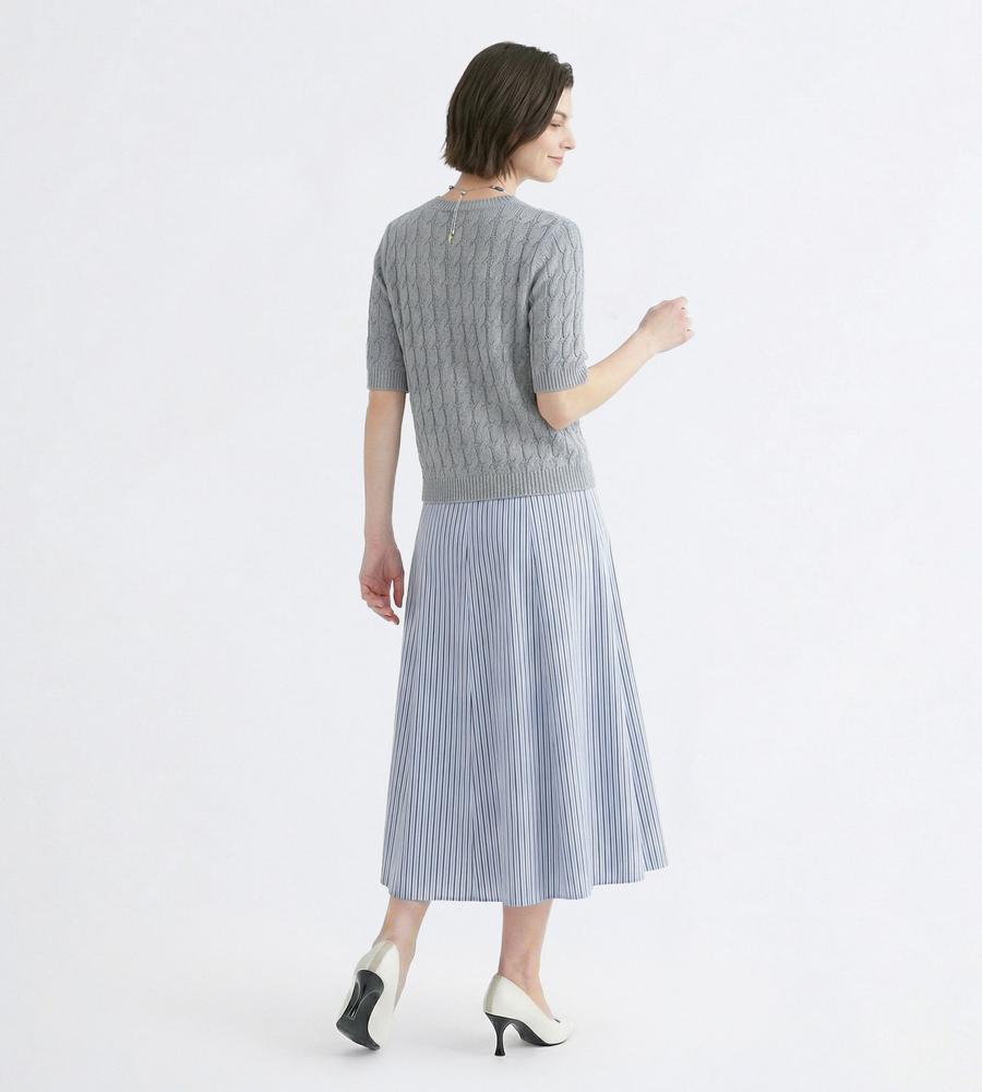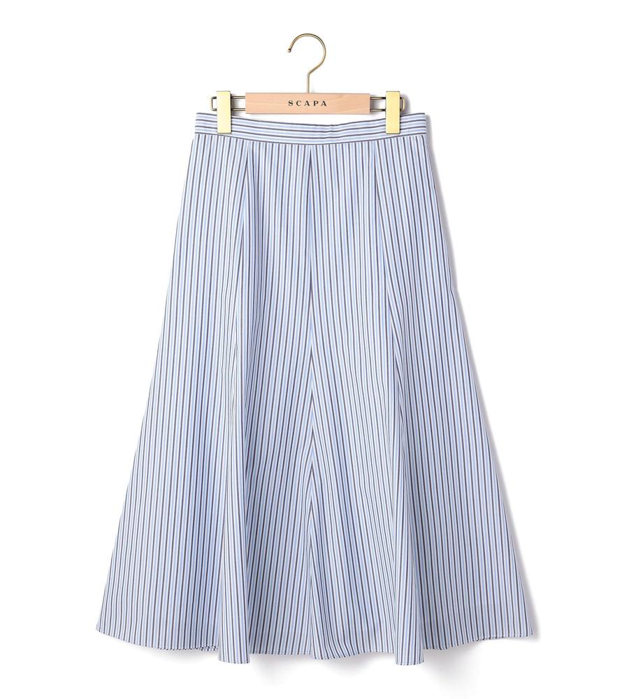 大人っぽく繊細な表情を醸すナローストライプ柄スカート。落ち感のあるフレアシルエットがボディラインをカバーしつつ、華やぎのある着こなしを叶えてくれます。