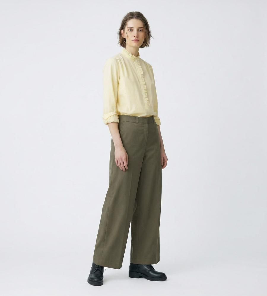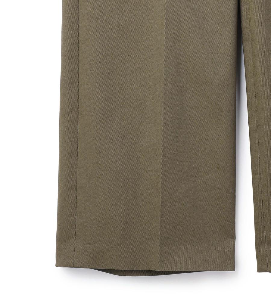 ベーシックなコットンチノパンツ。ややワイドなシルエットながら、センタープレスを施すことでレッグラインをすっきり見せてくれます。フラップ付きのヒップポケットなど、丁寧なつくりが品質の高さを物語る1本。合わせる着こなしを選ばない汎用性に優れたパンツは、ワードローブに必ず用意しておきたいアイテムです。