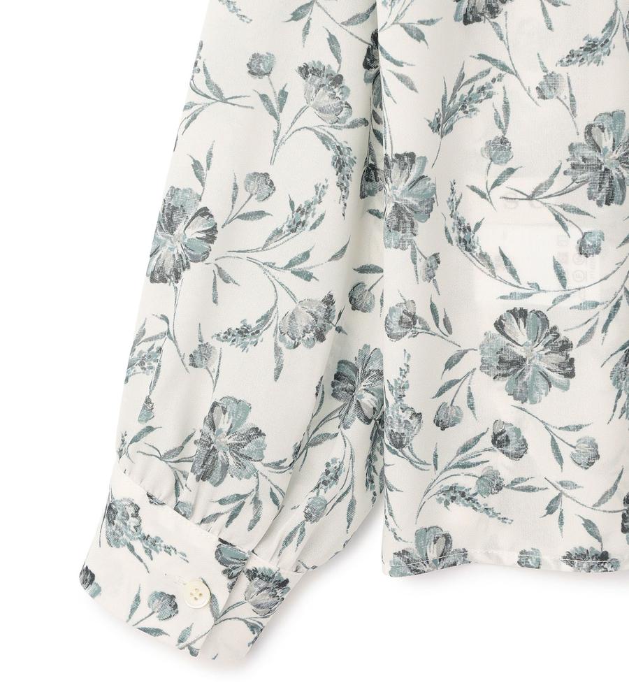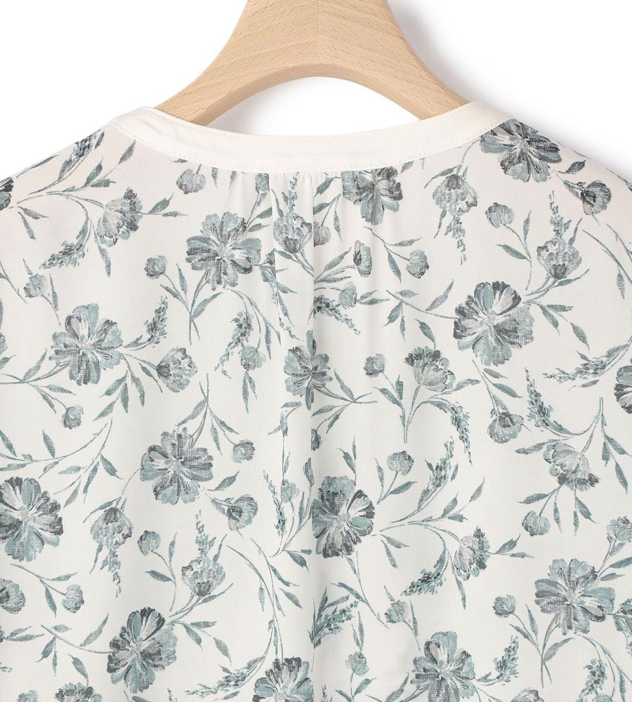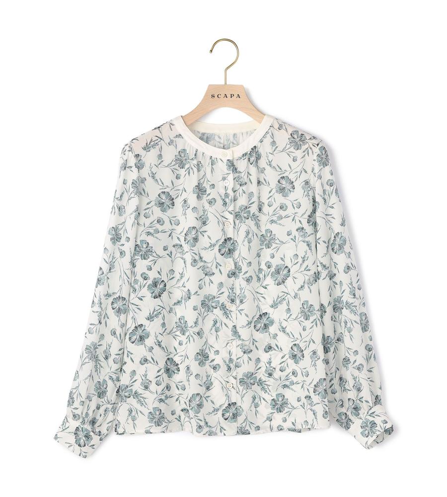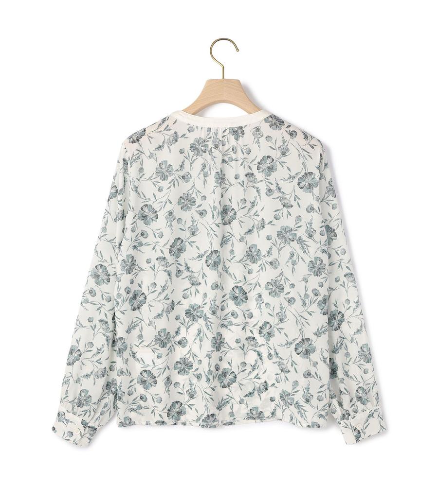 一枚で表情が華やぐフラワー柄ブラウス。硬くなりすぎずにフェミニンに着こなせるノーカラーデザインもポイントです。一枚ではもちろん、ジャケットインしてもバランス良く着こなせます。