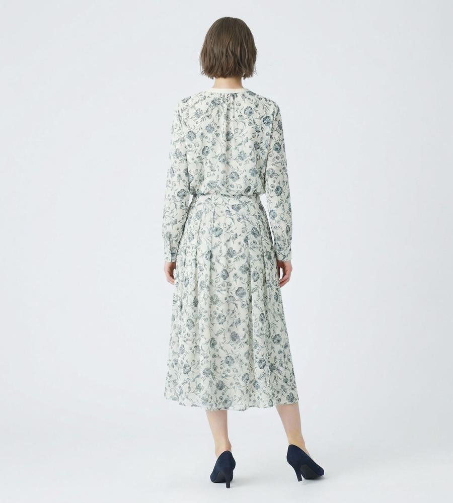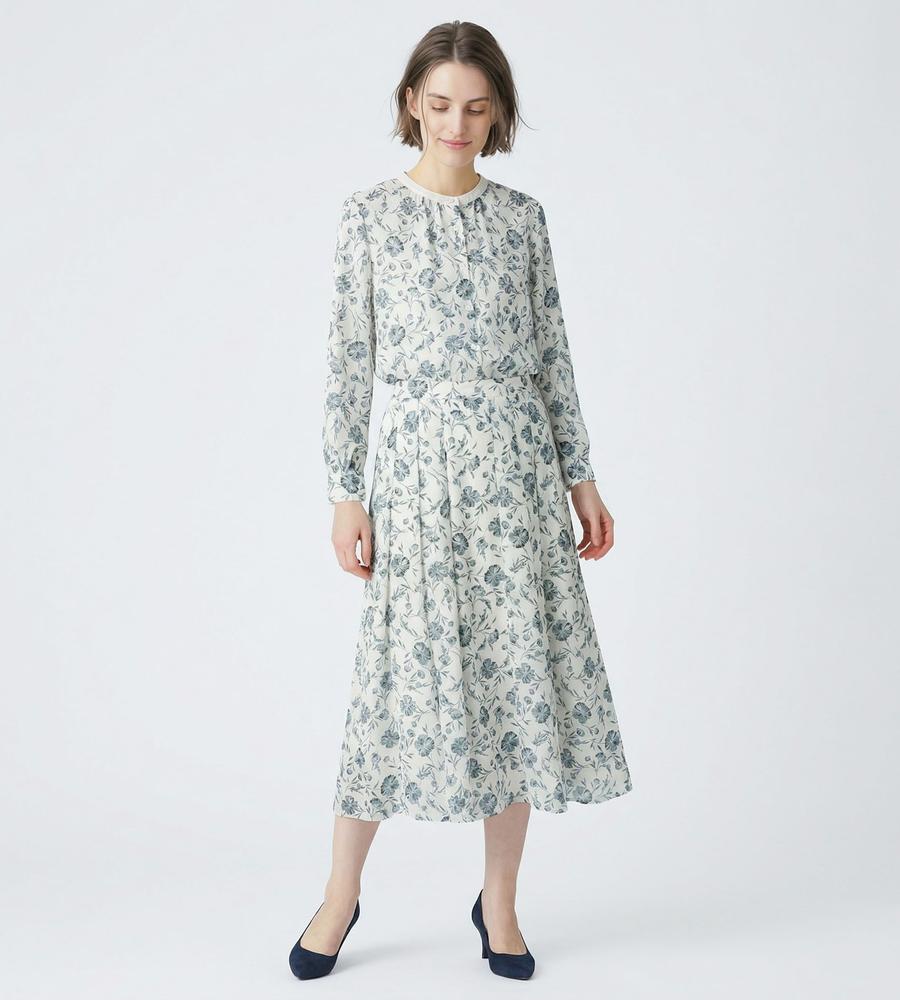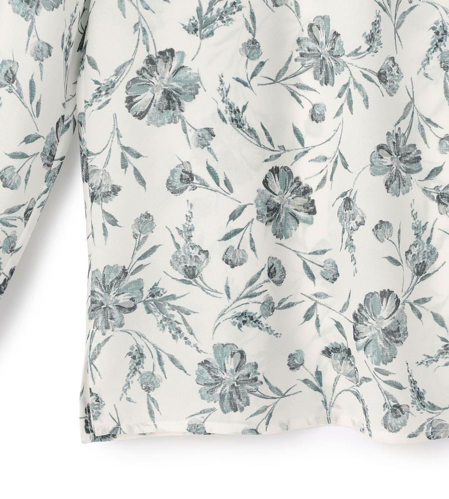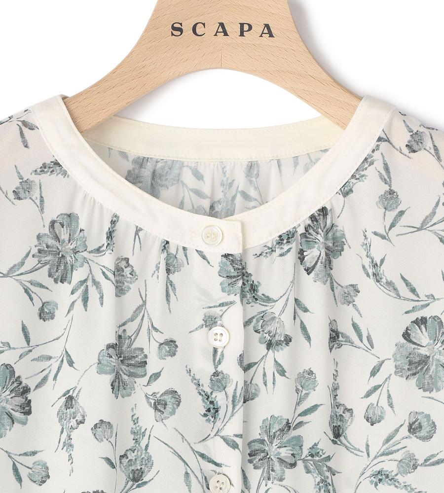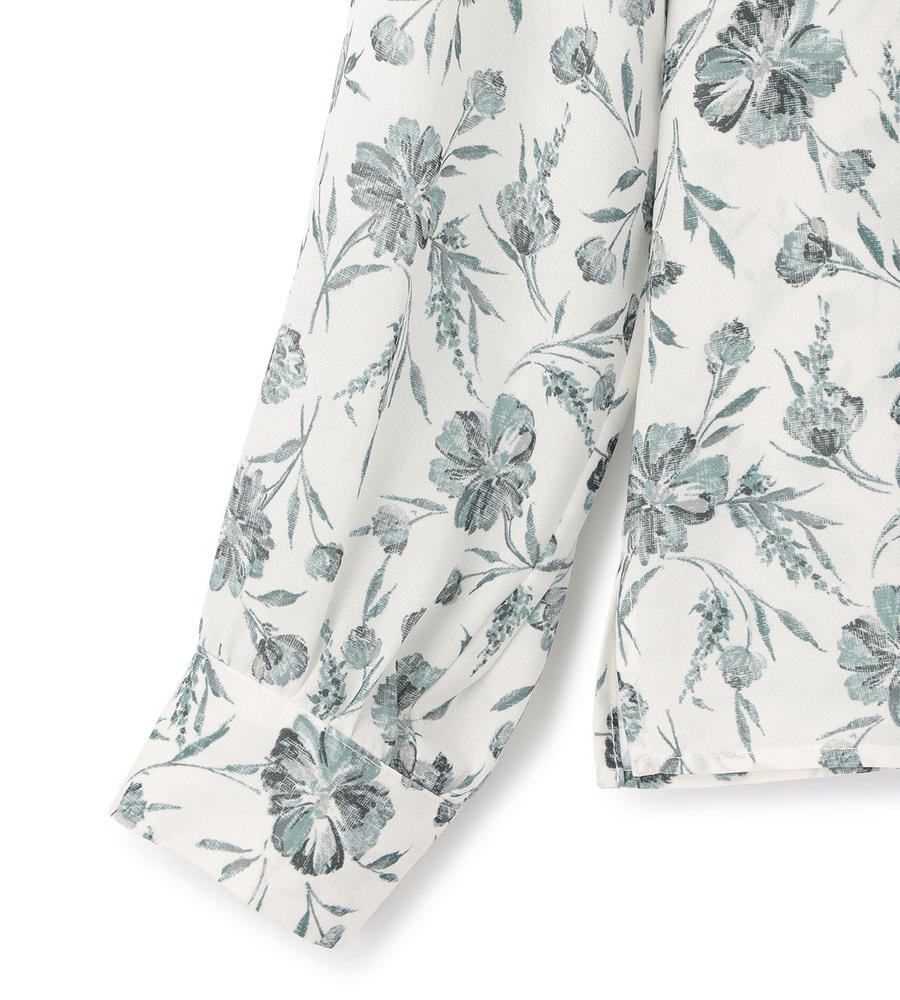 一枚で表情が華やぐフラワー柄ブラウス。硬くなりすぎずにフェミニンに着こなせるノーカラーデザインもポイントです。一枚ではもちろん、ジャケットインしてもバランス良く着こなせます。