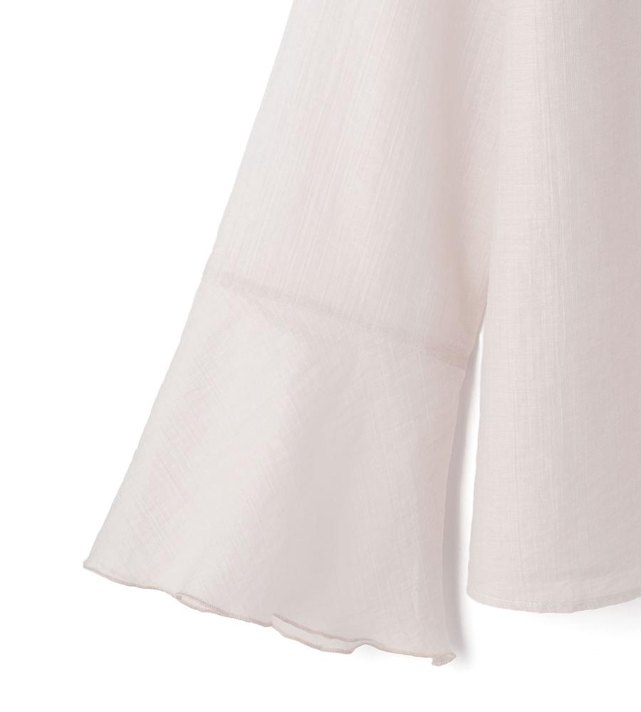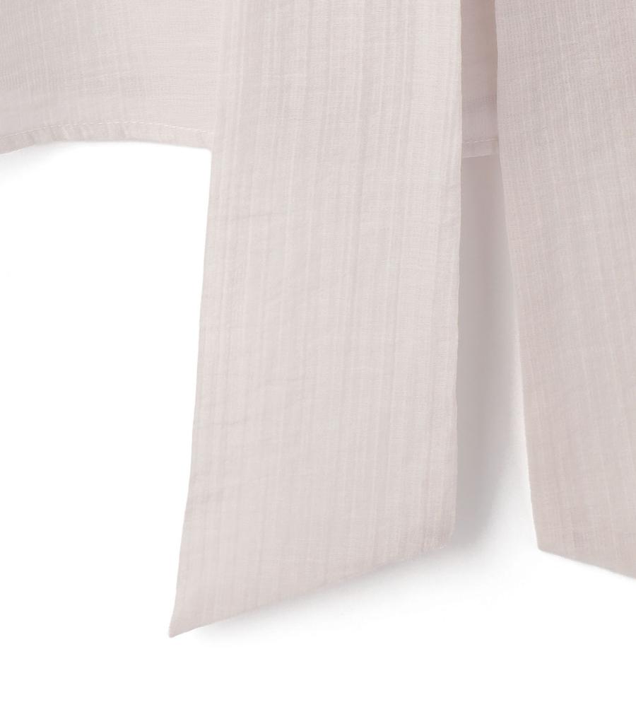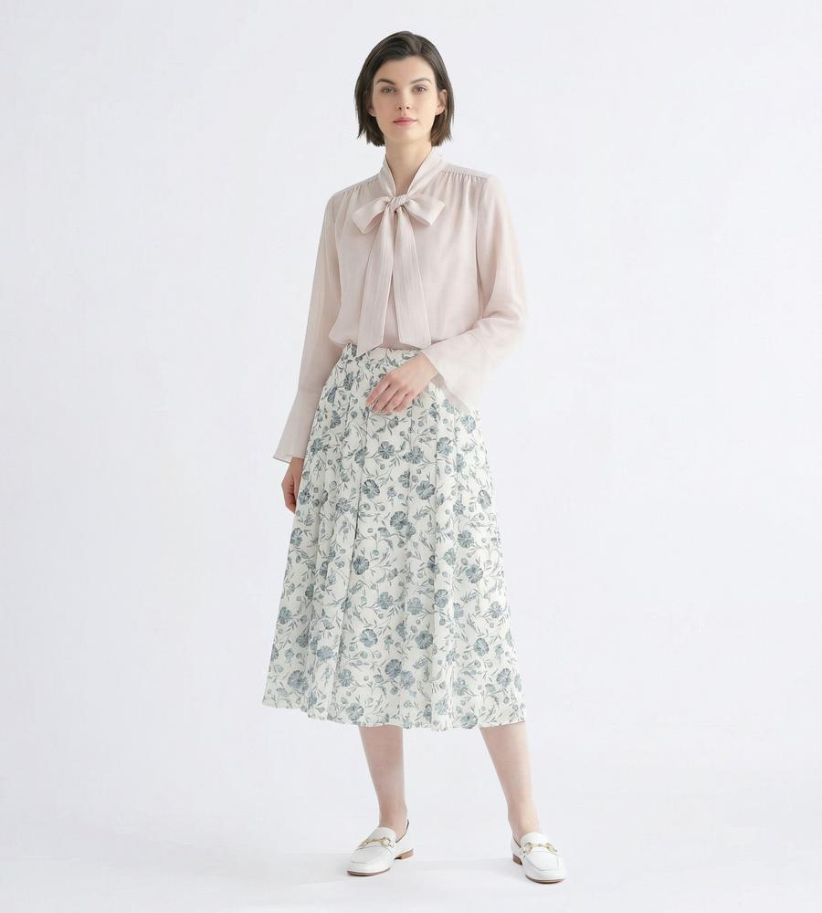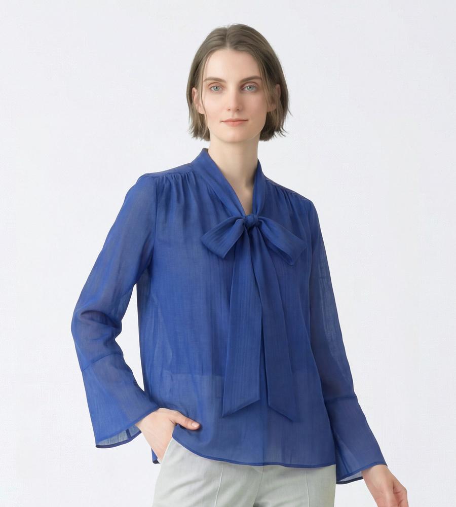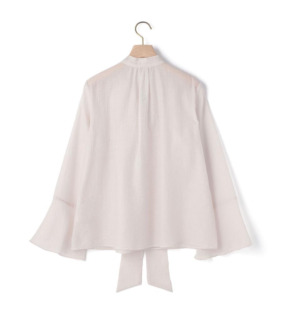 シアーな生地感がフェミニンなブラウス。落ち感のあるボウタイが、大人っぽい華やぎを演出するポイントに。フレア仕立てになった袖口も、モードな表情を楽しませてくれます。