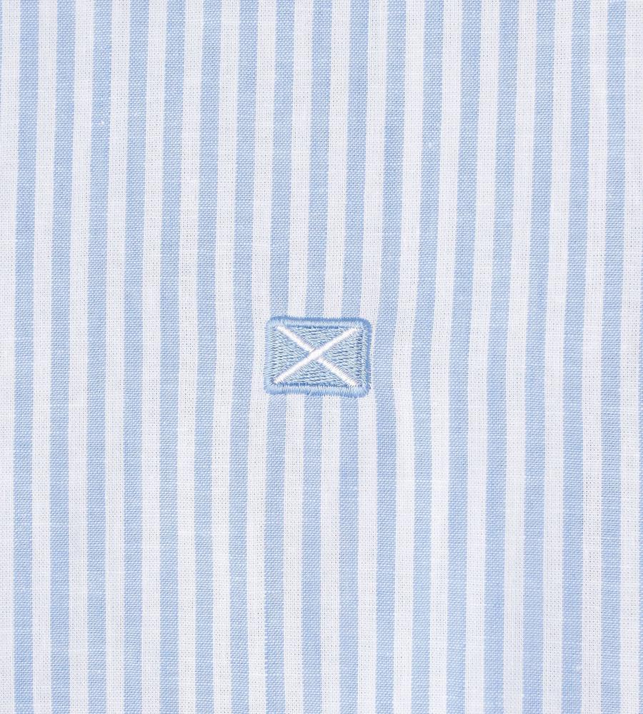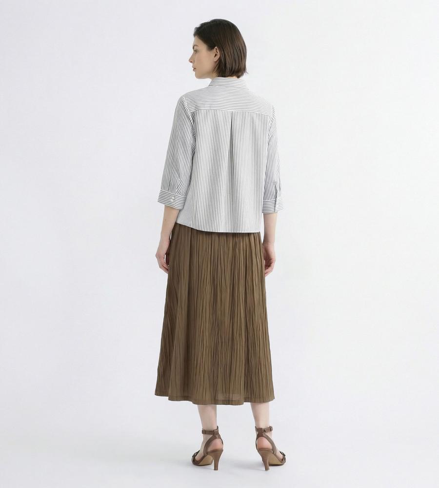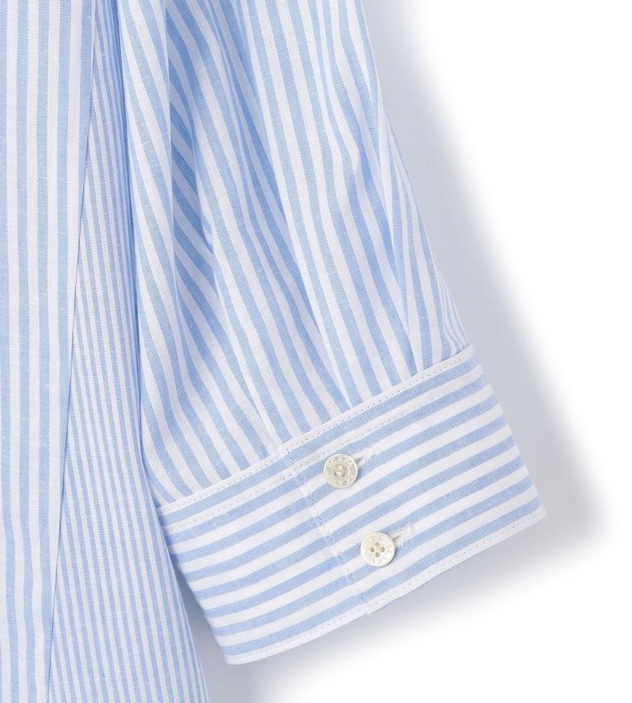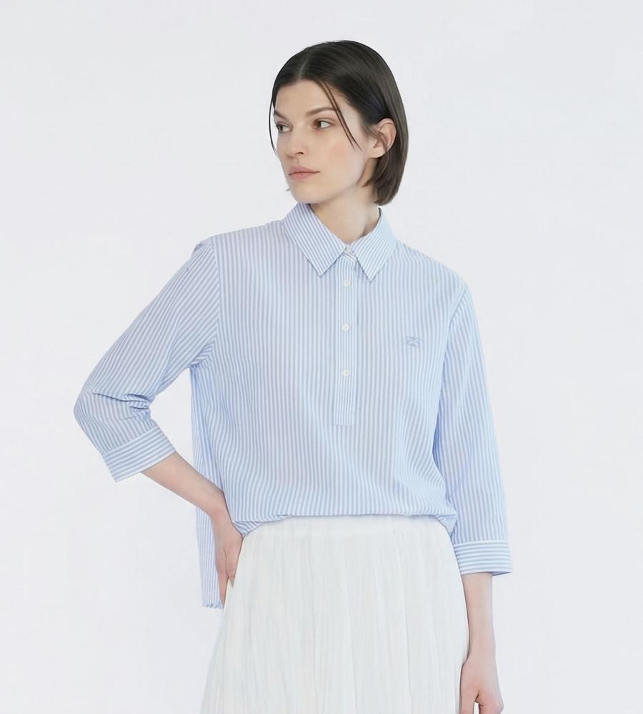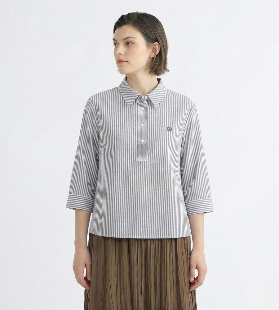 肌にさらっと心地よく着られるリネン100%素材のシャツです。これからの季節にぴったりの爽やかなストライプ柄、手首がのぞく7分袖でロングシーズンお使いいただけます。ハーフボタンがトレンド顔な着こなしをかなえてくれるポイント、きれいめとカジュアルのどちらにも着まわせる欲張りなアイテムです。