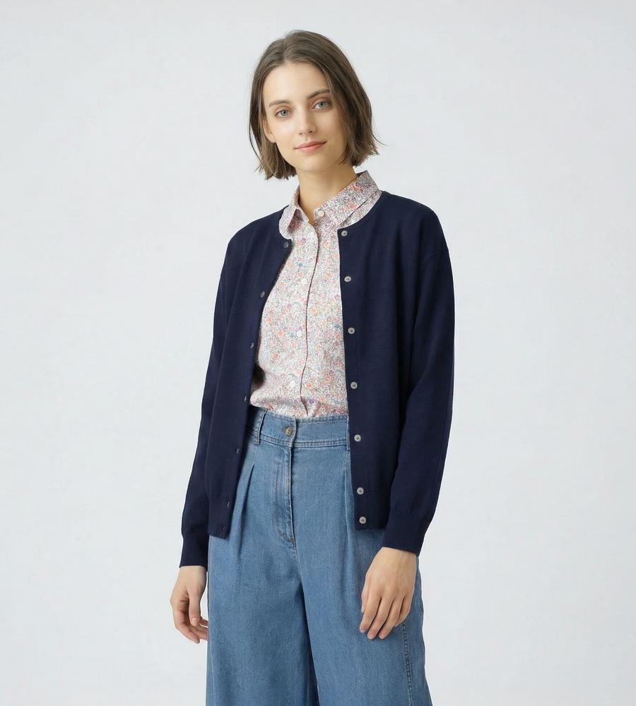 上品なハイゲージニットを使用したカーディガン。ほど良いゆとりのあるシルエットは、少し肌寒いときの羽織りにも最適です。クールなメタリックボタンが、着こなしを引き締めるポイントに。