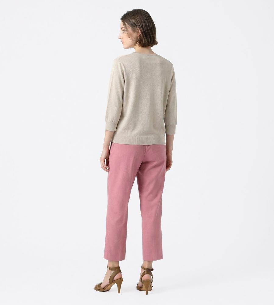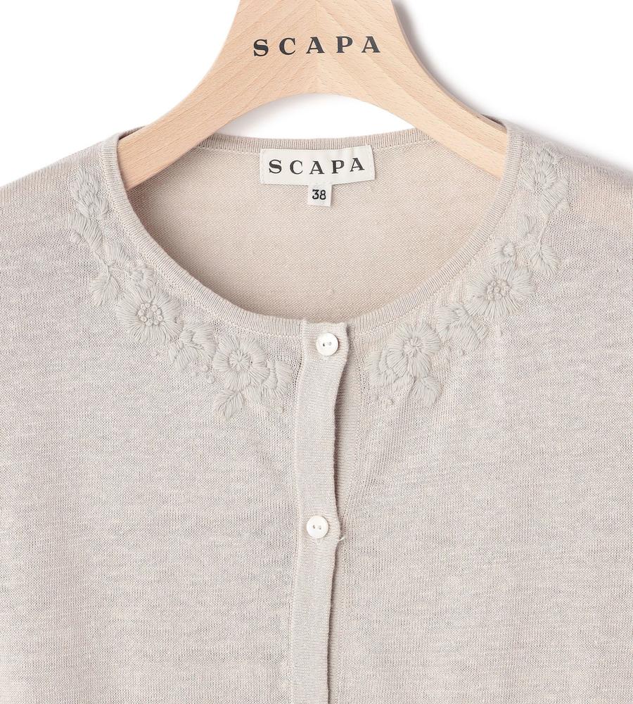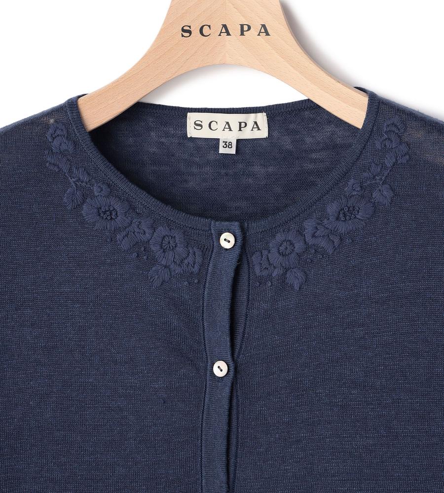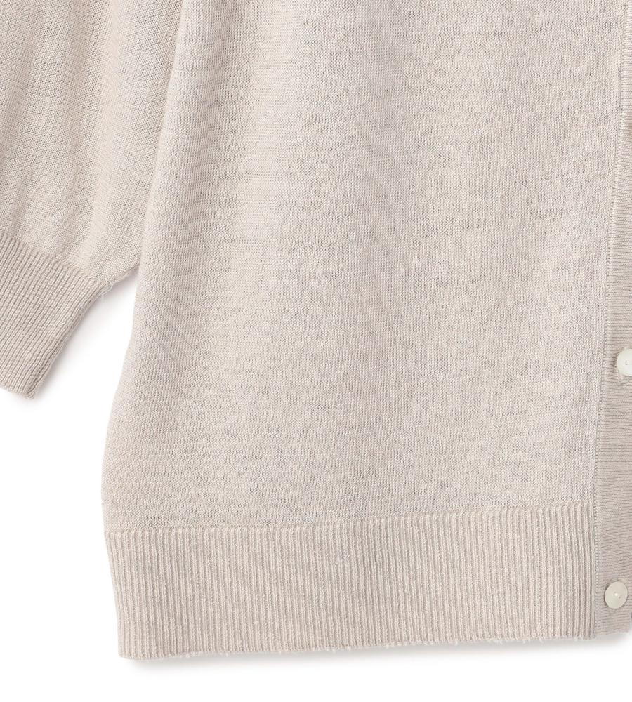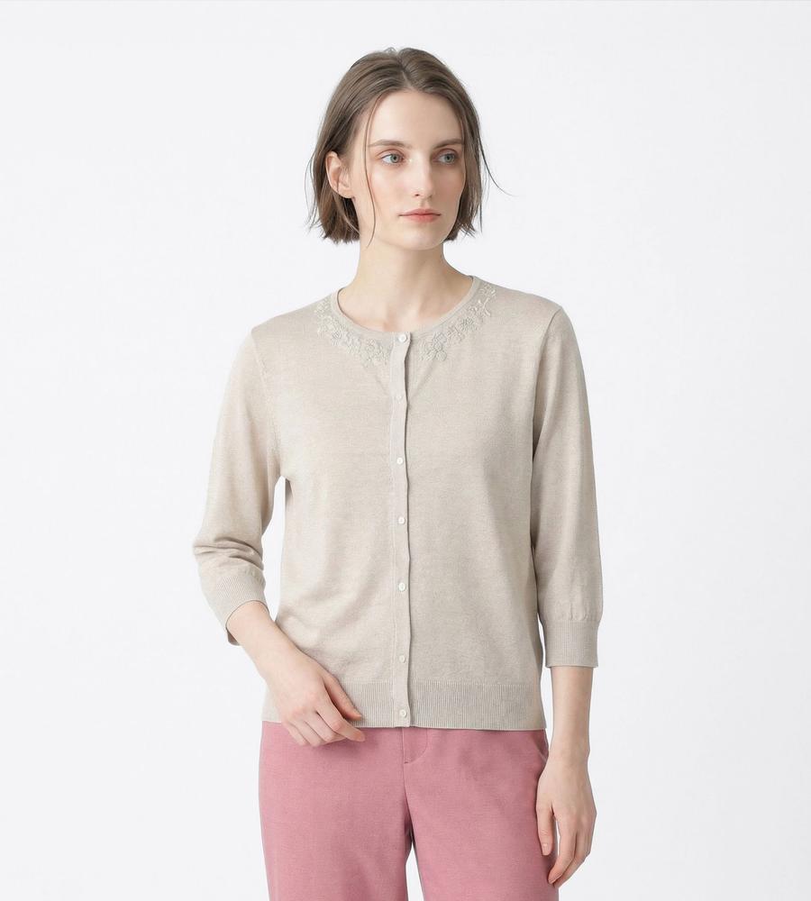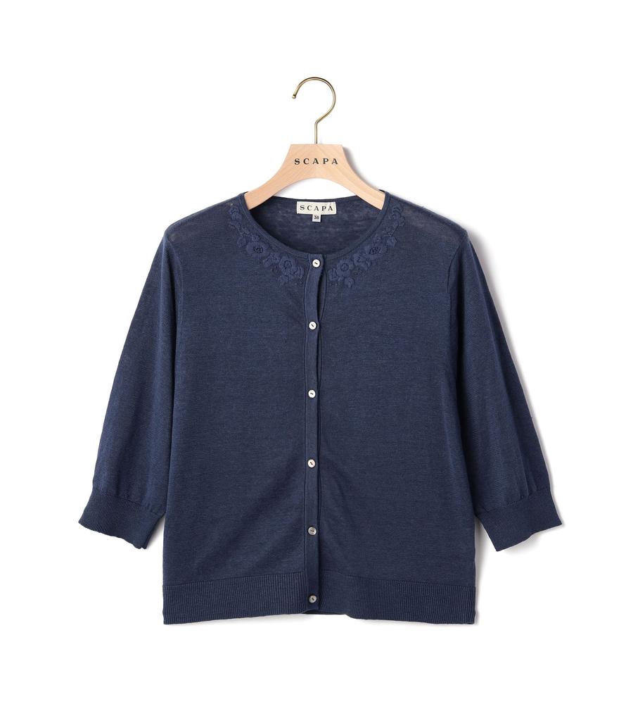 ネックラインに沿って刺しゅうの花を咲かせたカーディガン。綿糸ならではのナチュラルな膨らみが、優しげな女性像を描き出します。身頃は麻100%ニットを使用しており、ほんのり透け感のある仕上がり。さらりとしたドライな肌触りで、日よけや空調対策にもおすすめです。袖も7分丈にして軽やかさを演出しました。