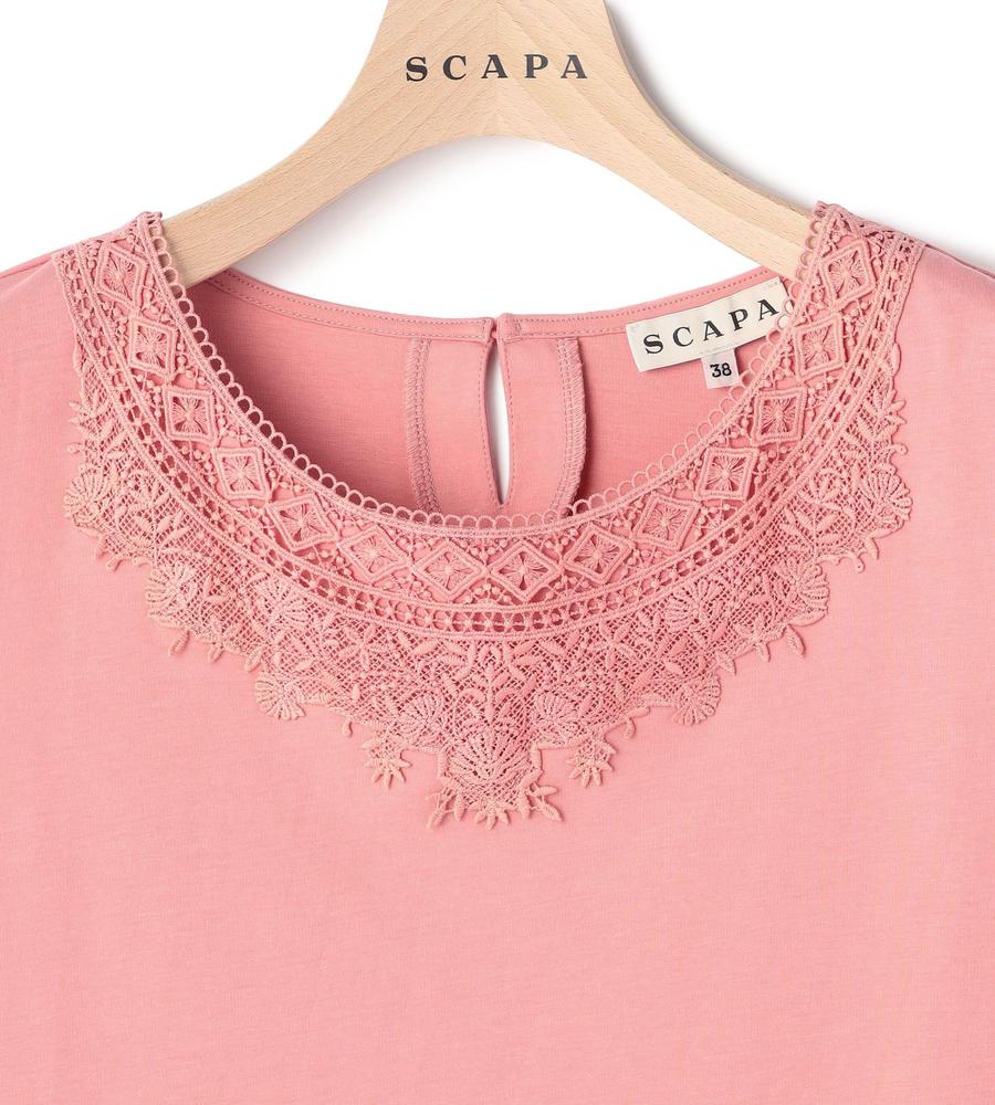 レース使いが華やかなカットソー。広めのラウンドネックでデコルテをきれいに見せる一方、アームホールはコンパクトにつめて1枚でも着やすく調整しています。綿100%のジャージー素材を使用しており、柔らかくやさしい着心地。あらゆるボトムスに合わせやすく、カジュアルにもエレガントにも着こなせます。