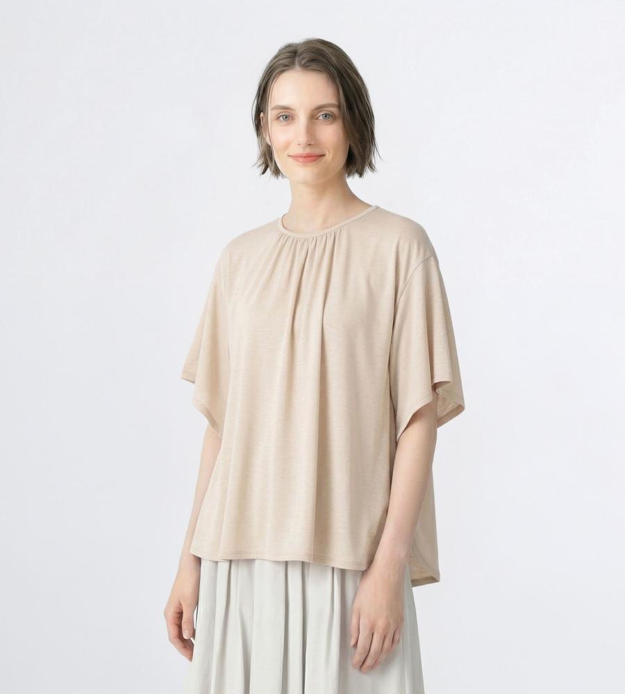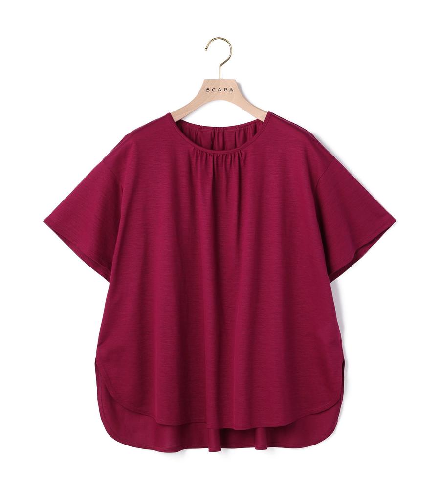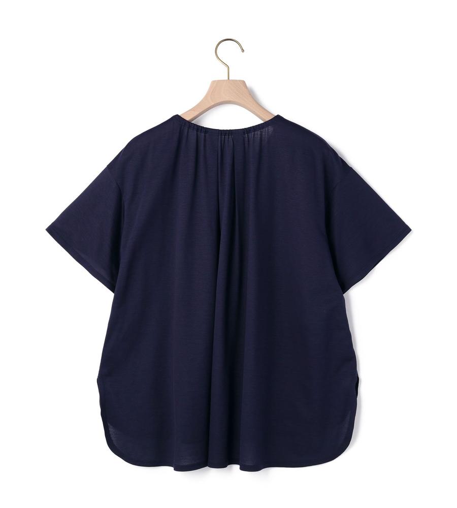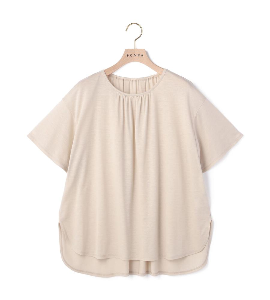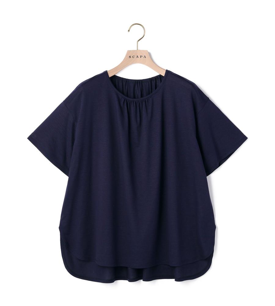 シルエットにふんわり丸みを持たせた、ゆったりと着られるプルオーバーカットソーです。前側の衿元はもちろん背中側の衿にもよせたギャザーが、アイテム全体に立体感のあるドレープを作ります。裾は前後差を付けたデザインでそのまま着流しても、フロントだけINして後ろを出したスタイリングもおすすめです。