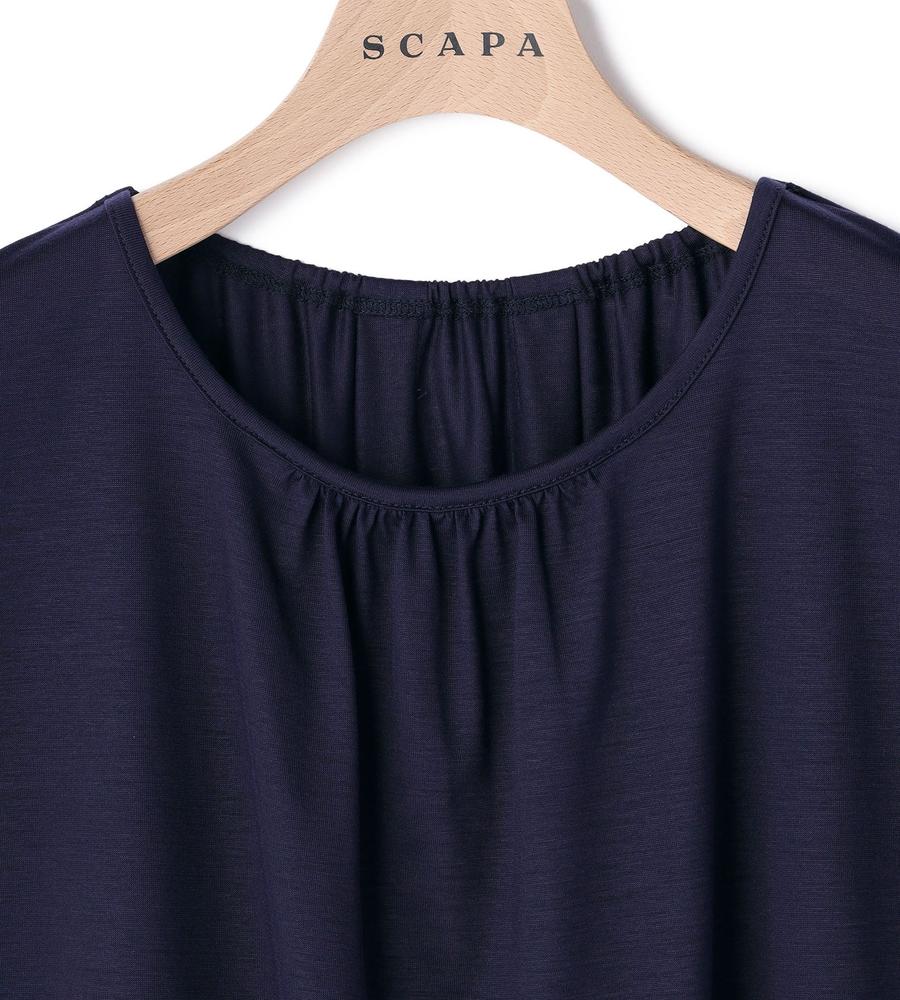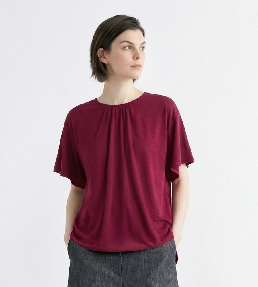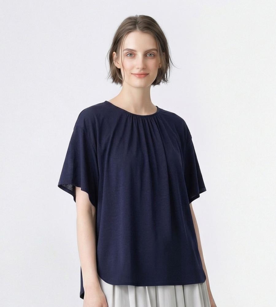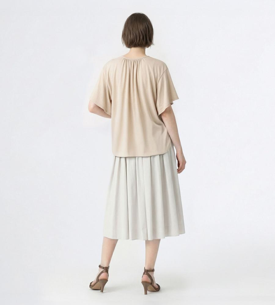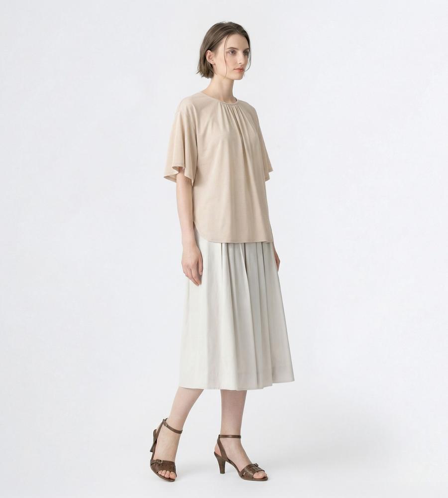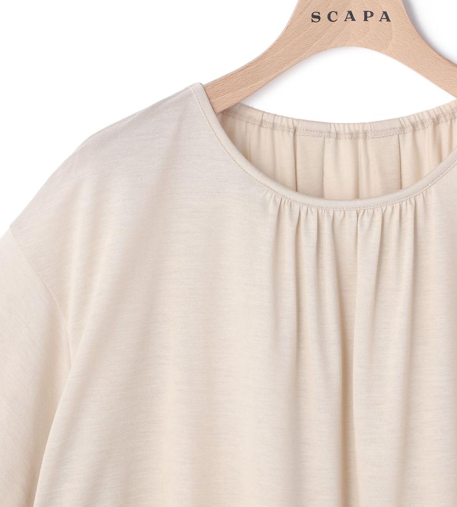 シルエットにふんわり丸みを持たせた、ゆったりと着られるプルオーバーカットソーです。前側の衿元はもちろん背中側の衿にもよせたギャザーが、アイテム全体に立体感のあるドレープを作ります。裾は前後差を付けたデザインでそのまま着流しても、フロントだけINして後ろを出したスタイリングもおすすめです。