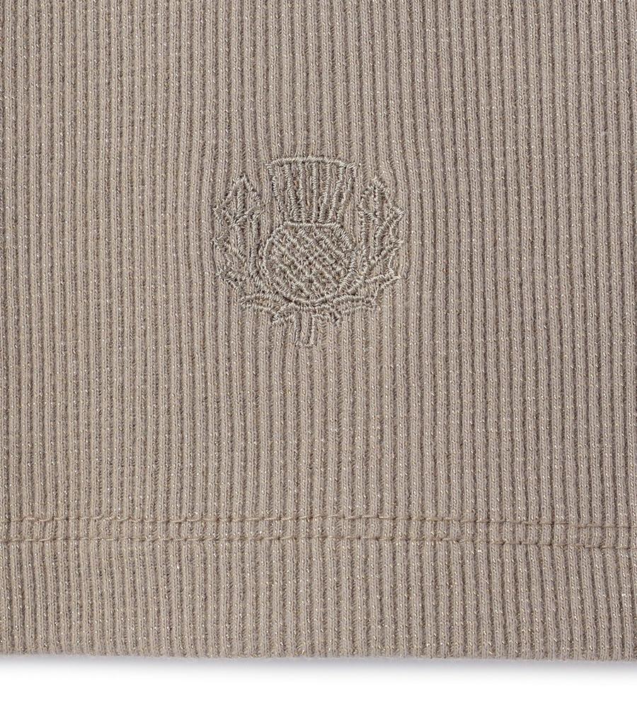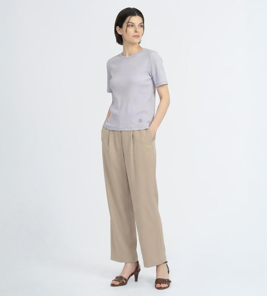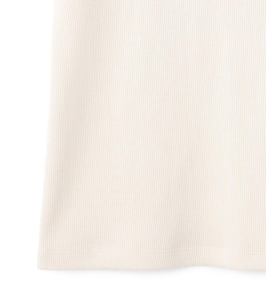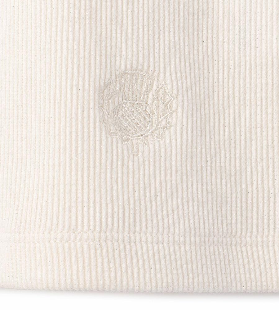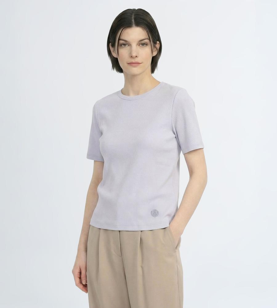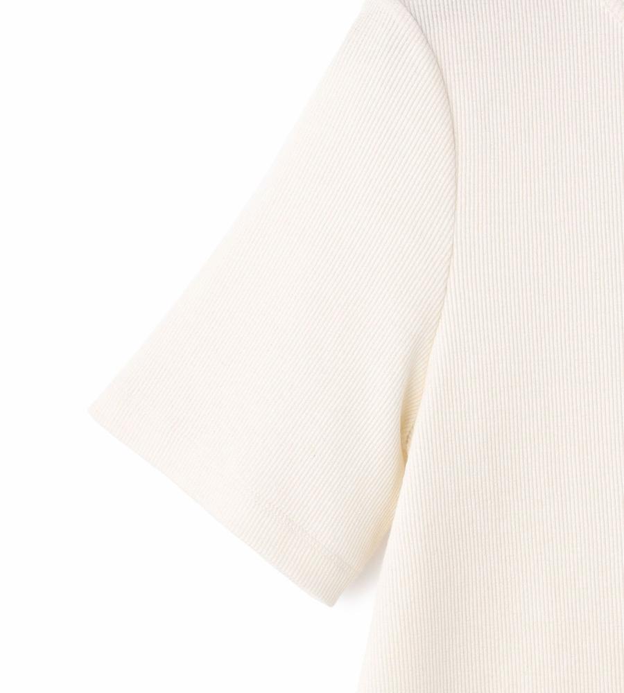 ストレッチ性に優れた柔らかな着心地がうれしい、テレコ素材で仕上げた半袖カットソーです。縦ラインを強調する編み地で細見え効果が狙えるのがポイント、裾にはさりげなくブランドロゴ刺繍をあしらいました。1枚で着るのはもちろんインナーとしても着まわし度抜群、色違いでそろえたくなるアイテムです。