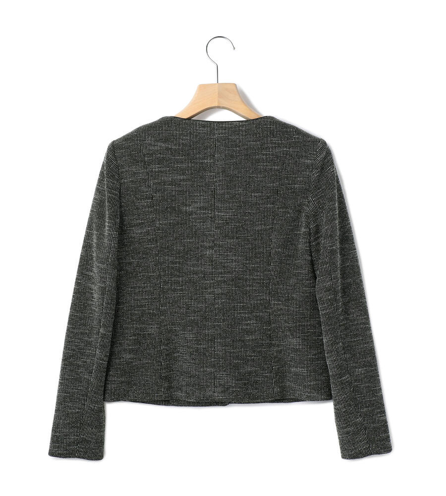 品の良い光沢がエレガントなムードを添えるファンシーツィード素材で仕立てたノーカラージャケット。前開きはボタンが見えない仕様ですっきりとした印象。首もとのVラインがさりげなく抜け感をプラス。コンパクトなシルエットがコーディネートに合わせやすく、さらりと羽織るだけでサマになるアイテム。