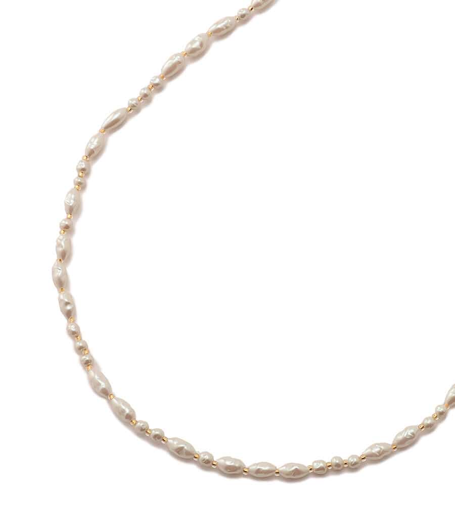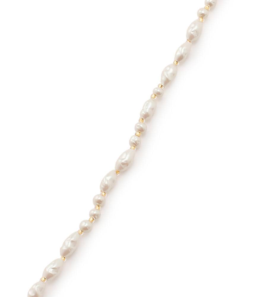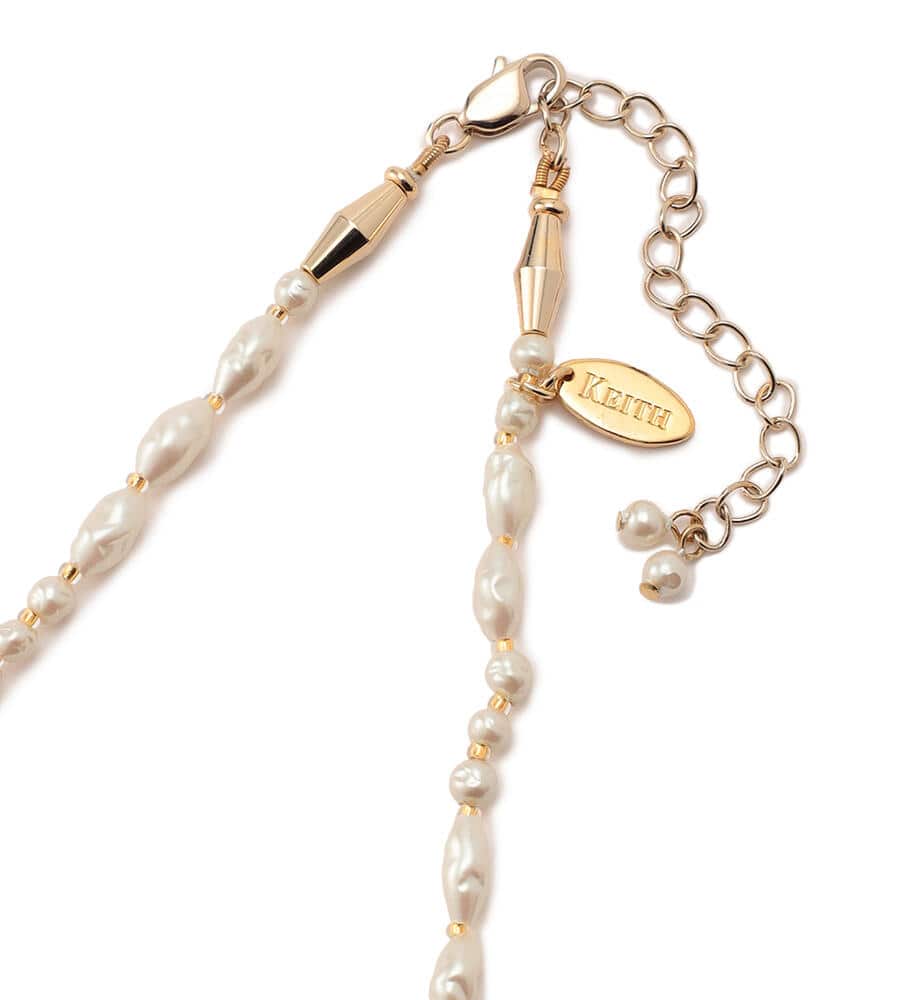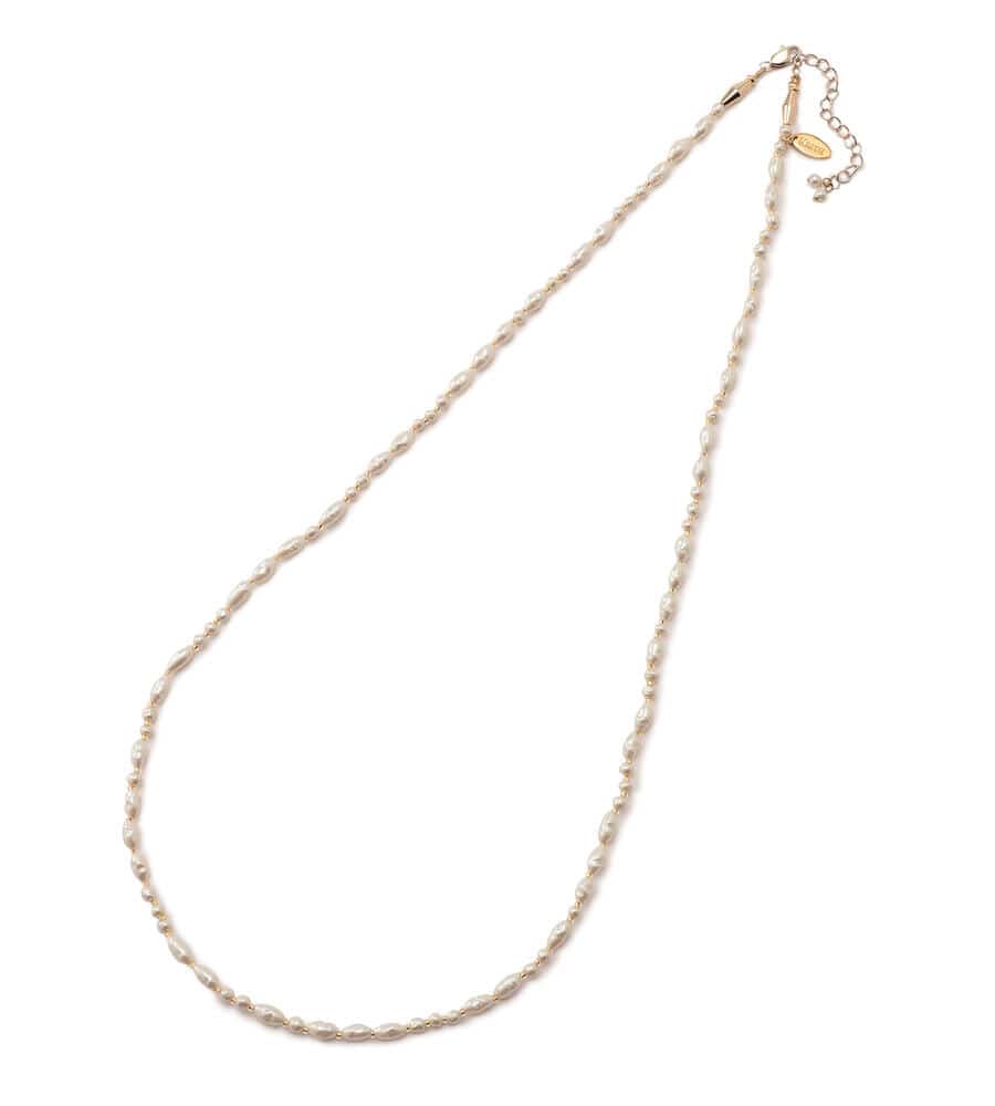 パールとゴールドのマッチングがエレガントなネックレス。形とサイズの異なるパールを組み合わせた、フェミニンなムードのデザイン。ブランドタグのワンポイントがさりげなくおしゃれなポイント。コーディネートを選ばず合わせやすいシンプルなデザイン。着こなしのスタイリッシュなアクセントになるアイテムです。